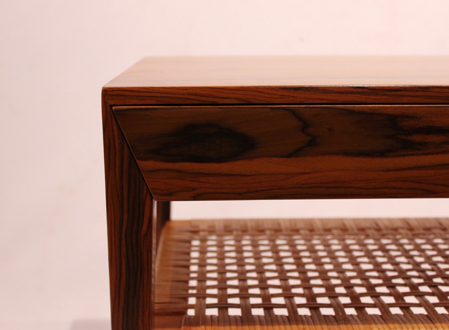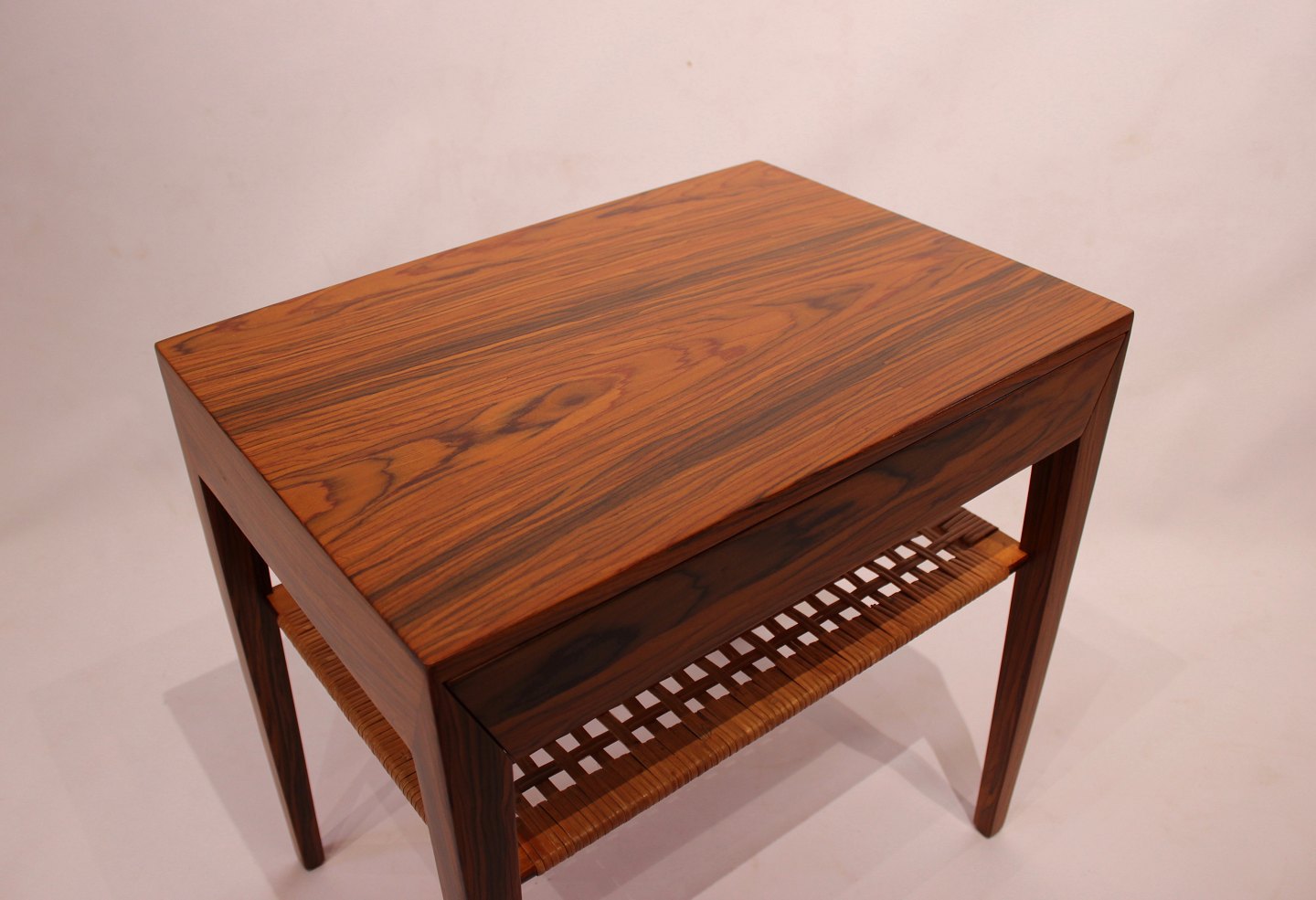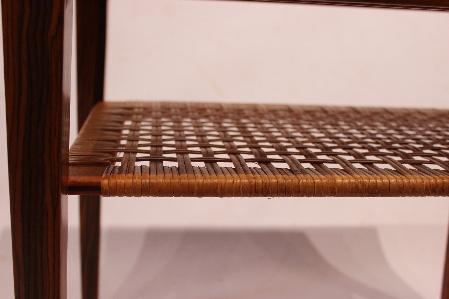 SoldA set of bedside tables in rosewood and papercord shelf designed by Severin Hansen and manufactured by Haslev furniture factory in the 1960s. The tables are in great vintage condition.