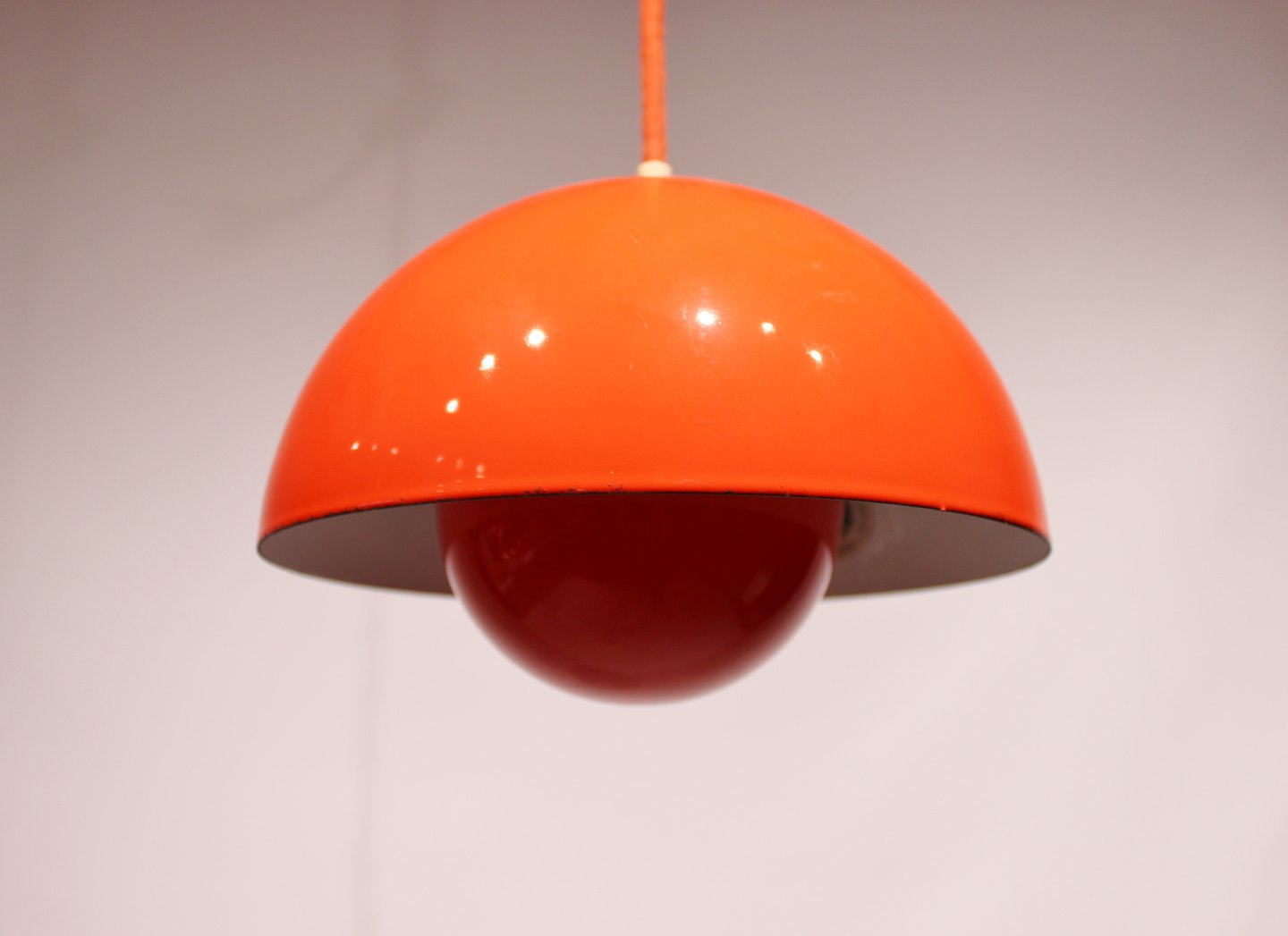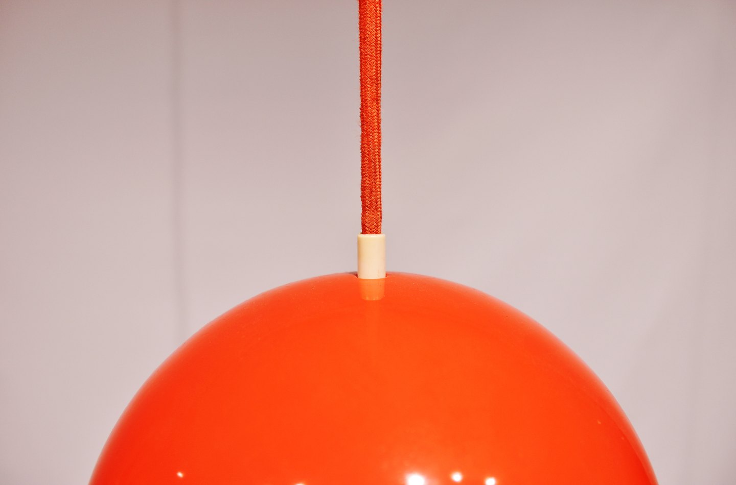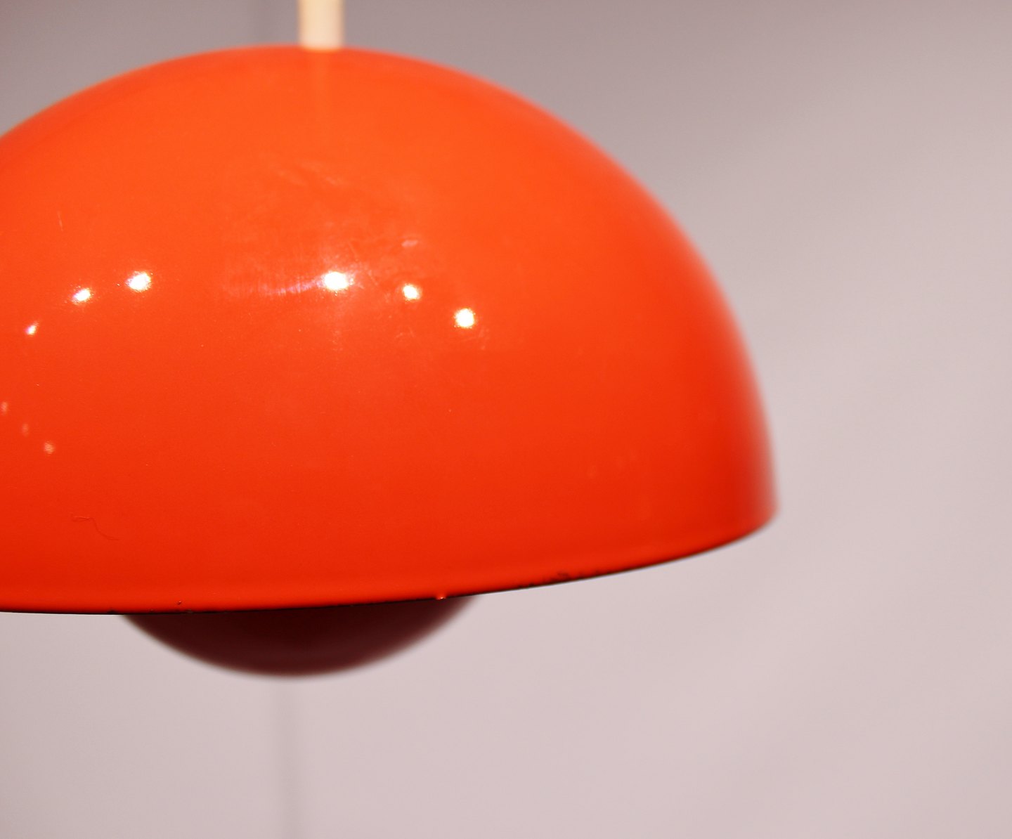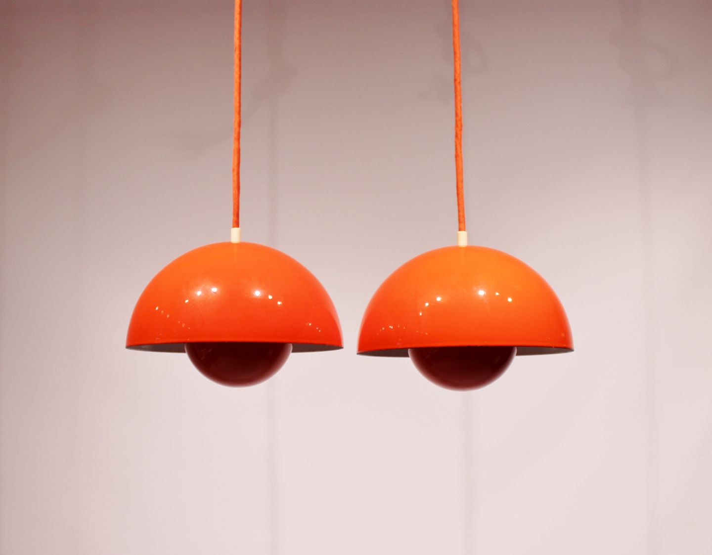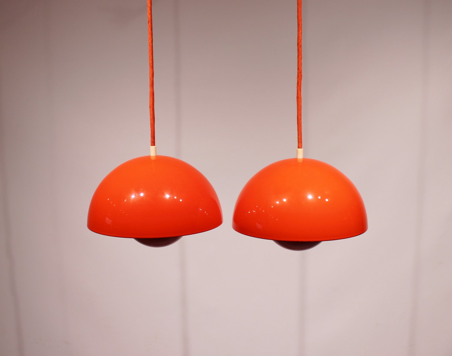 A pair of Flowerpot, model VP1, pendants in orange designed by Verner Panton in 1968 and manufactured in the 1970s.