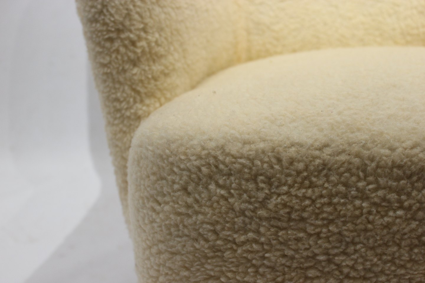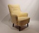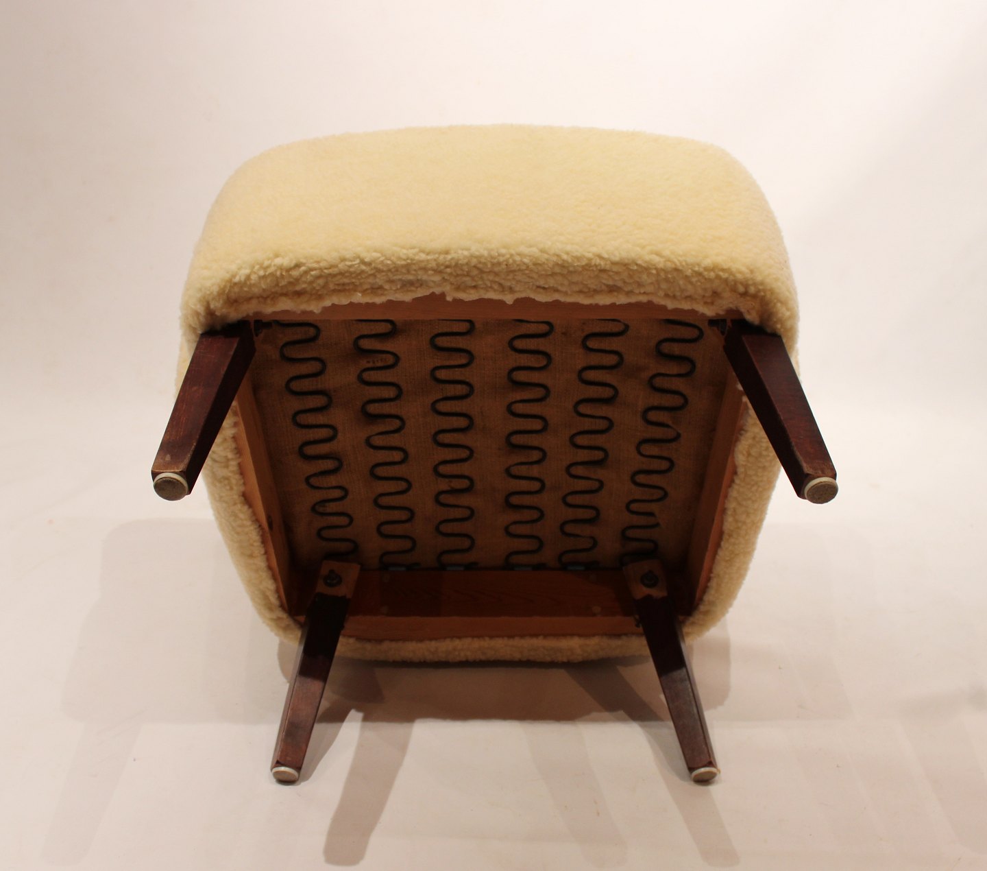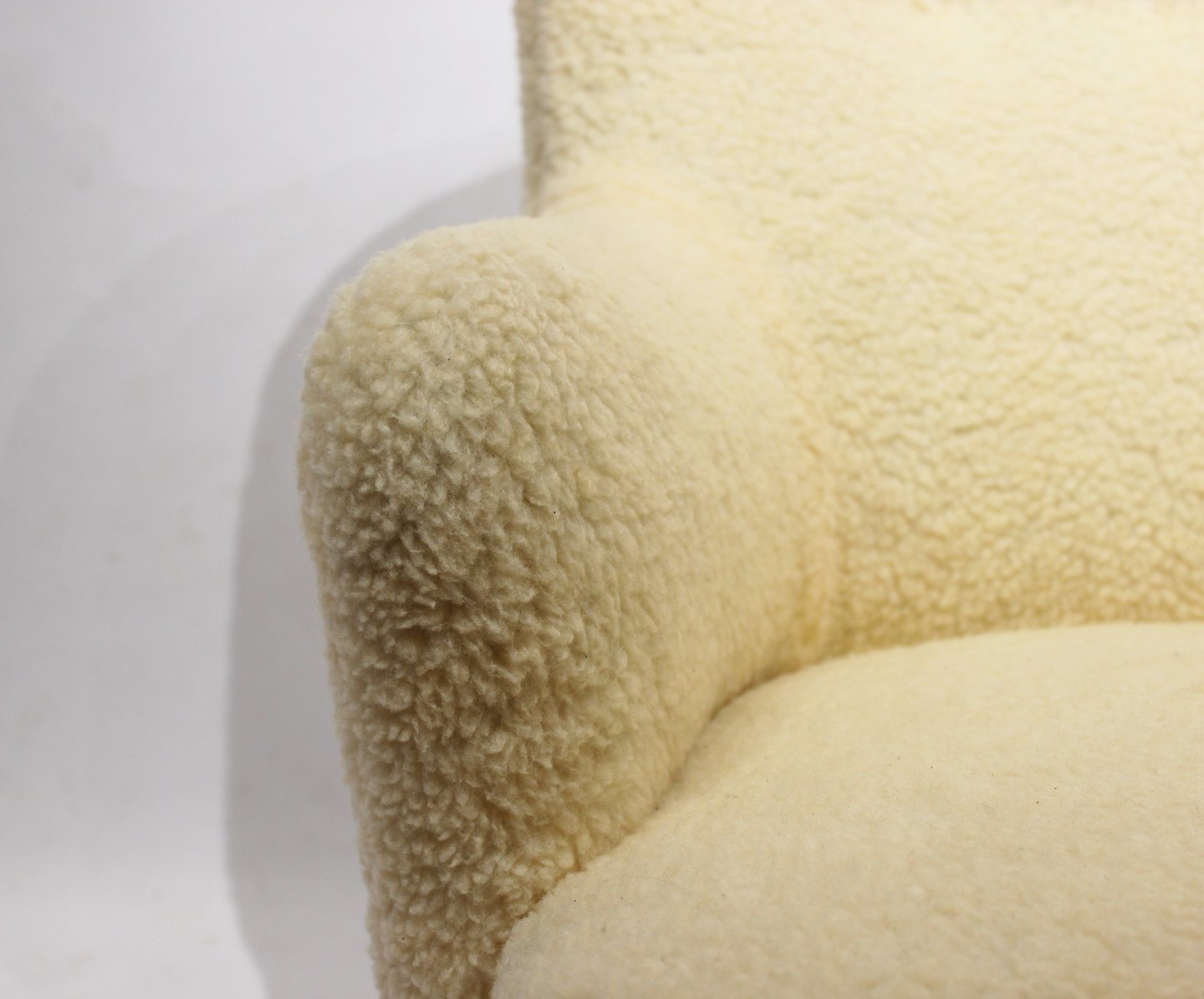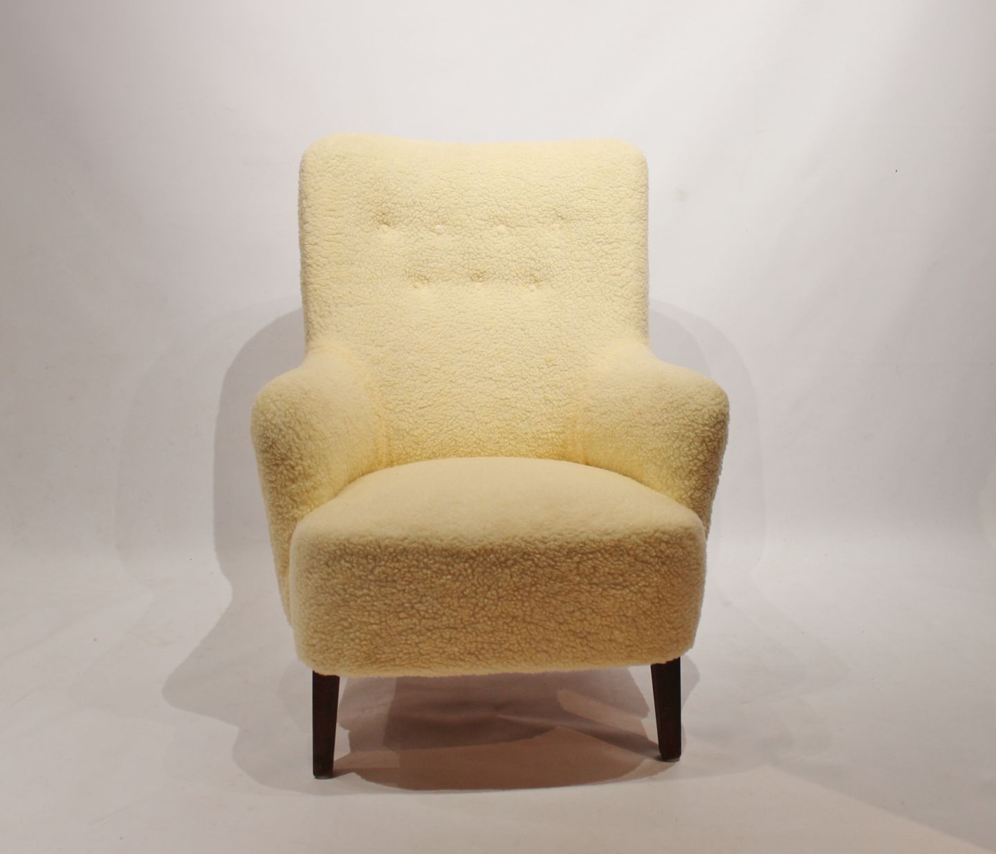 Easy chair upholstered with sheep wool and legs of mahogany from the 1940s. The chair is in great vintage condition.