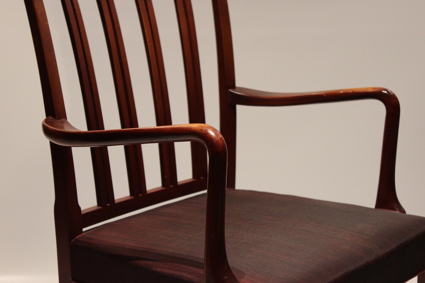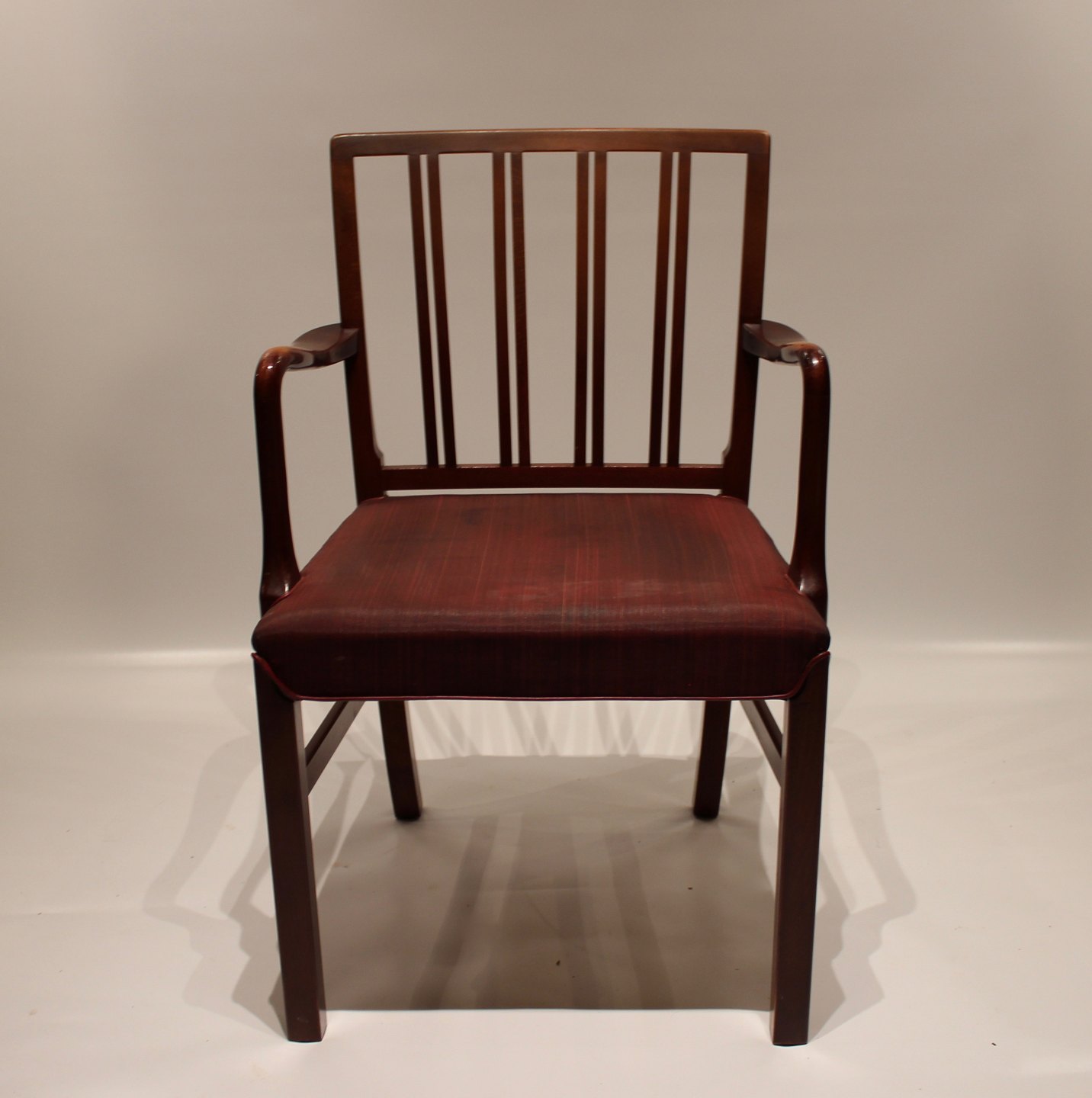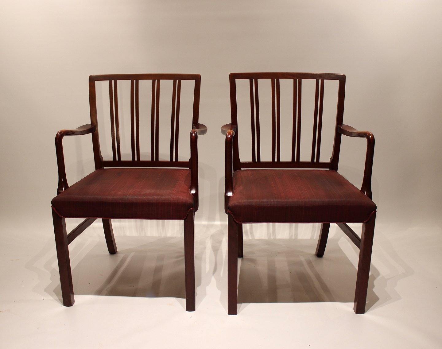 These armchairs exude timeless elegance and sophistication, with their mahogany wood construction and red fabric upholstery. They were designed by the iconic Danish furniture designer Fritz Hansen in the 1930s and are a true masterpiece of Danish furniture design.