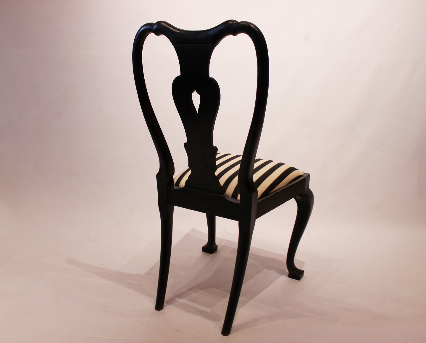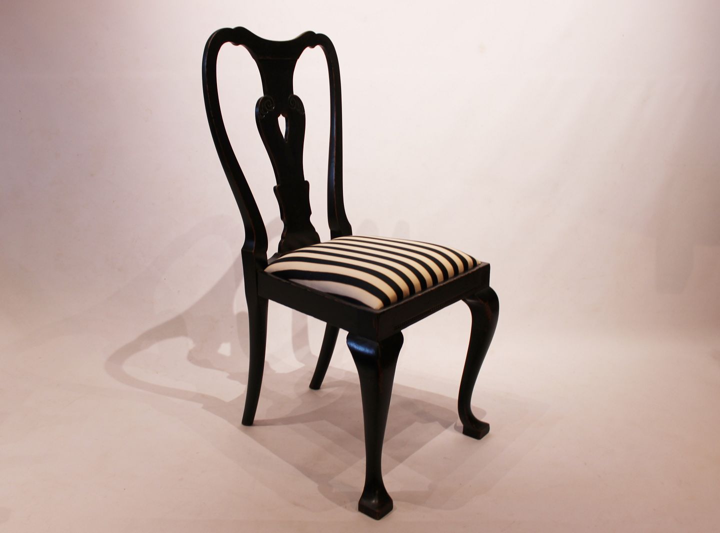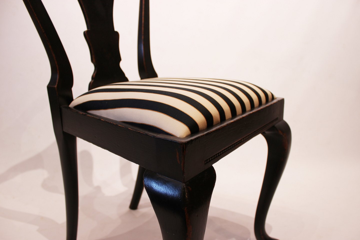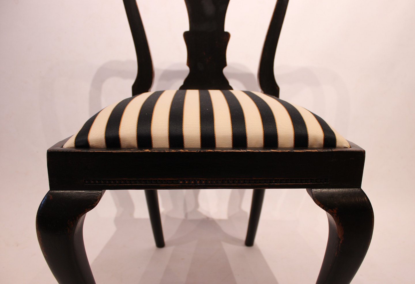 Black painted dining chair in the style of Rococo from the 1860s. The chair is in great vintage condition and with striped upholstery.