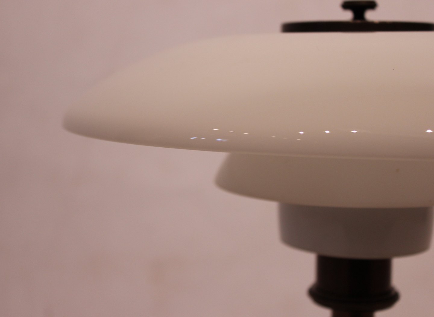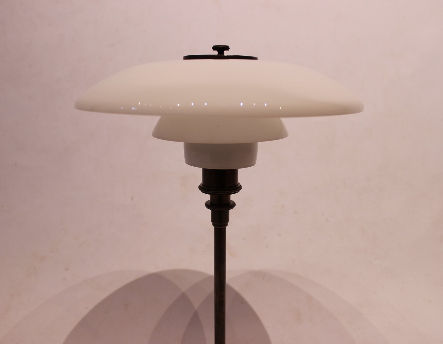 Please contact us for price informationPH 3/2 tablelamp, model Treph, of white opaline glass and frame of burnished brass originally designed by Poul Henningsen and manufactured by Louis Poulsen as an anniversary model in occasion of Poul Henningsen's 100 birthday in 1994.