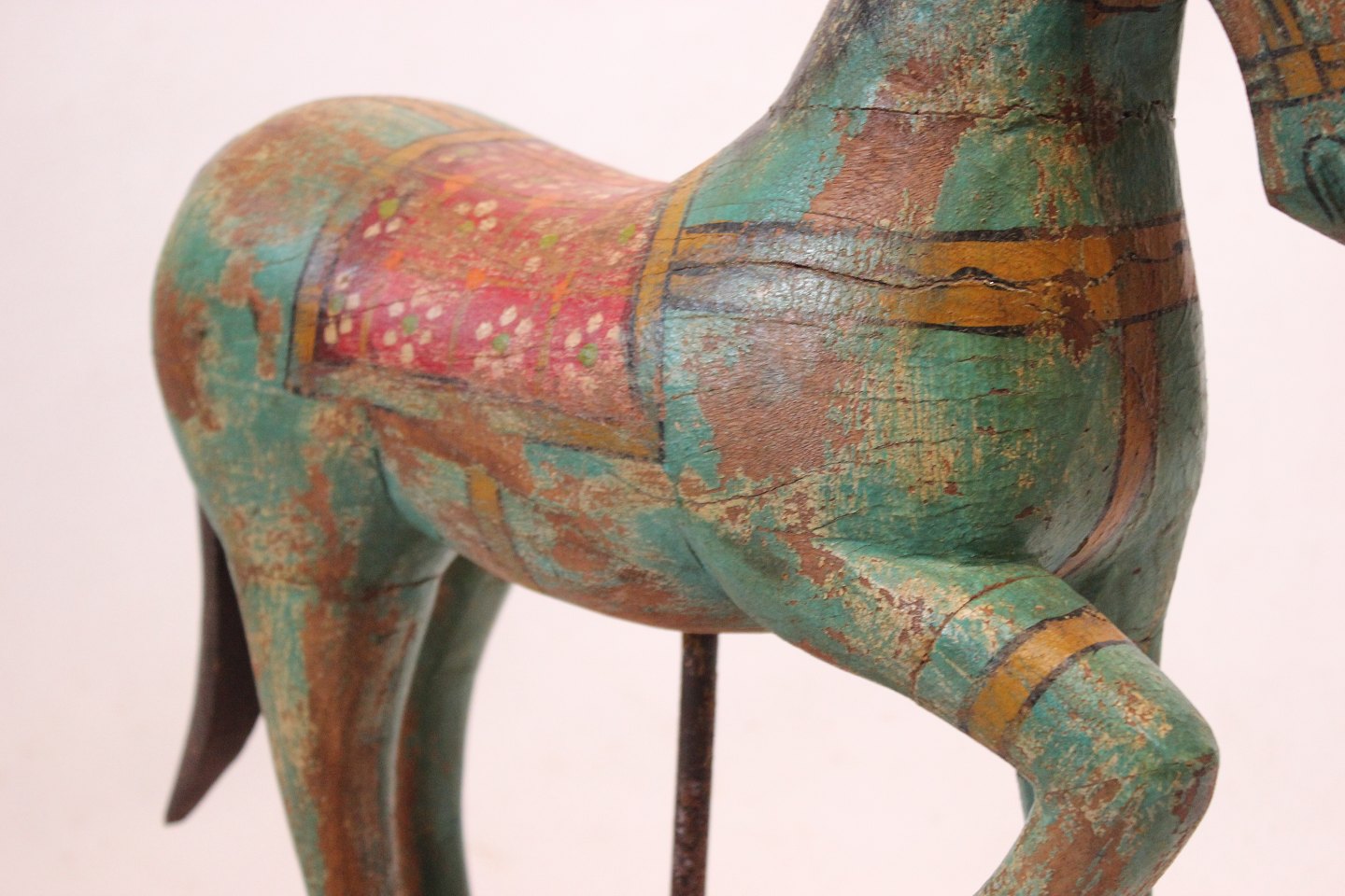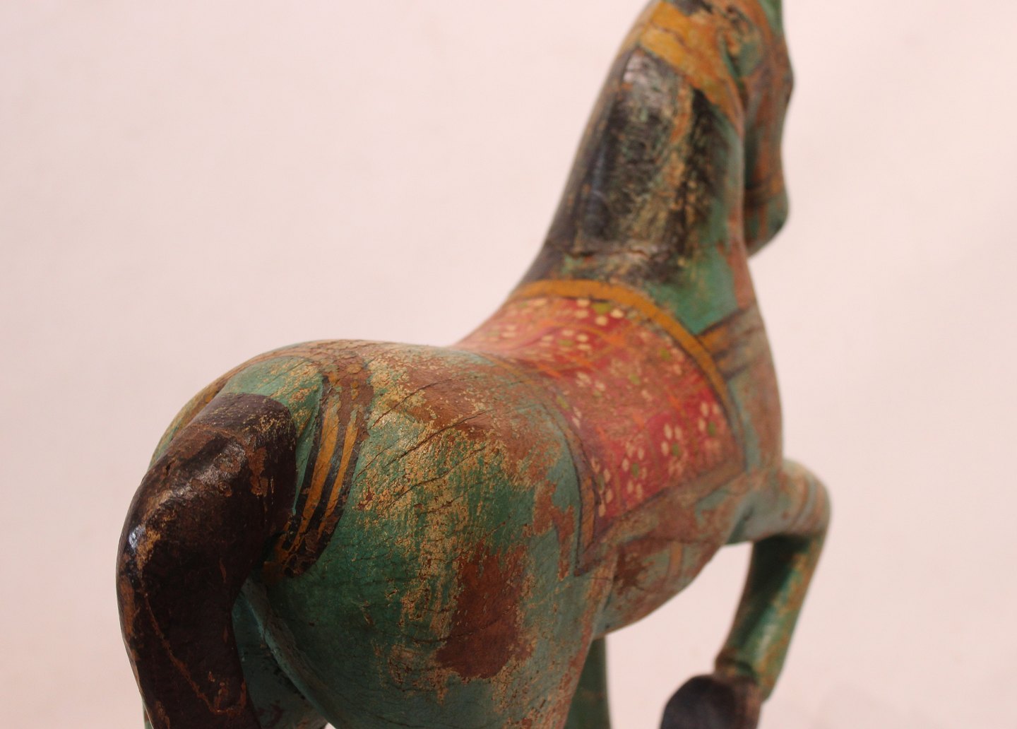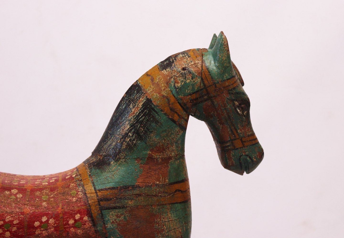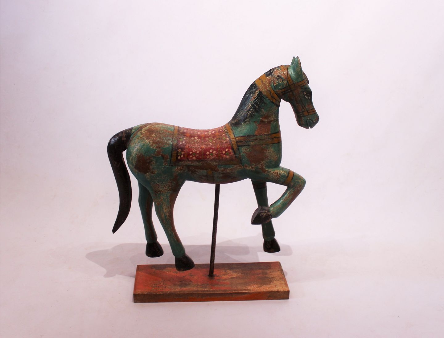 SoldLarge wooden figure in the shape of a horse decorated with different dark colours from the 1920s. The figure is in great vintage condition.