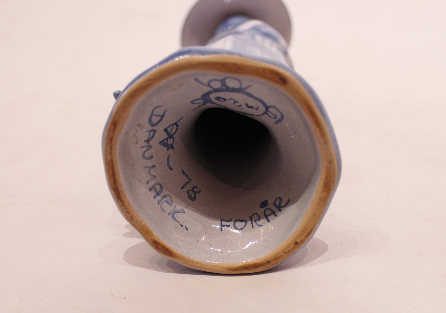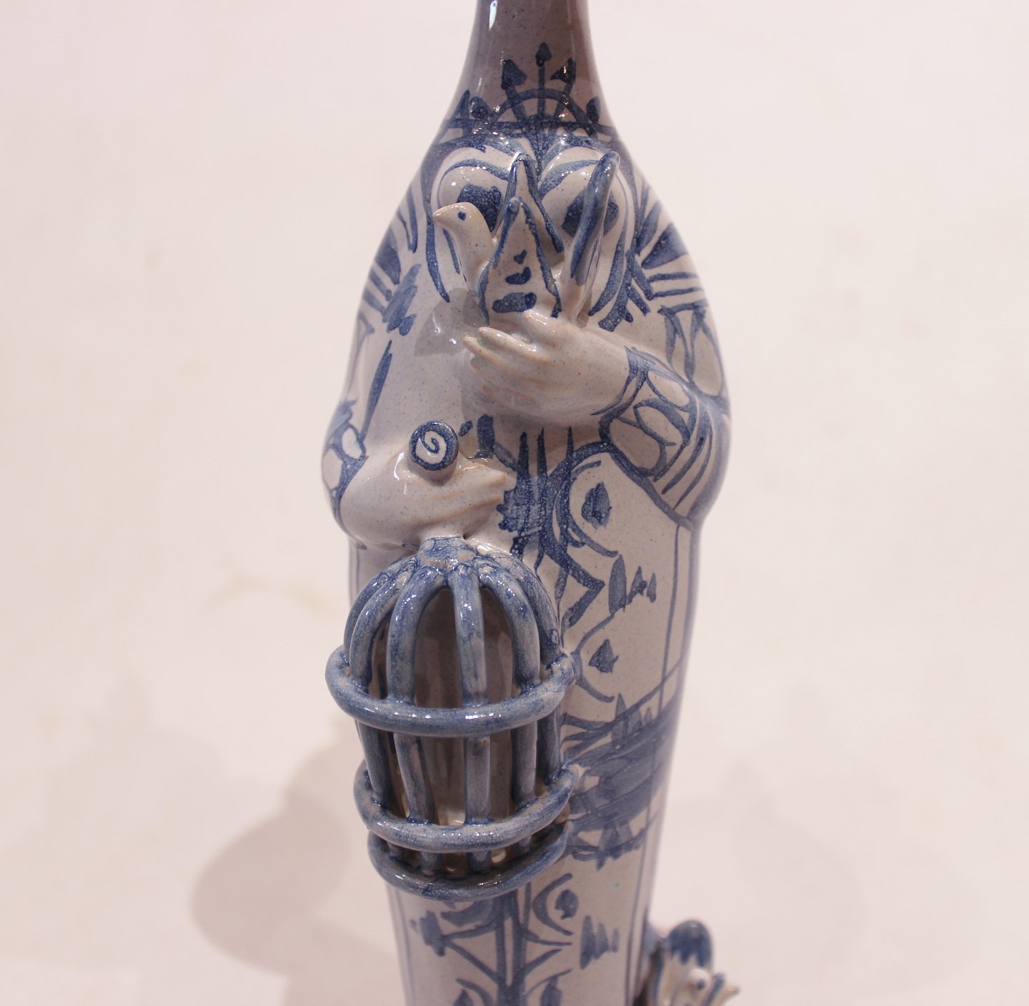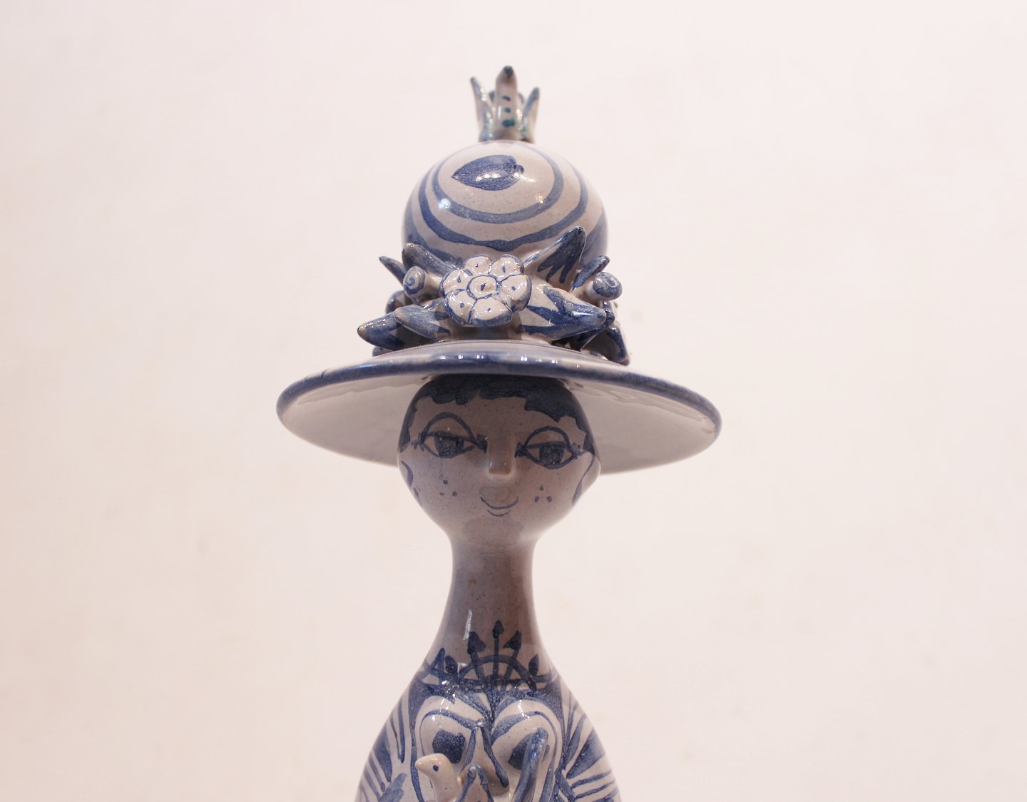 SolgtKeramik figur "Forår", M20, fra serien "De fire årstider" designet af Bjørn Wiinblad. Denne figur blev lavet i 1978 og er dekoreret i blå og hvide farver.
