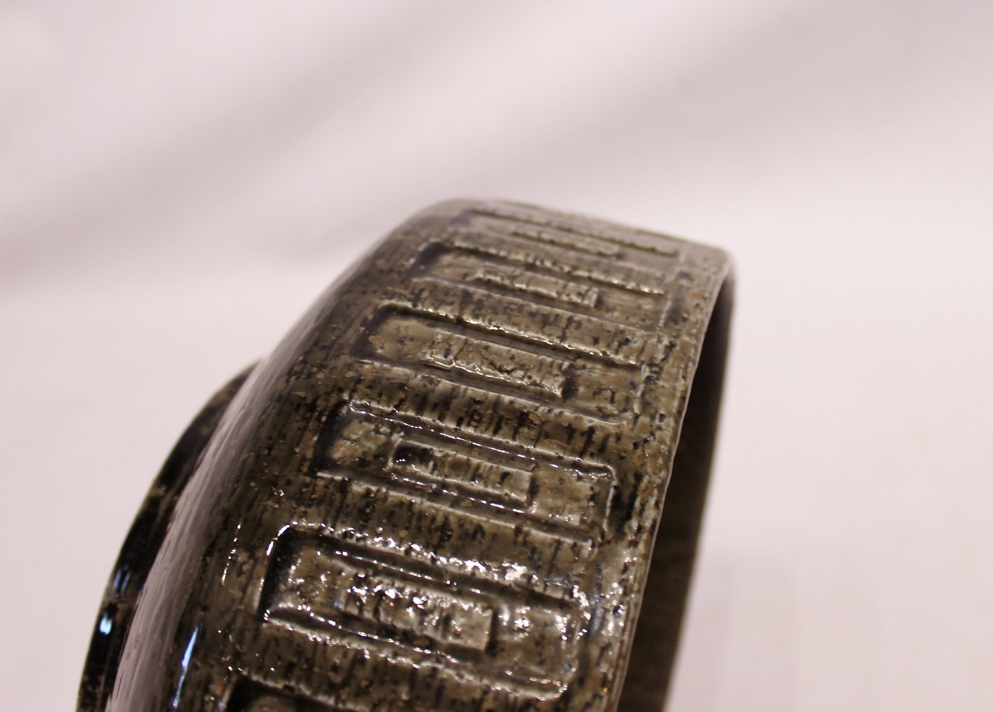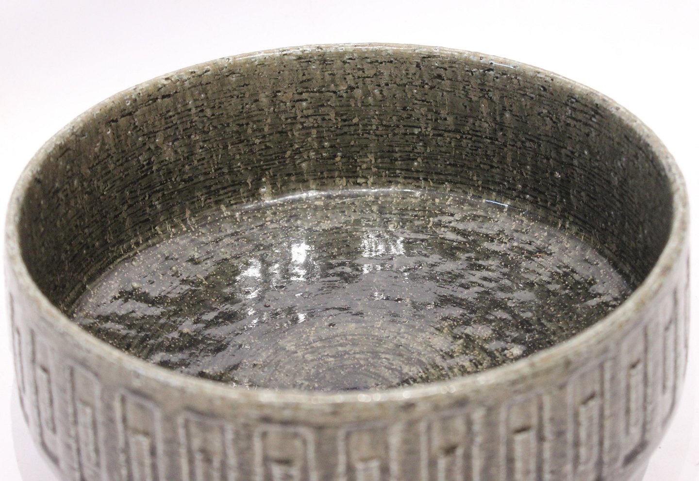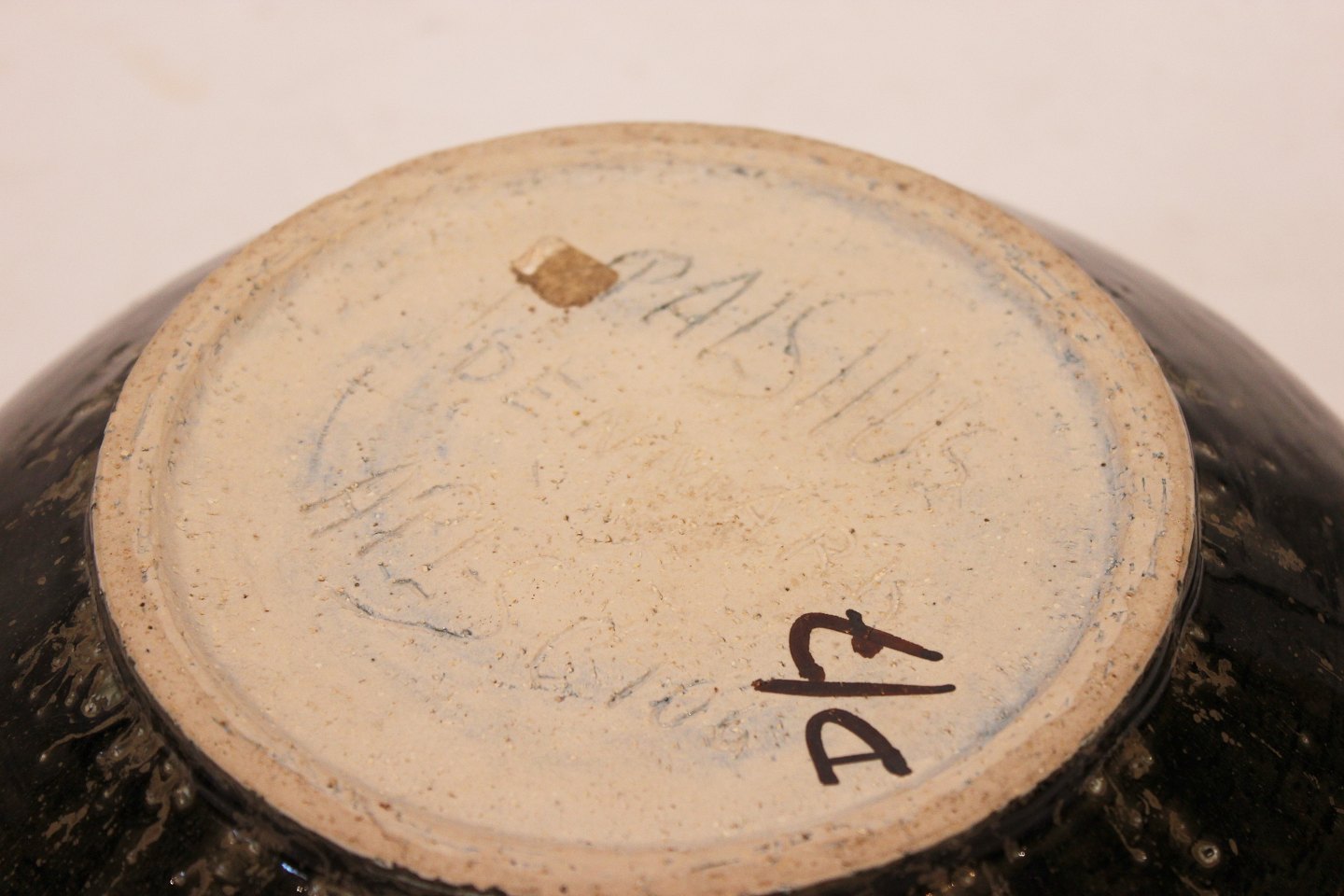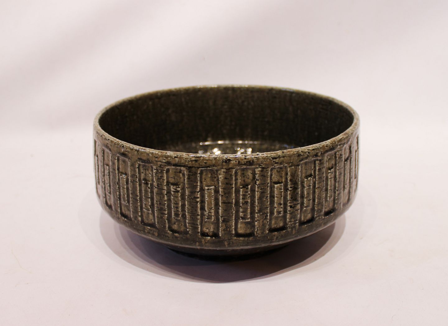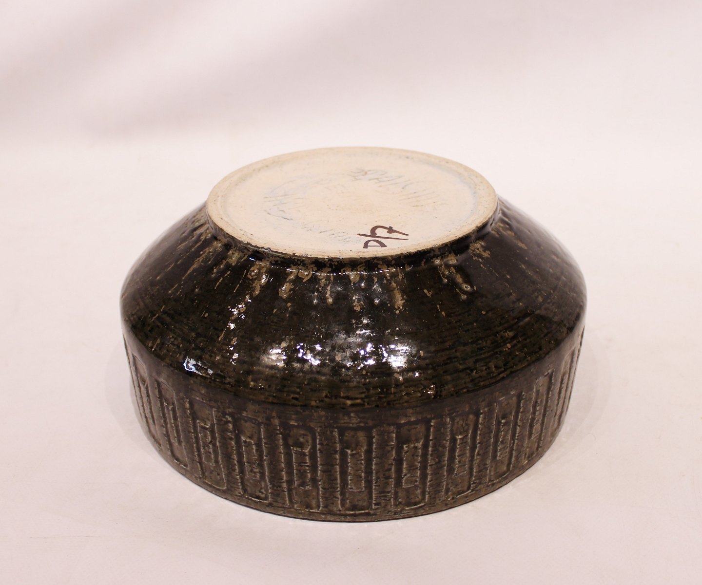 SoldLarge ceramic bowl with glaze in green colors by Palshus. The bowl is in great vintage condition.
