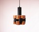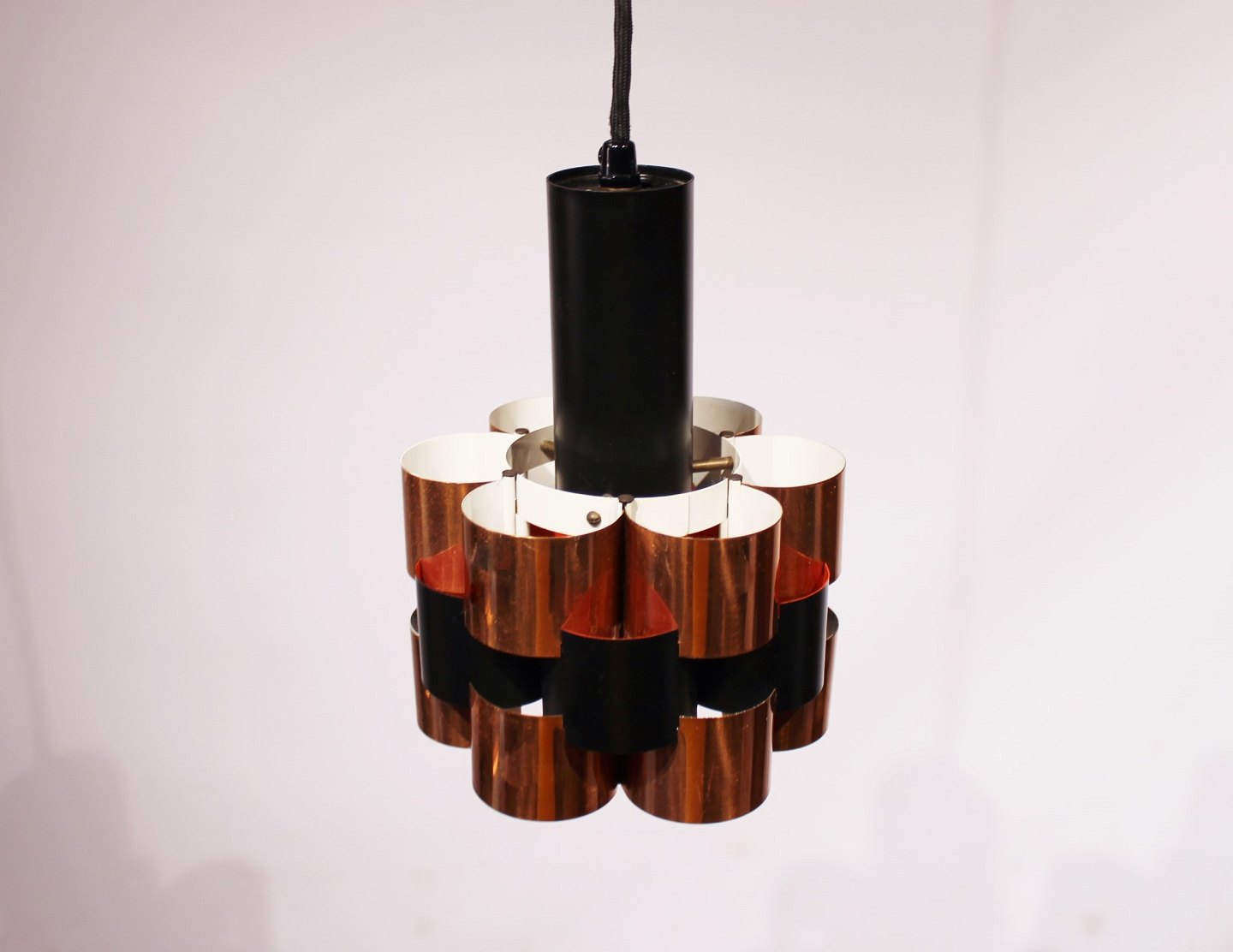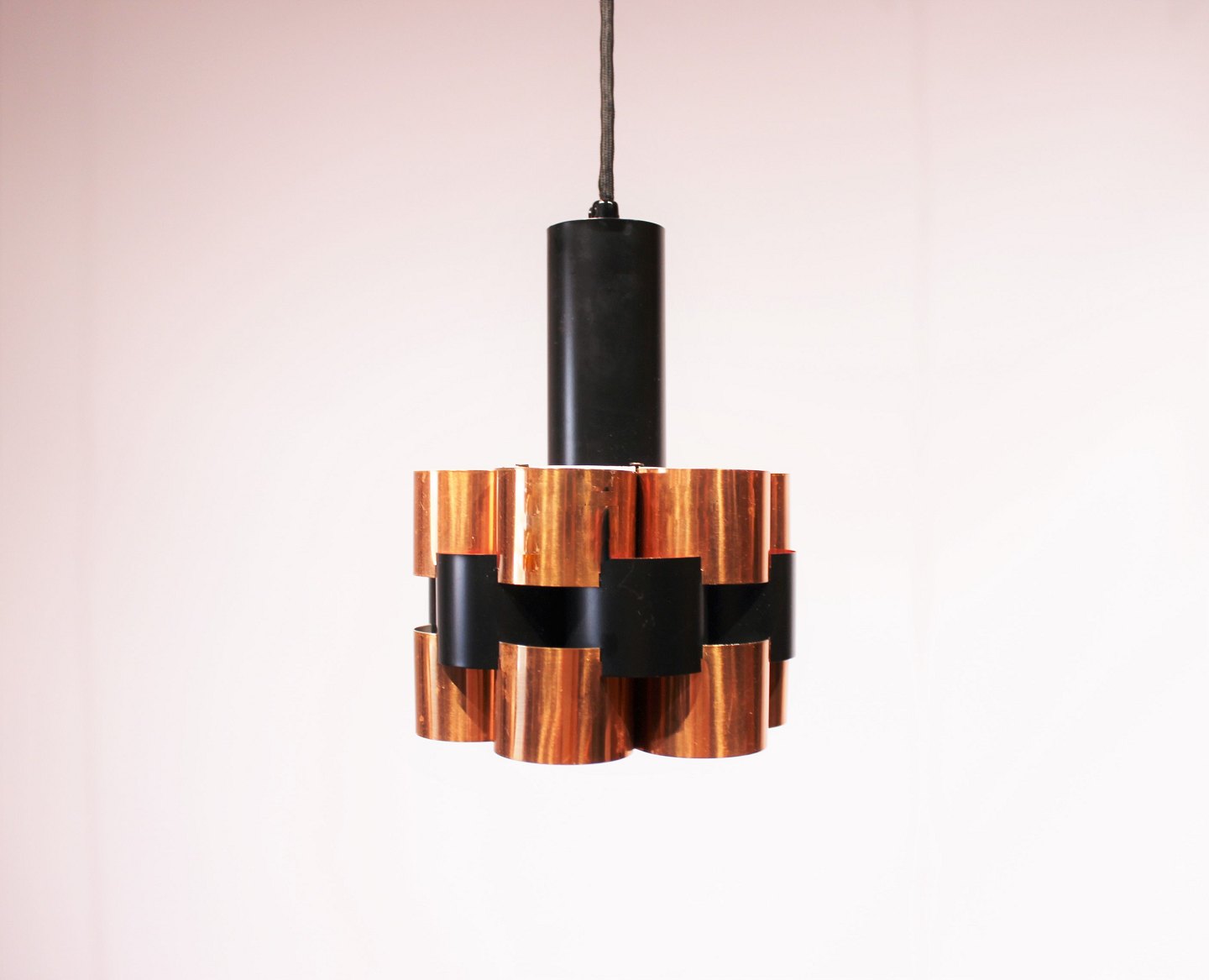 Et par loft pendler af kobber og og sort lakeret metal designet af Werner Schou fra 1960erne. Lamperne er i flot brugt stand.