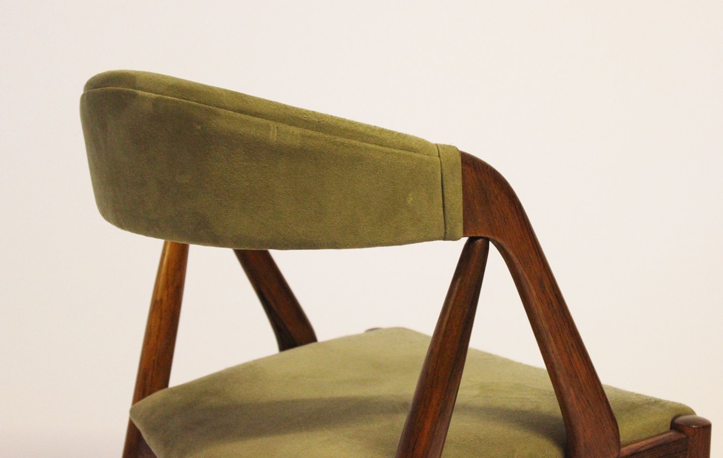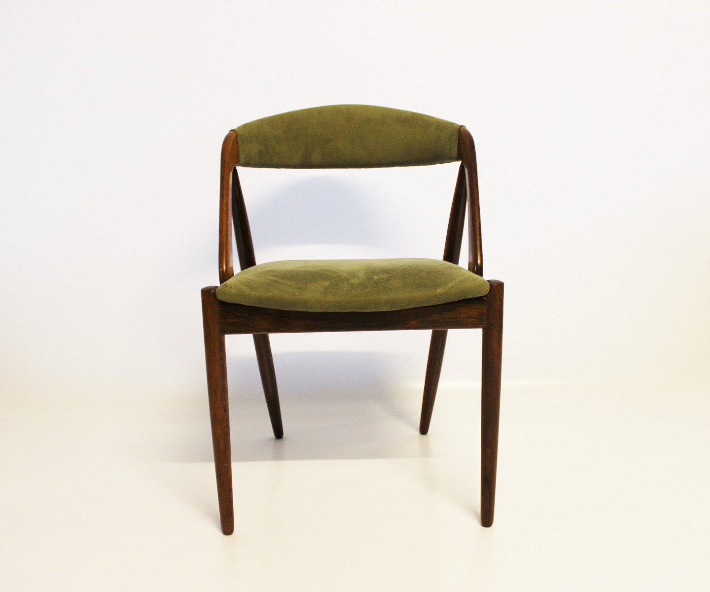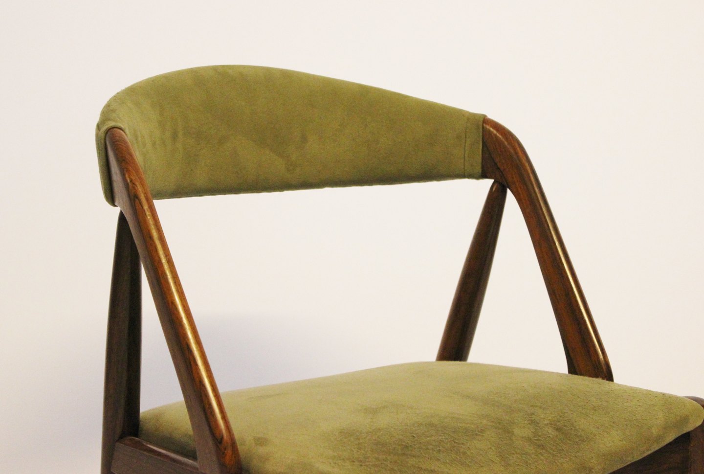 A set of six dining chairs, model 31, designed by Kai Kristiansen and manufactured by Schou Andersen in the 1960s. The chairs are of rosewood and upholstered with green fabric.