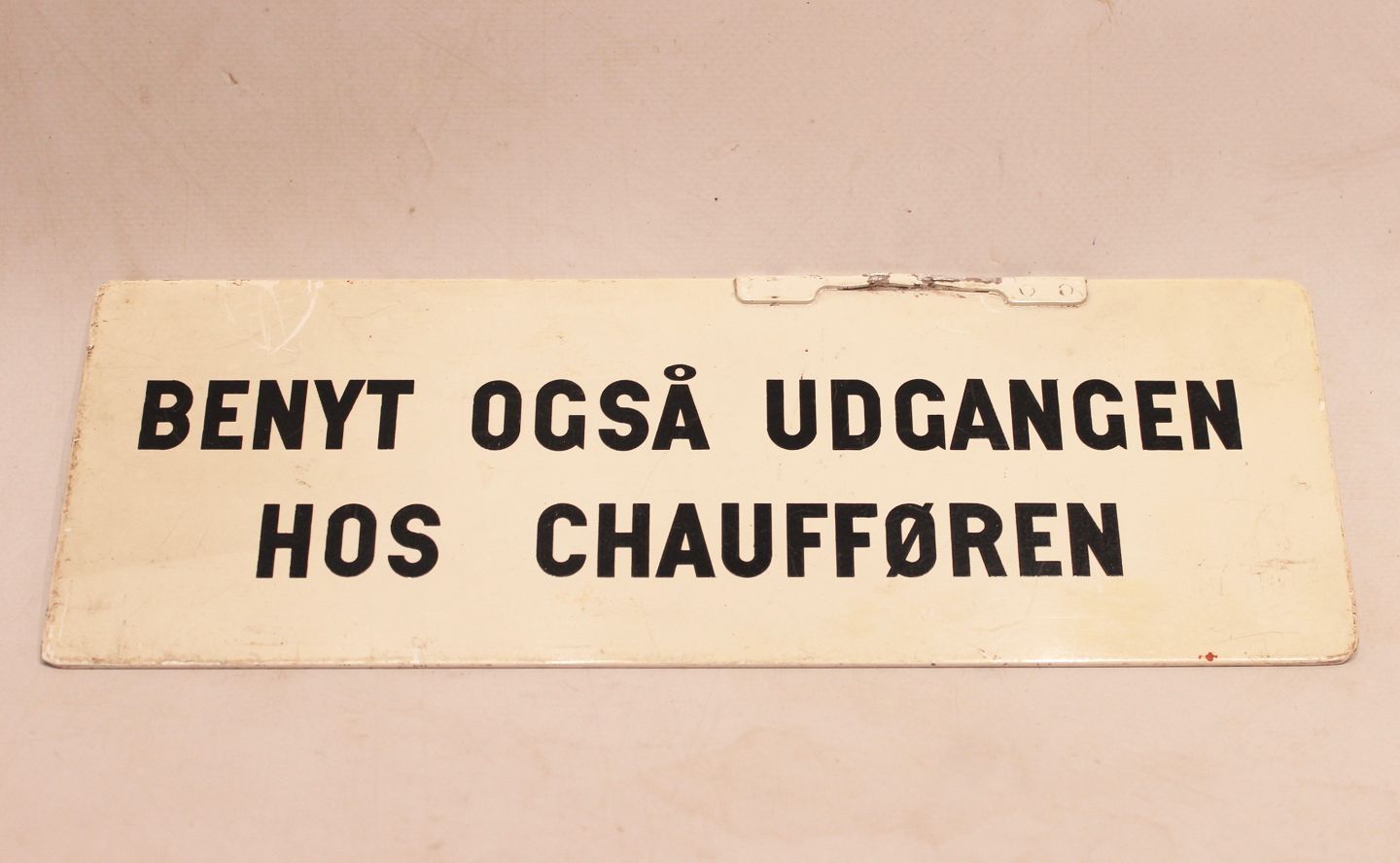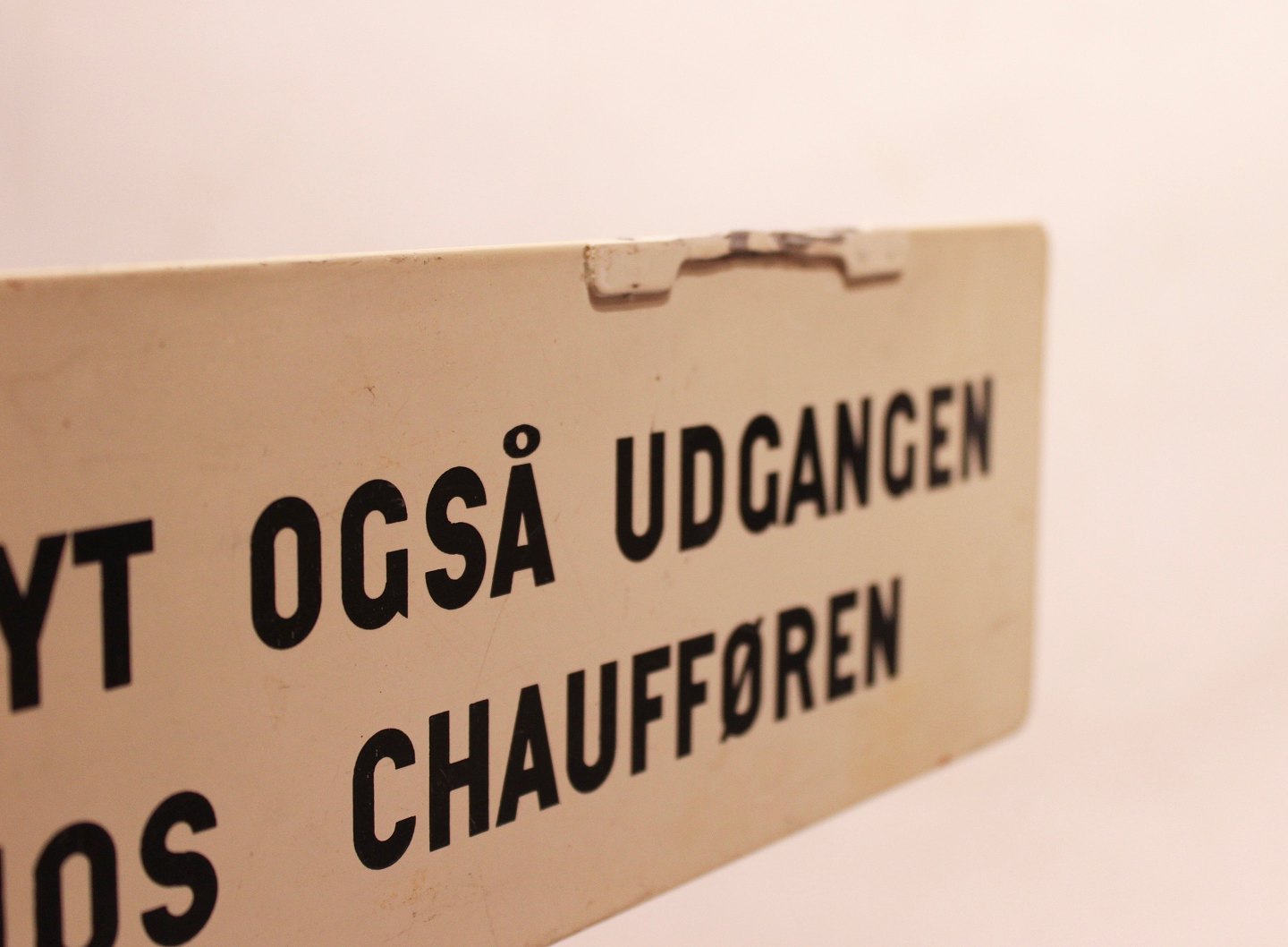 Antique white metal sign used in busses, "use also the exit at the driver's end". The sign is in great vintage condition.