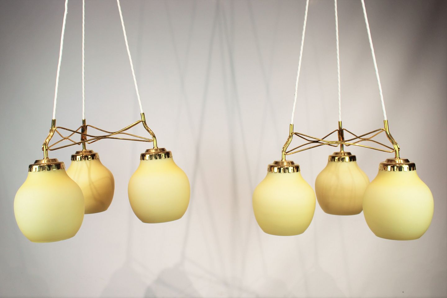SoldA pair of ceiling pendants of brass and light yellow shades by Vilhelm Lauritzen from the 1960s. The pendants are in great vintage condition.