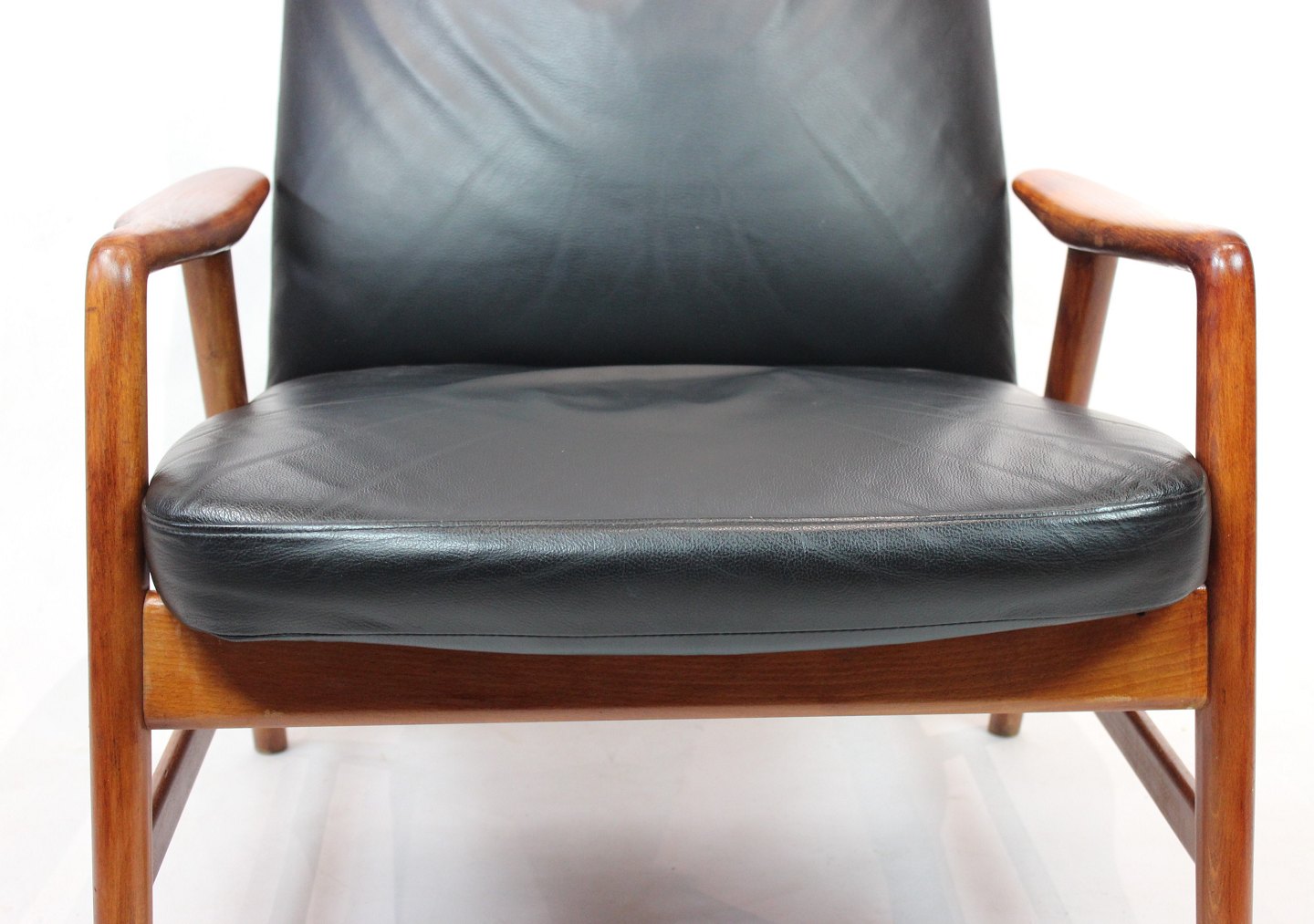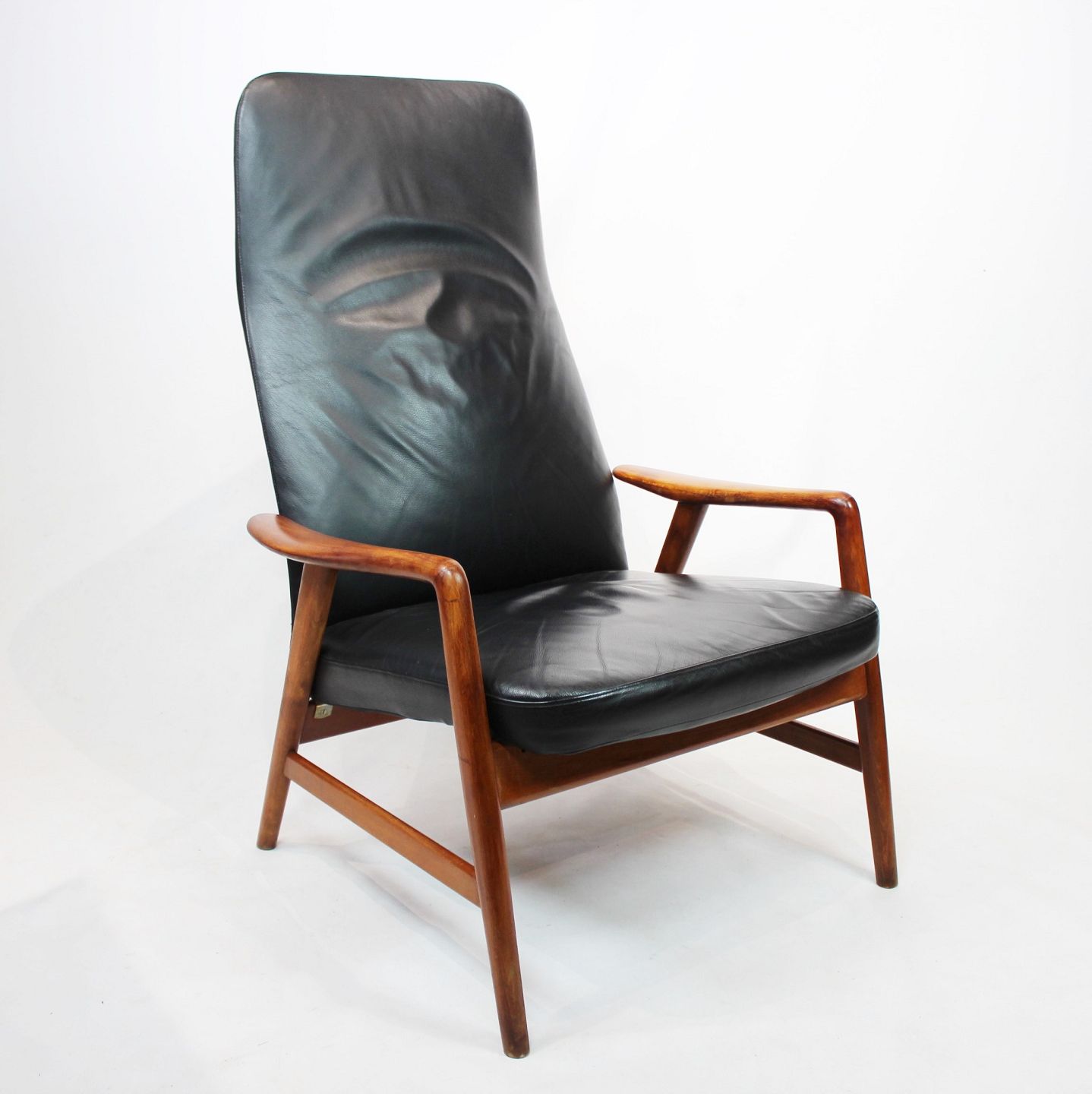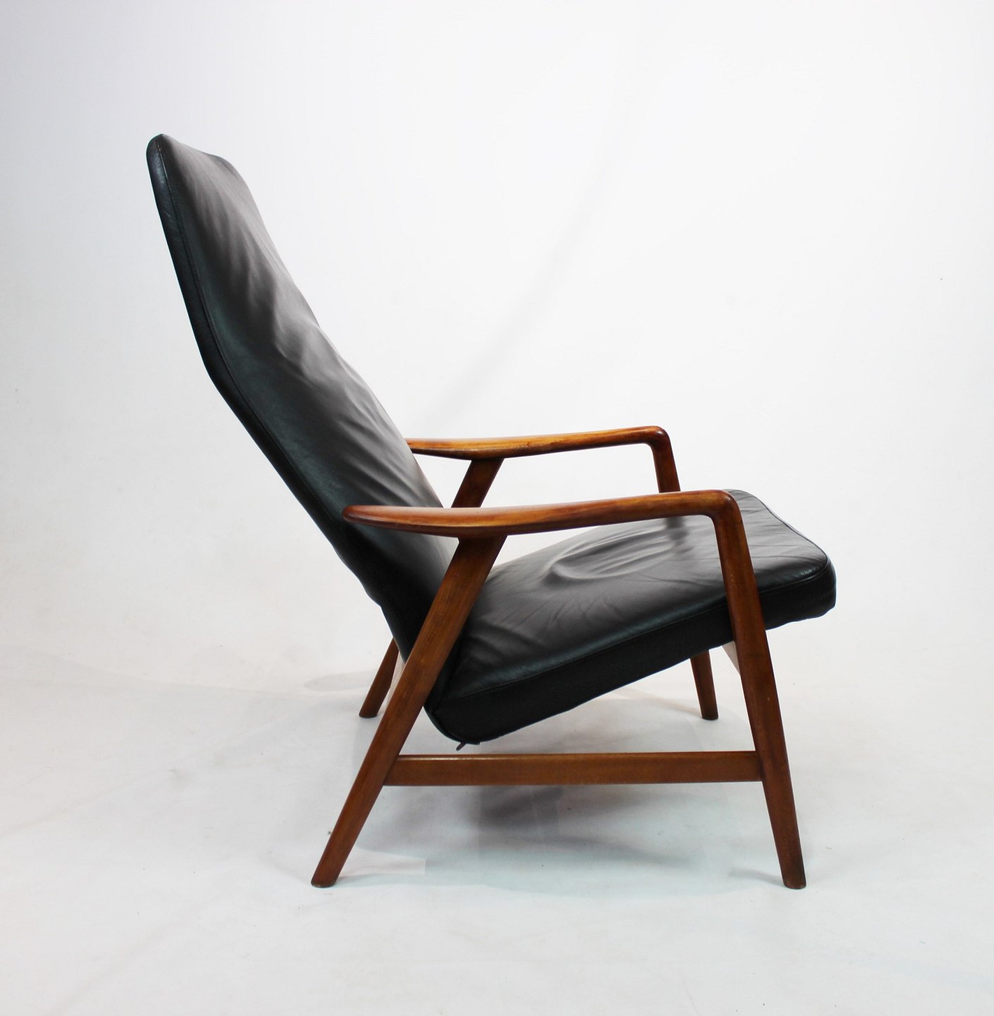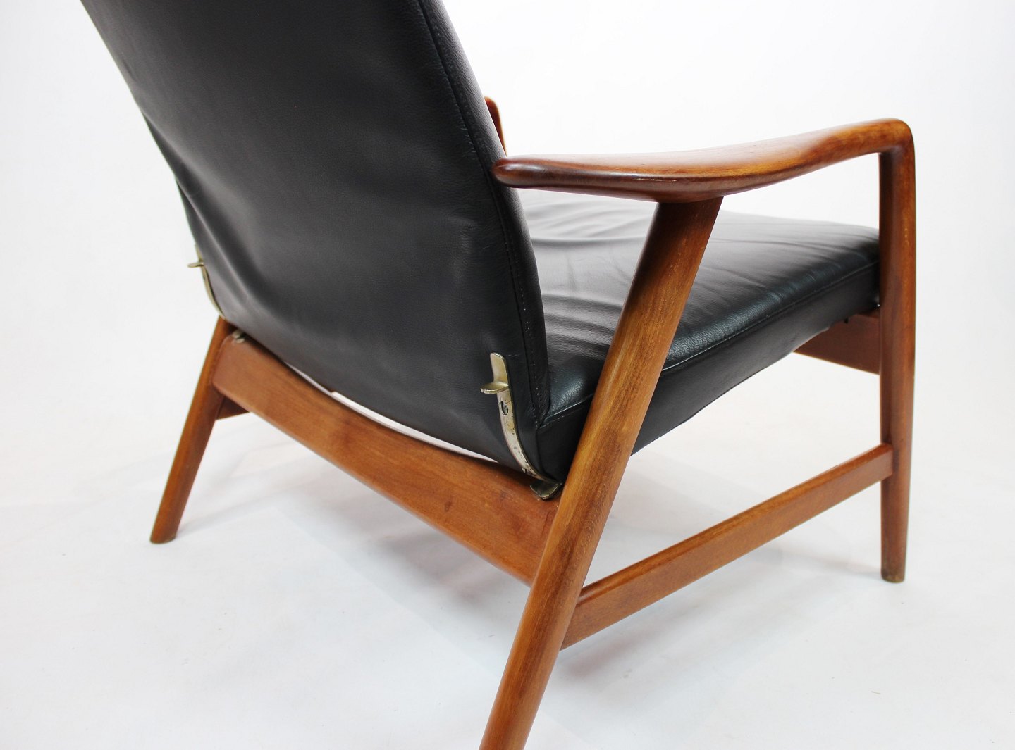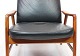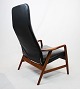 SoldEasy chair of polished wood and black leather designed by Alf Svensson and manufactured by Fritz Hansen in the 1960s. The chair is in great vintage condition and the back can be adjusted.