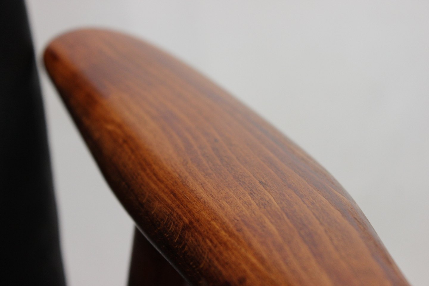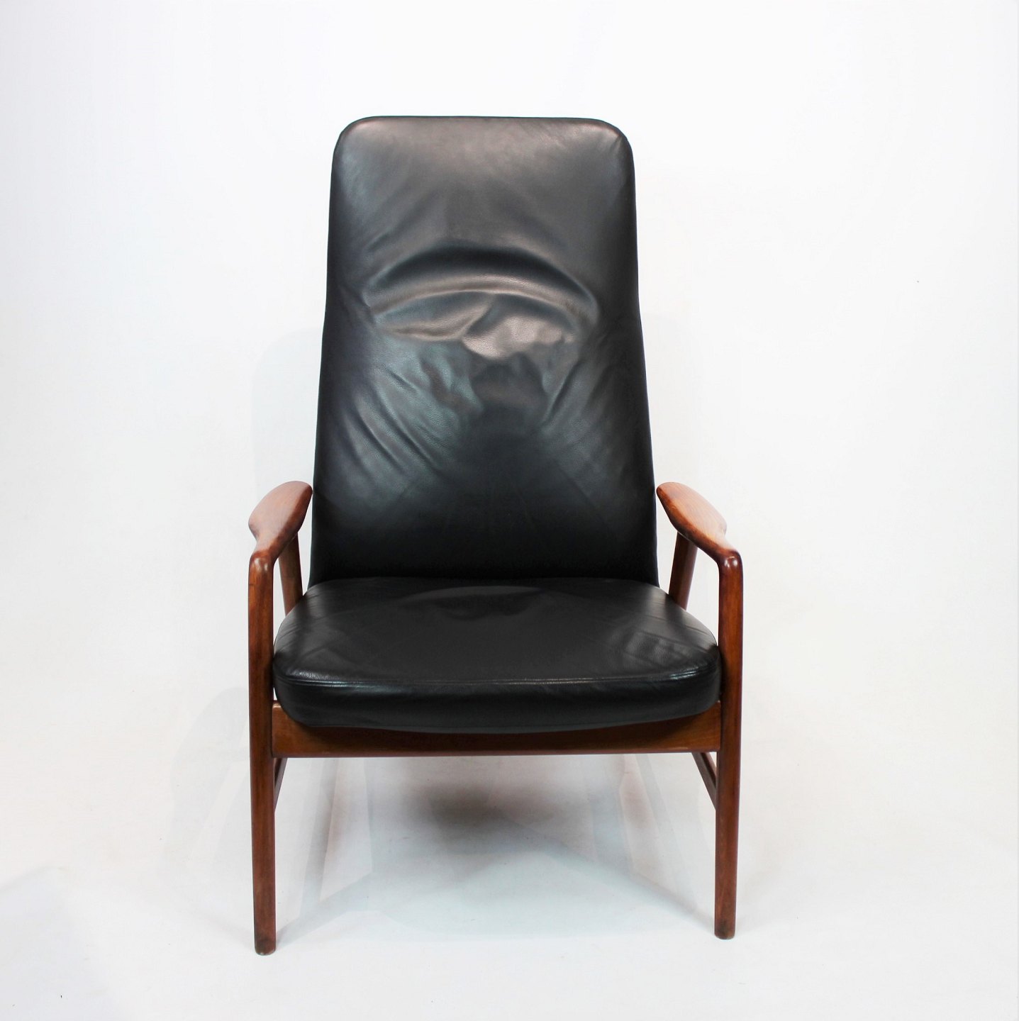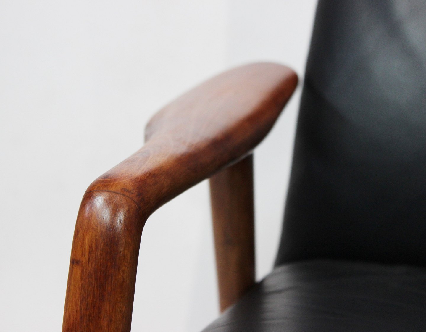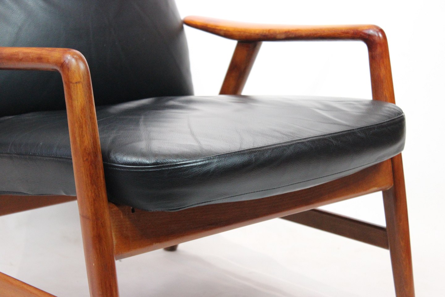 SoldEasy chair of polished wood and black leather designed by Alf Svensson and manufactured by Fritz Hansen in the 1960s. The chair is in great vintage condition and the back can be adjusted.