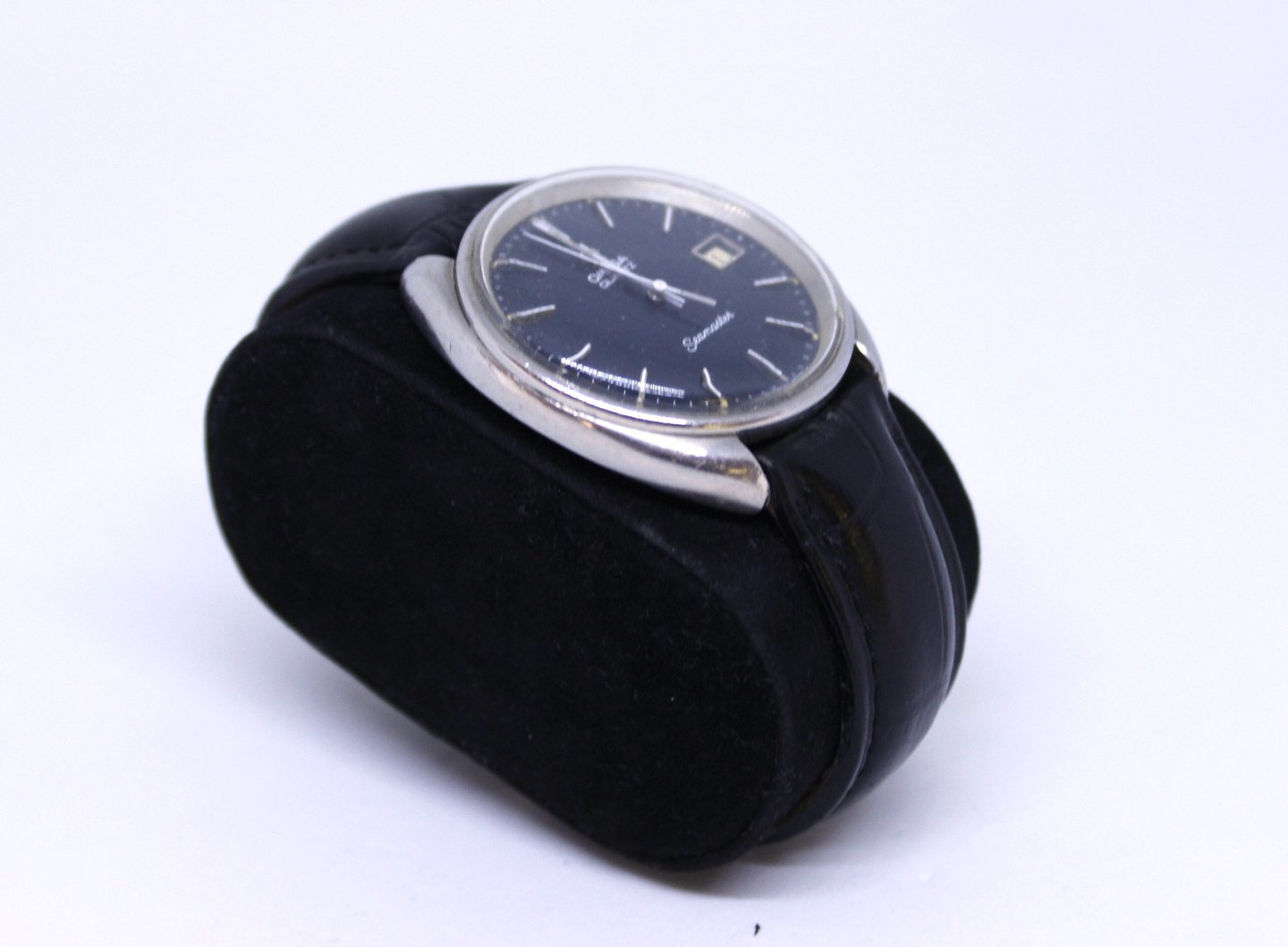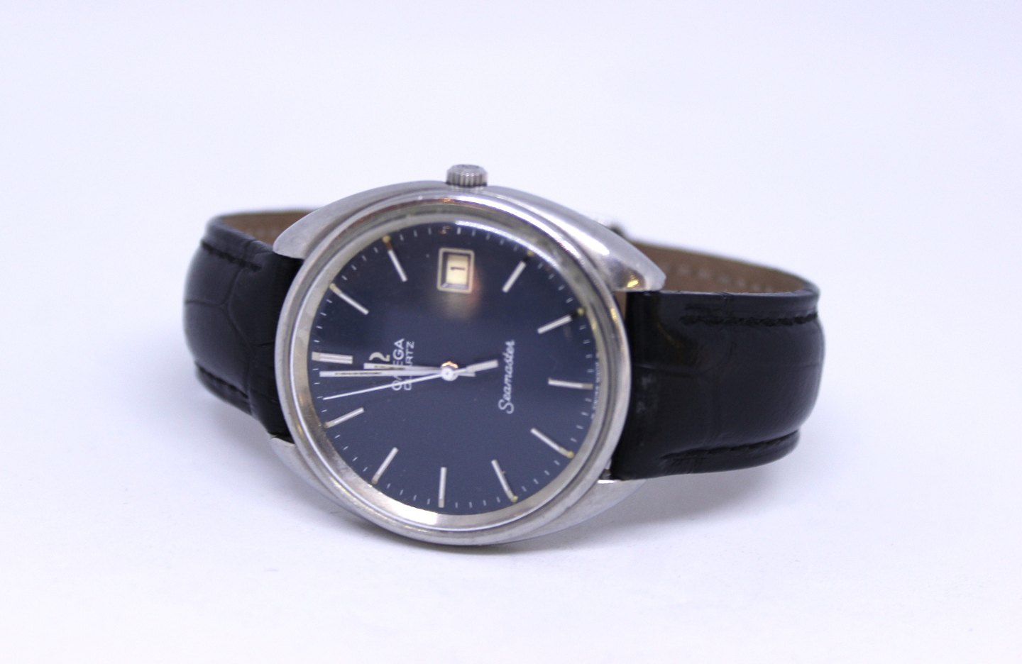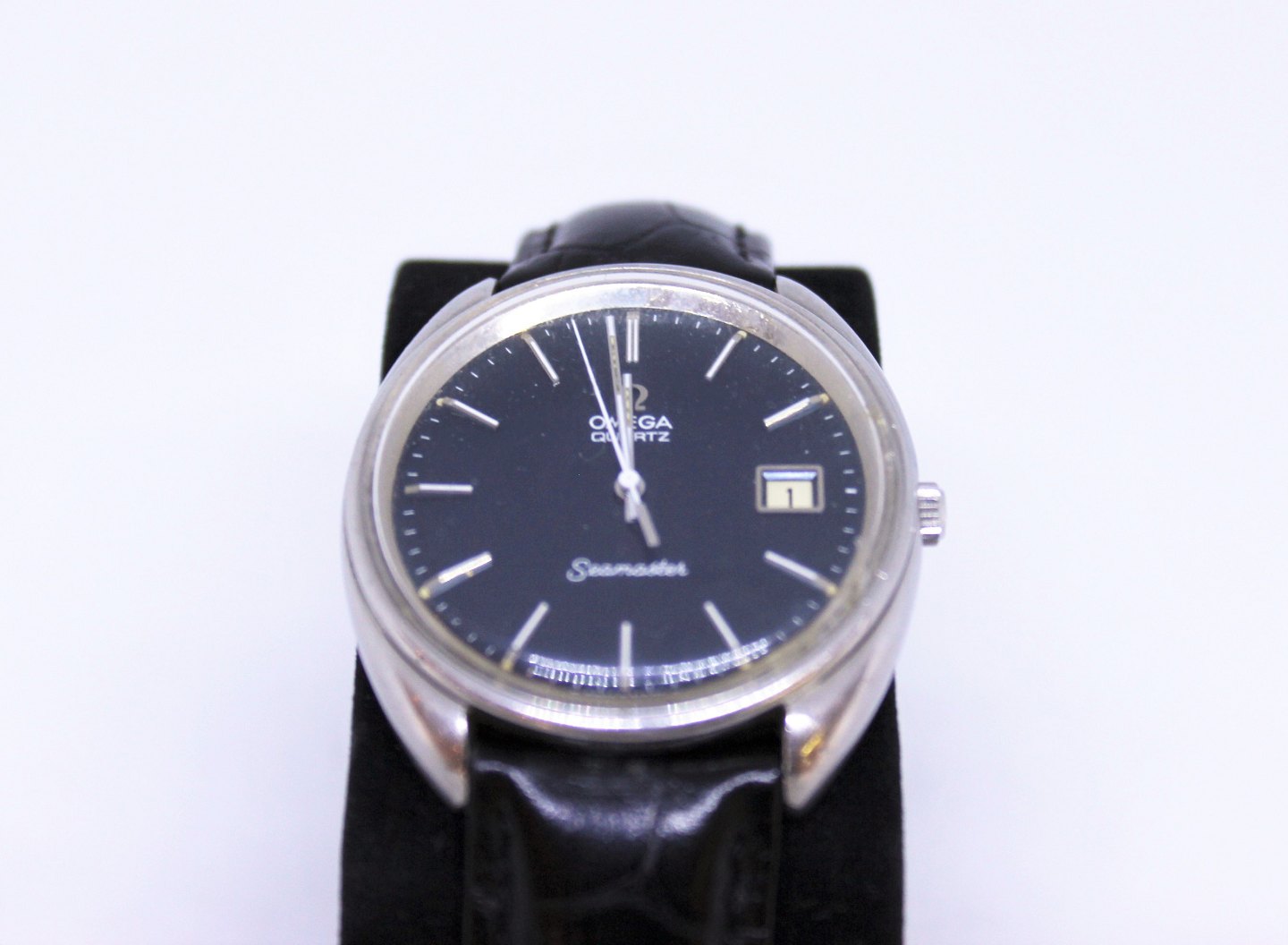 SolgtOmega quartz Seamaster armbåndsur med schweizisk urværk og dato viser. Uret er med sort læderrem og i flot brugt stand.