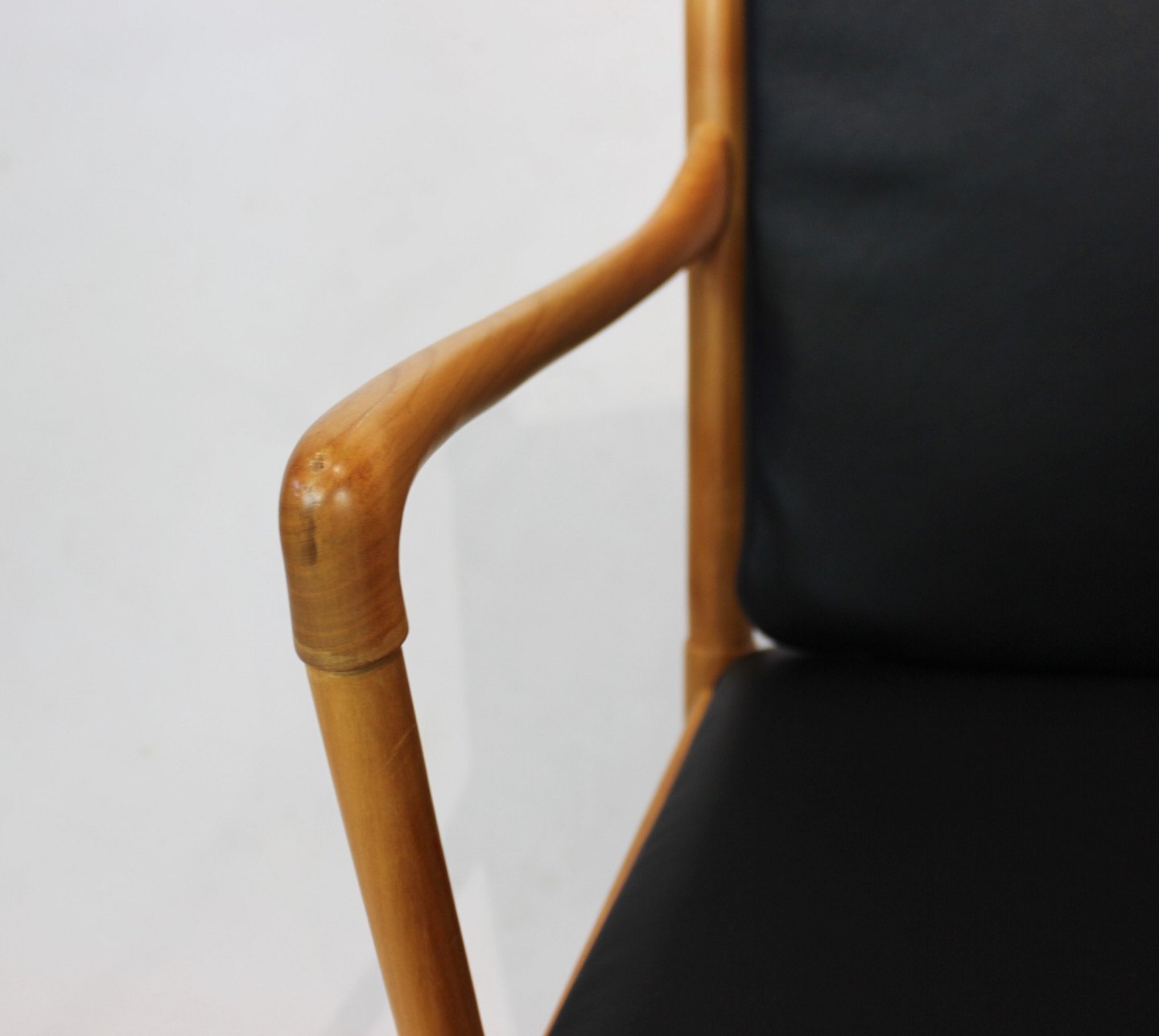 This armchair, model PJ-301, was designed by the renowned Danish furniture designer Ole Wanscher and manufactured by PJ Møbler in the 1960s. The chair is made of cherry wood, which gives it a warm and elegant appearance. The cushions are upholstered in black leather, which adds a modern and sophisticated touch.