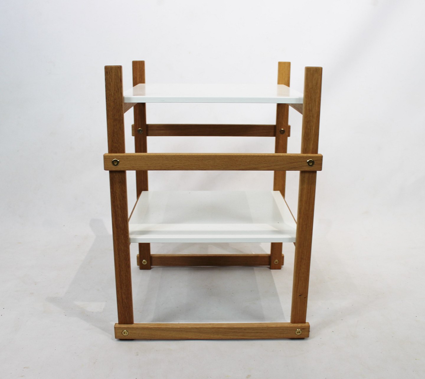 Sidebord med hylde af hvid laminat og af ramme af egetræ. Bordet er u fin brugt stand.