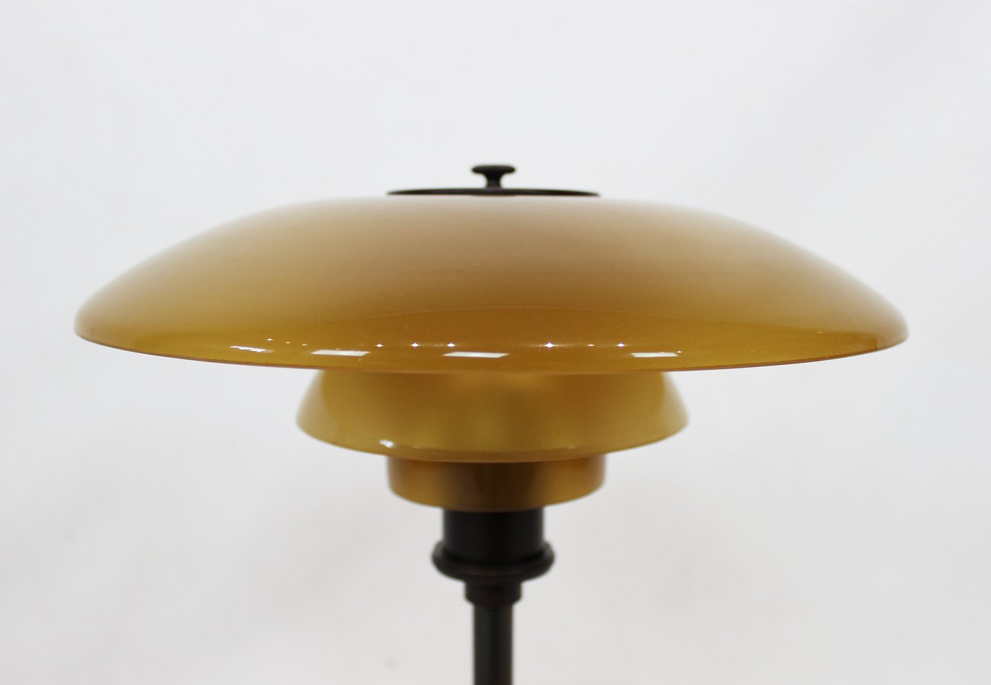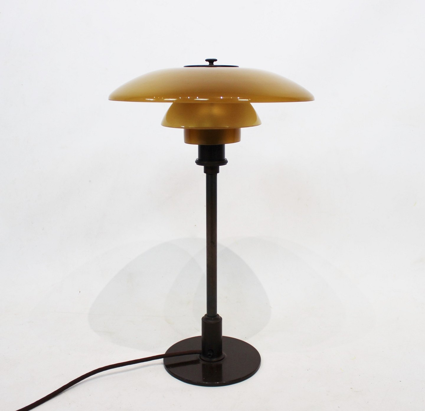 SoldPH 3/2 tablelamp with shades of amber colored glass and frame of burnished brass, designed by Poul Henningsen and manufactured by Louis Poulsen in the beginning of the 1930s. The lamp is in great vintage condition.