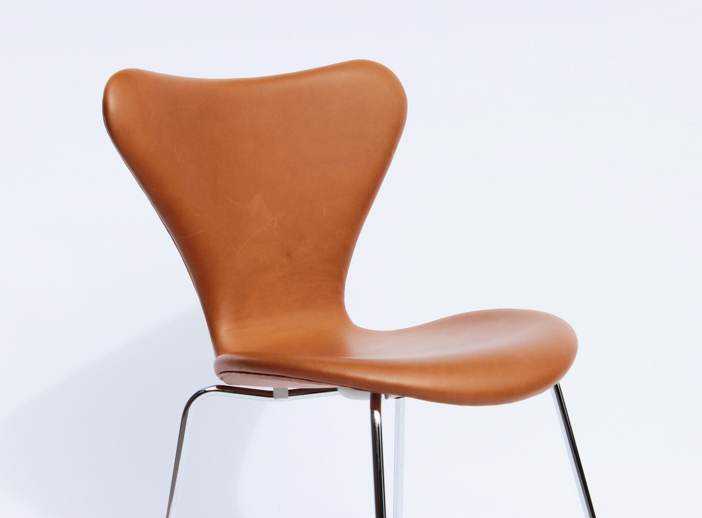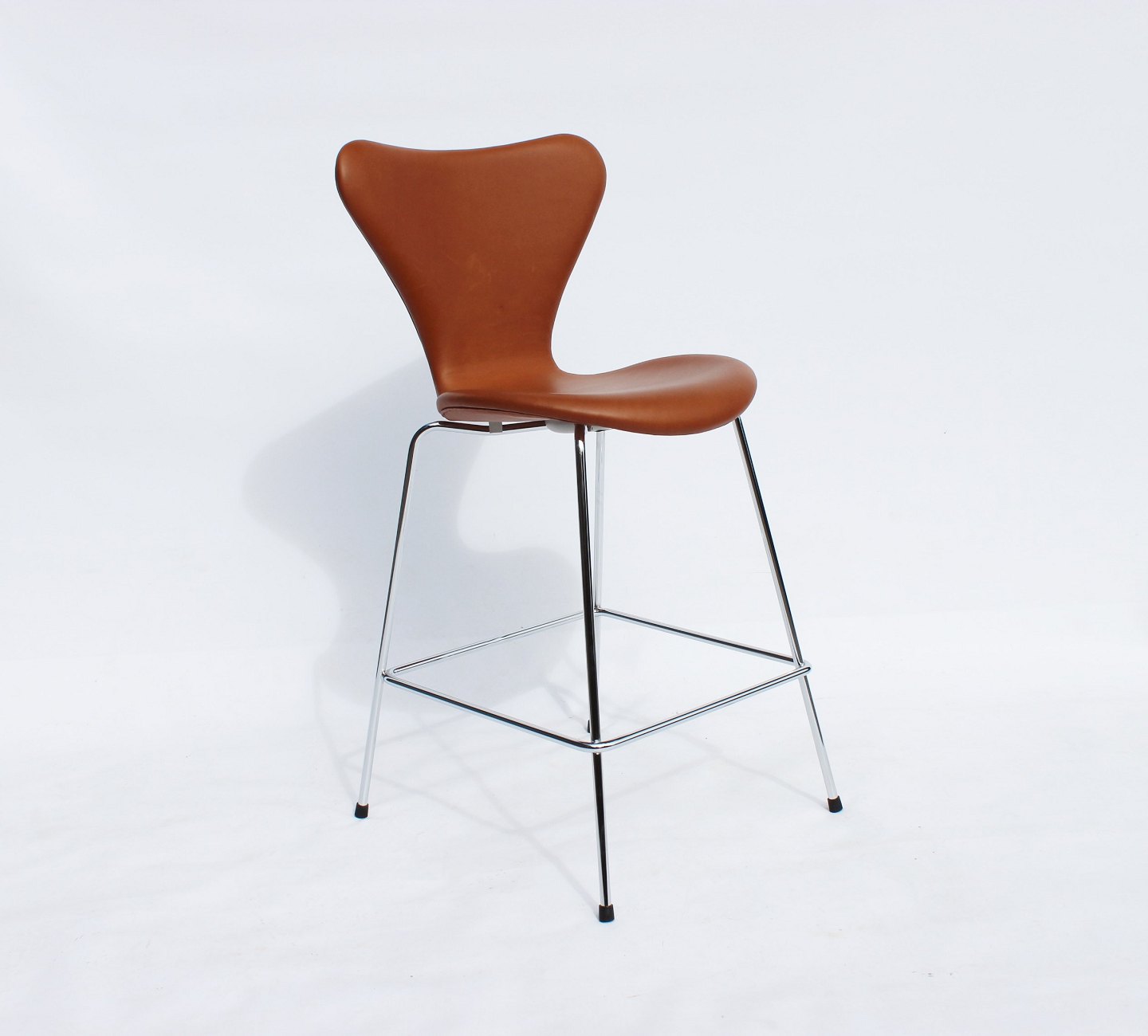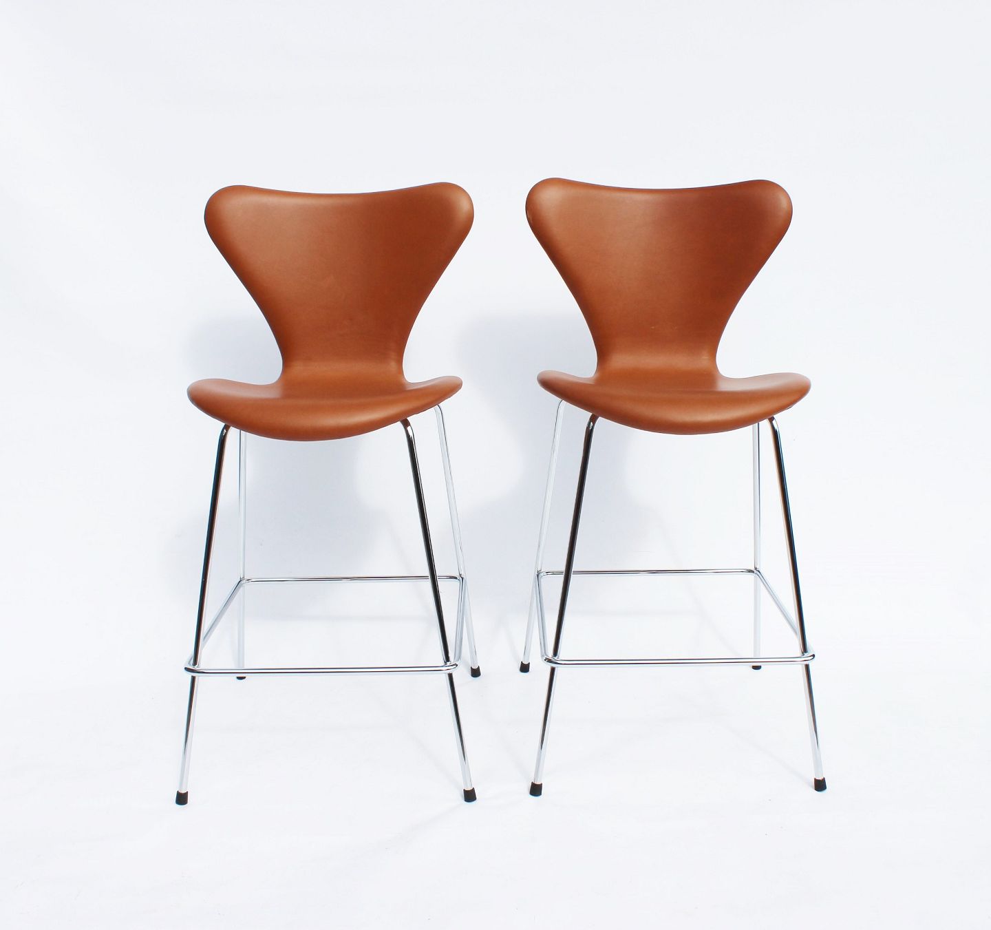 SoldA pair of Seven bar stools, model 3187, with walnut elegance leather designed by Arne Jacobsen and manufactured by Fritz Hansen in 2019. The chairs are in excellent condition.