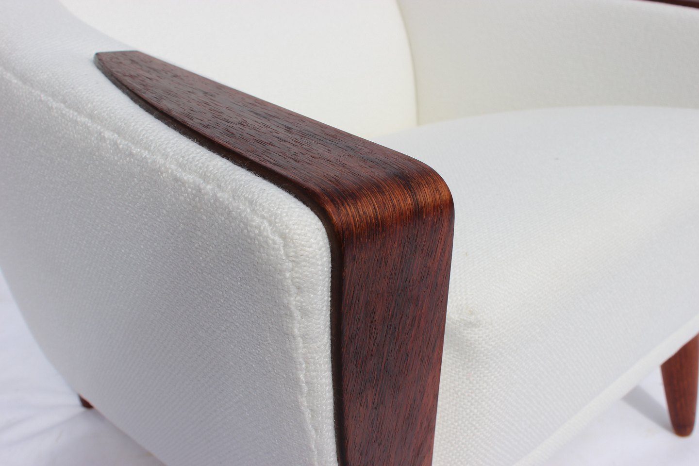 Please contact us for price informationThe armchair with a low back, upholstered in an elegant white fabric and resting on beautifully polished rosewood legs, is a masterpiece of Danish design from the 1960s. Its clean lines and organic form reflect the period aesthetics of Scandinavian furniture design.