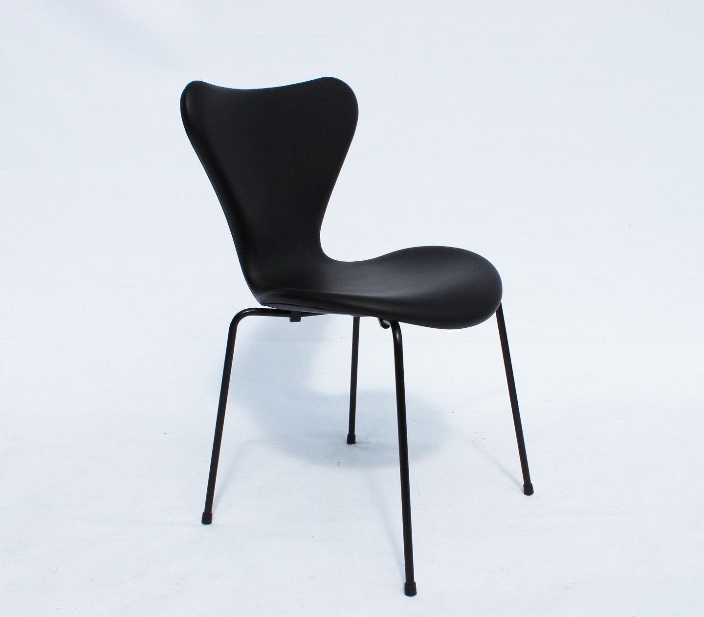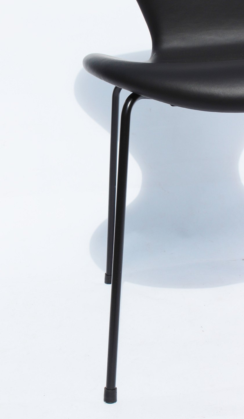 The chairs were created in 2016 as a special model that incorporates the classic elegance and timeless design elements that Arne Jacobsen is known for. The black leather upholstery adds a sophisticated atmosphere to the seat, while the black frame gives a modern and stylish look.