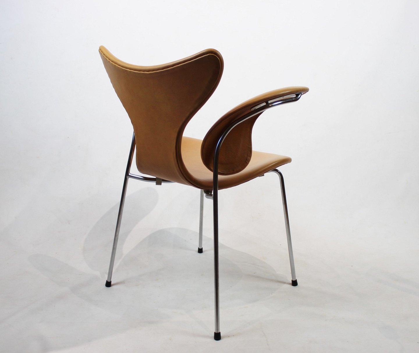 Vi køberLiljen, model 3208, med armlæn er designet af Arne Jacobsen i 1970 og fremstillet af Fritz Hansen samme år. Denne stol er et klassisk eksempel på Jacobsens evne til at skabe funktionelle møbler med en skulpturel æstetik.
