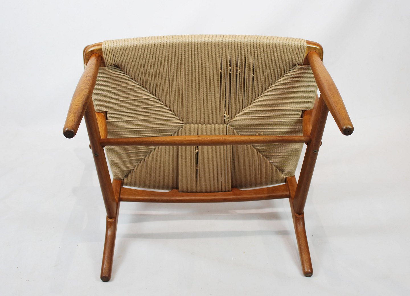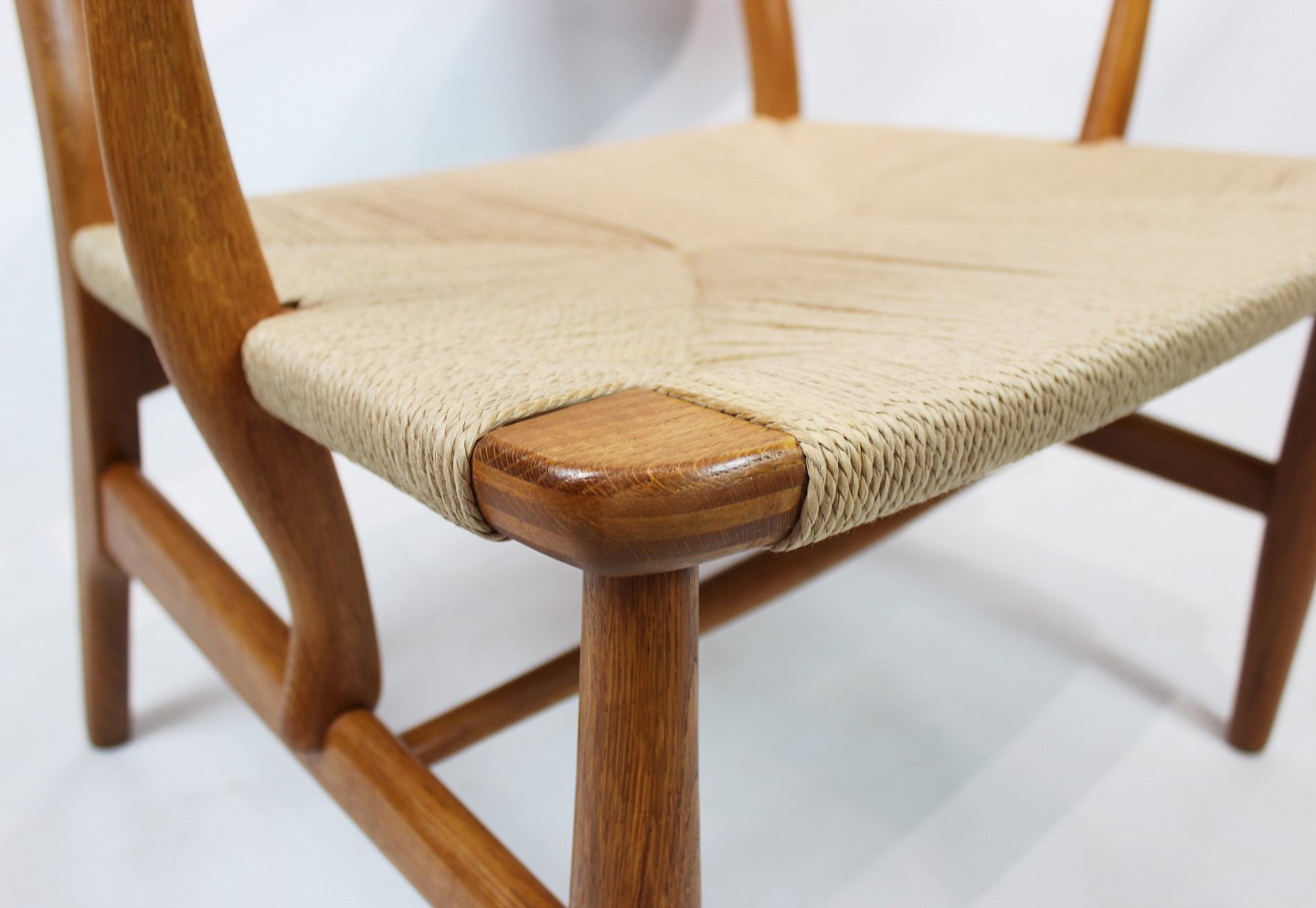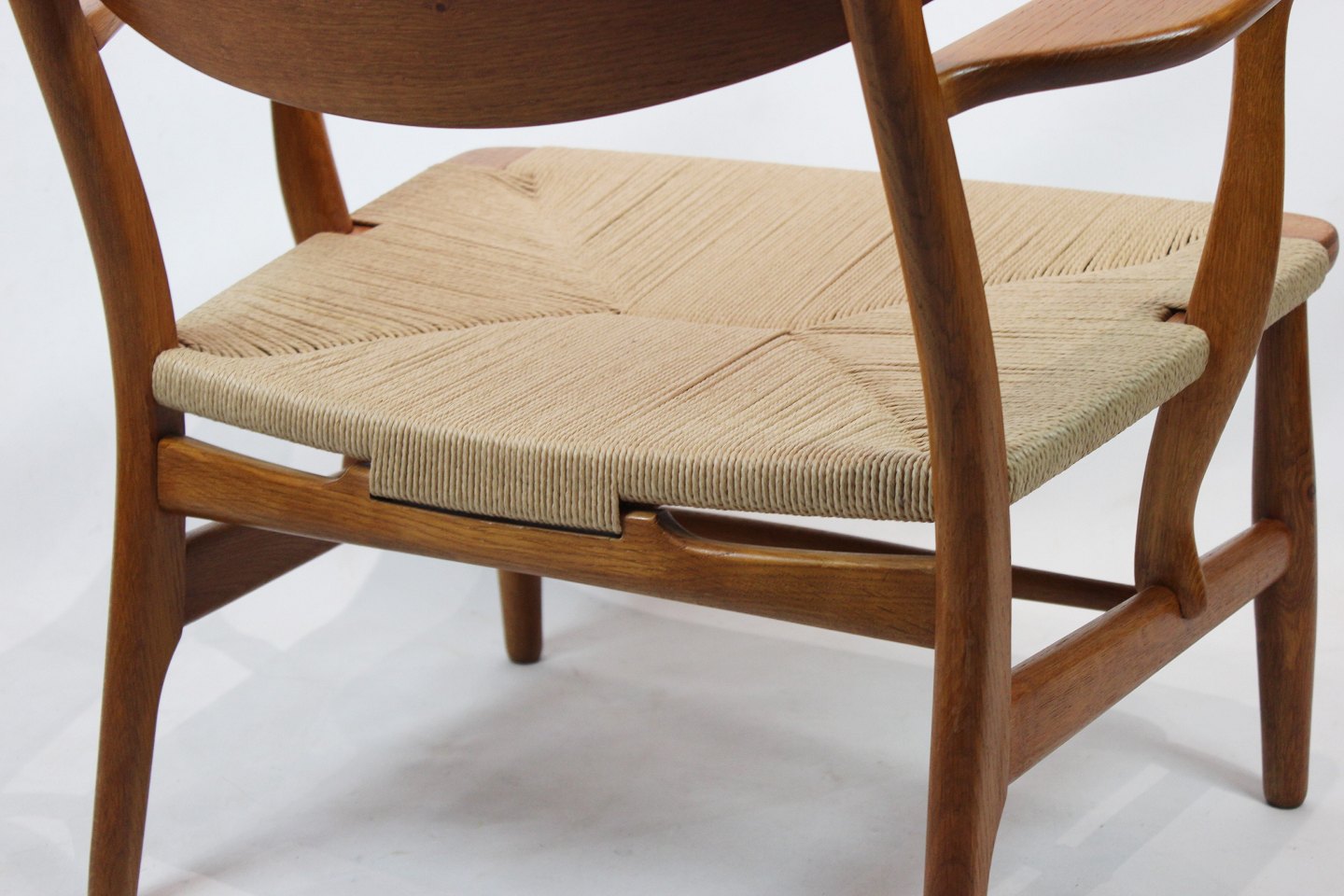 SolgtArmstol, model CH22, i egetræ og papirflet designet af Hans J. Wegner og fremstillet af Carl Hansen & Søn i 1950erne. Stolen er i flot original stand med ny flet.