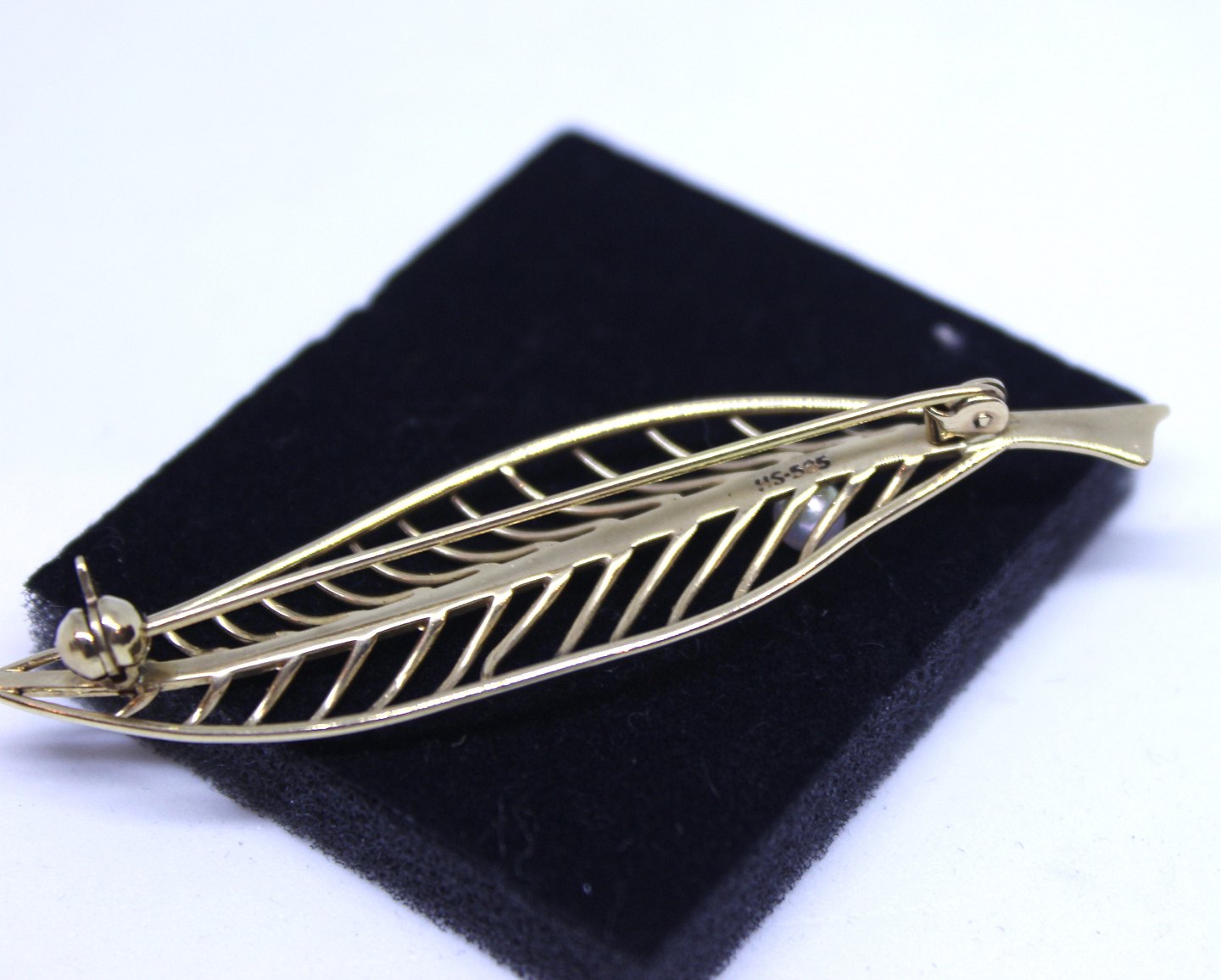 SoldLeaf shaped brooch of 14 carat gold with pearl, stamped H.S.