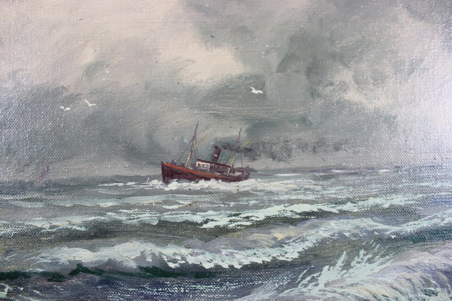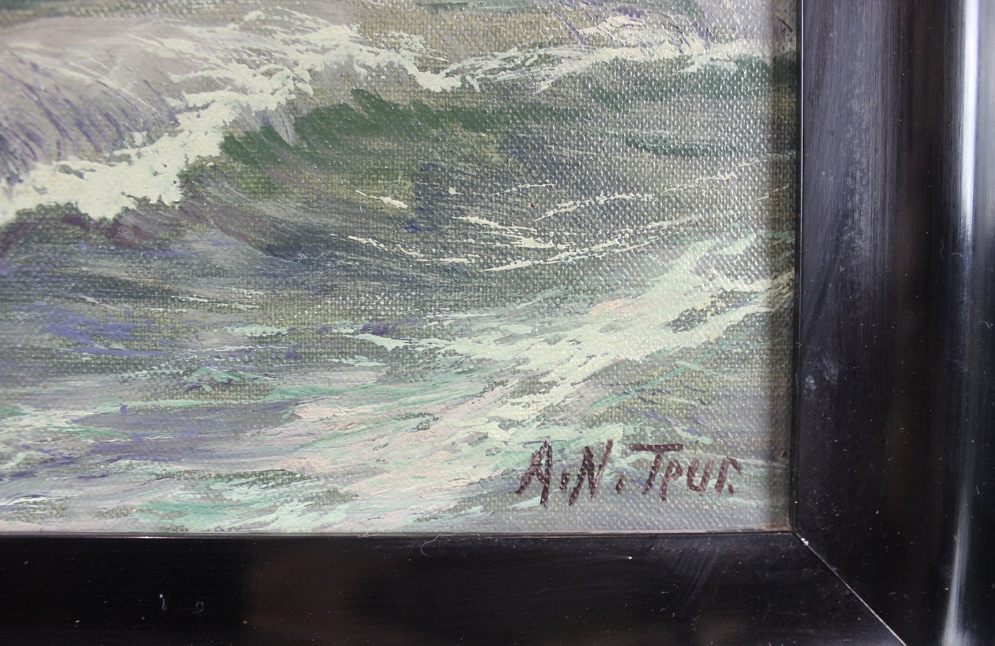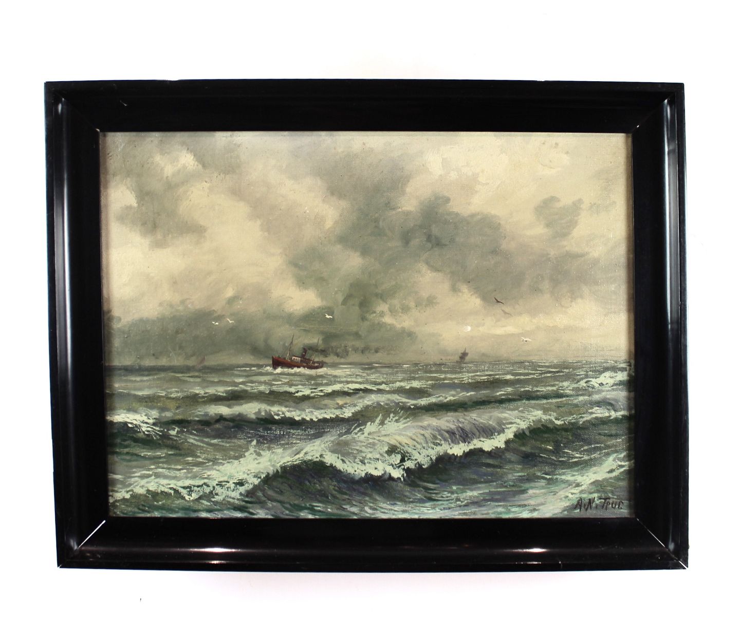 Oliemaleri med hav motiv og sort træramme signeret A. N. Tpur.