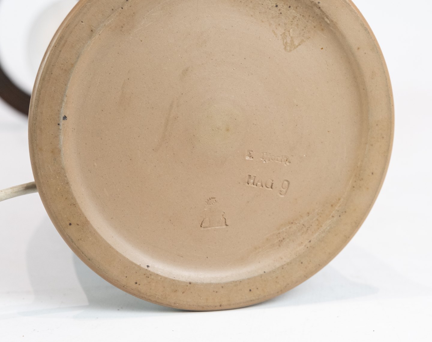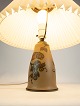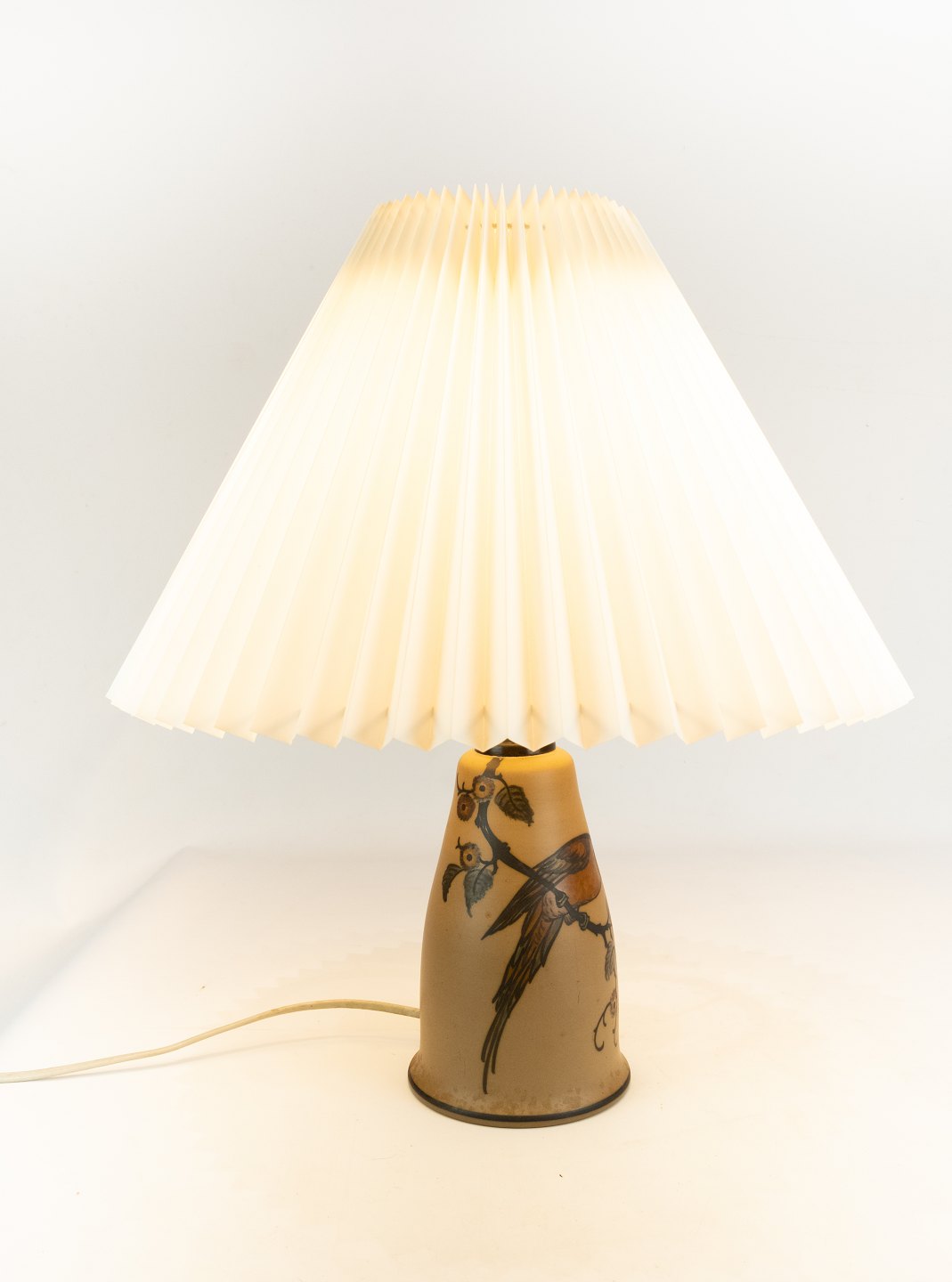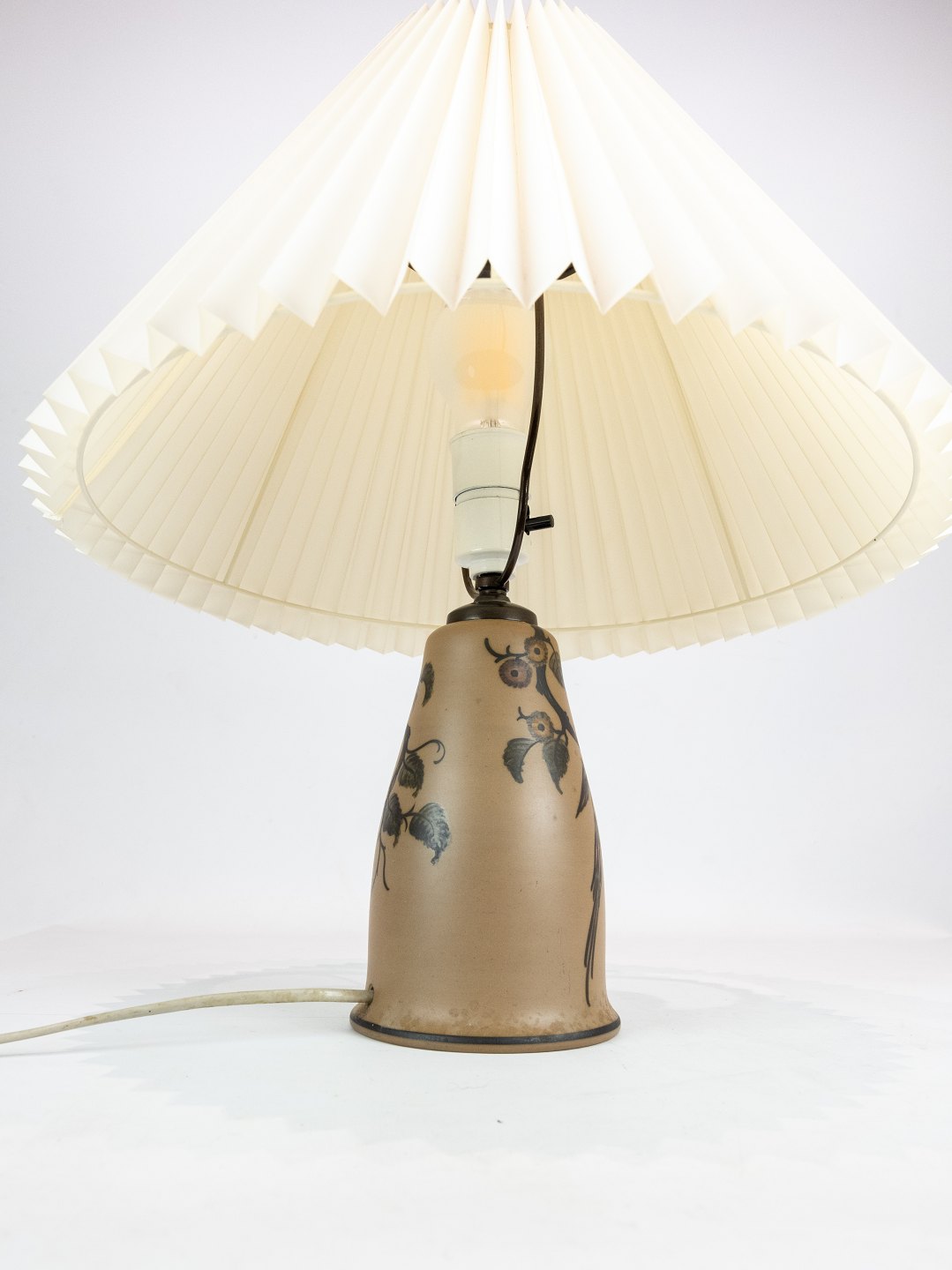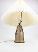Bordlampe i brune farver, model MAG9, af Hjort Denmark. Skærmen er håndfoldet og håndmalet i papir.