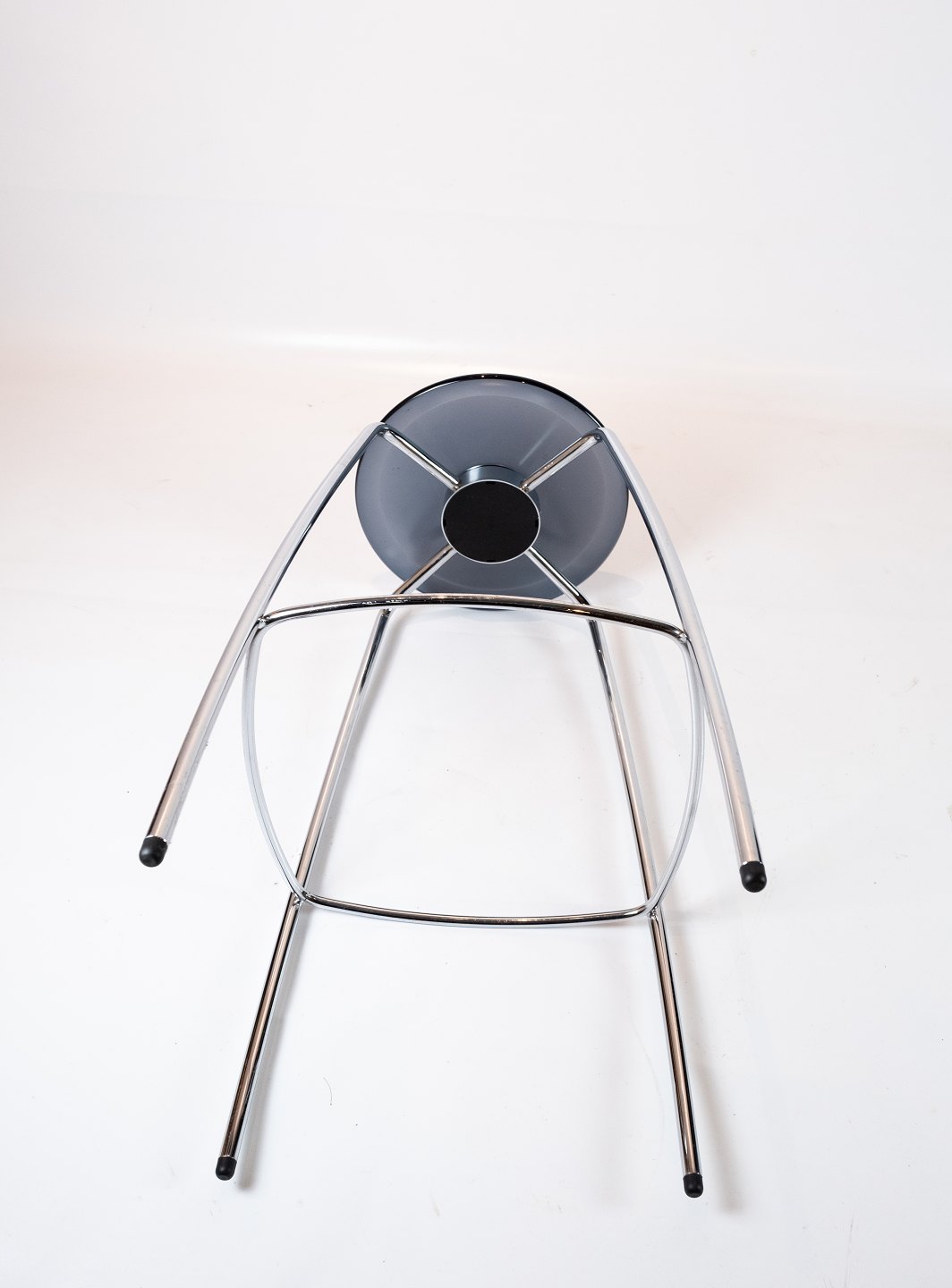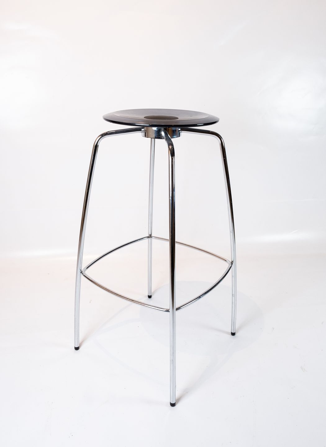 Bar stool with seat in black plastic and metal frame. A minimalist yet elegant piece of furniture, perfect for any modern interior.
