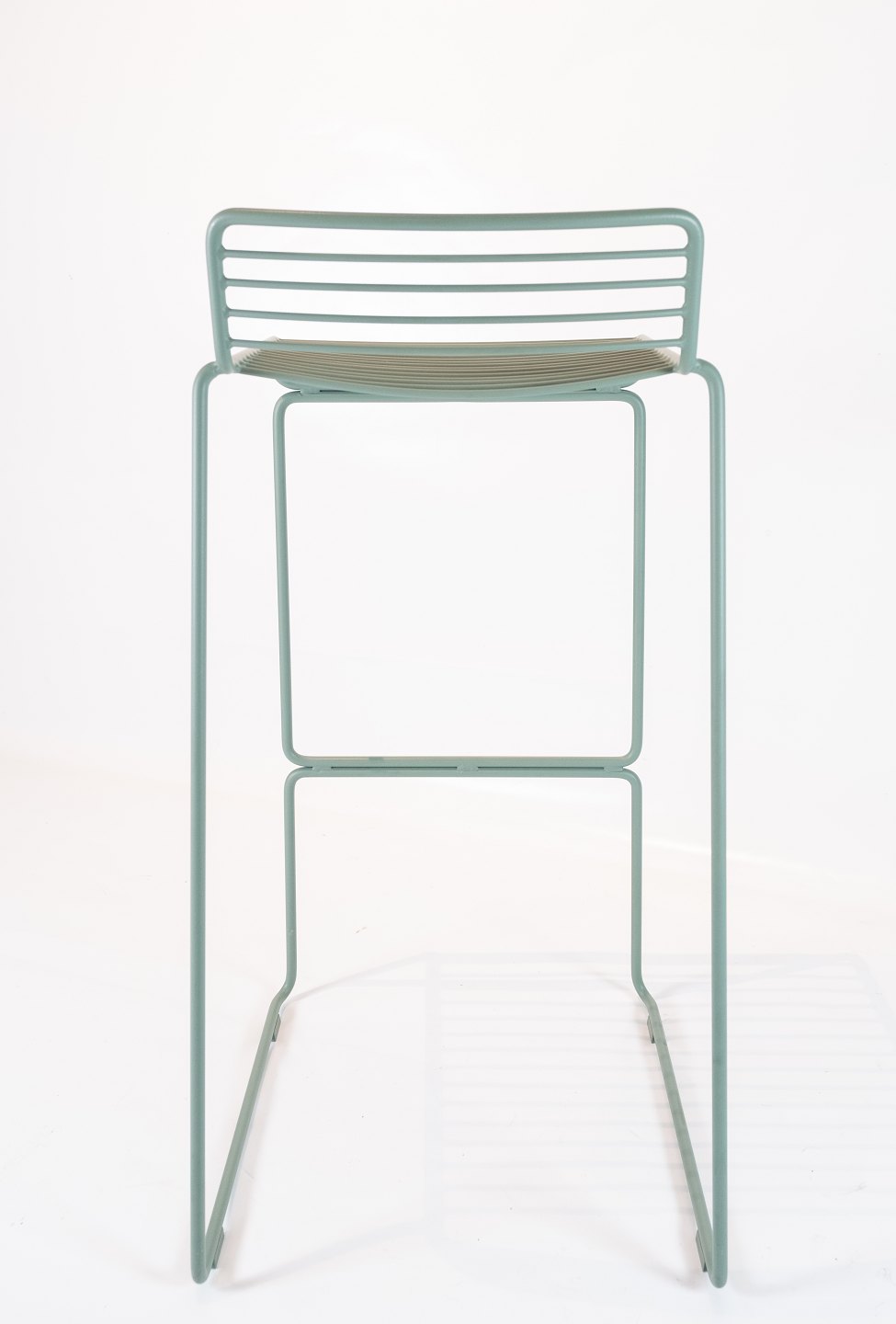 Et par barstole, model Hee, med metalstel i lakeret lyseblåt, produceret af HAY. Disse barstole er et perfekt eksempel på moderne skandinavisk design, der kombinerer funktionalitet med enkel elegance.
