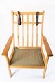 En høj lænestol i eg og rødt uldstof, designet af den legendariske danske møbelarkitekt Hans J. Wegner og fremstillet af Getama i 1960'erne.
