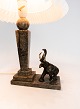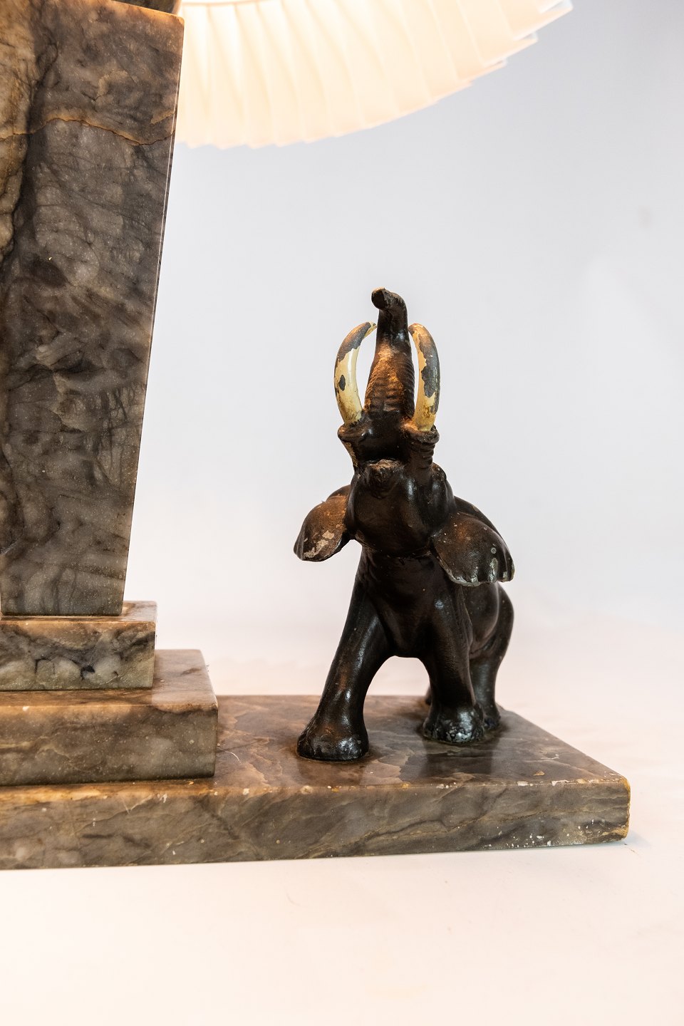 Table lamp made of marble with decorativ elephant. The shade is handpainted and handfolded of paper.