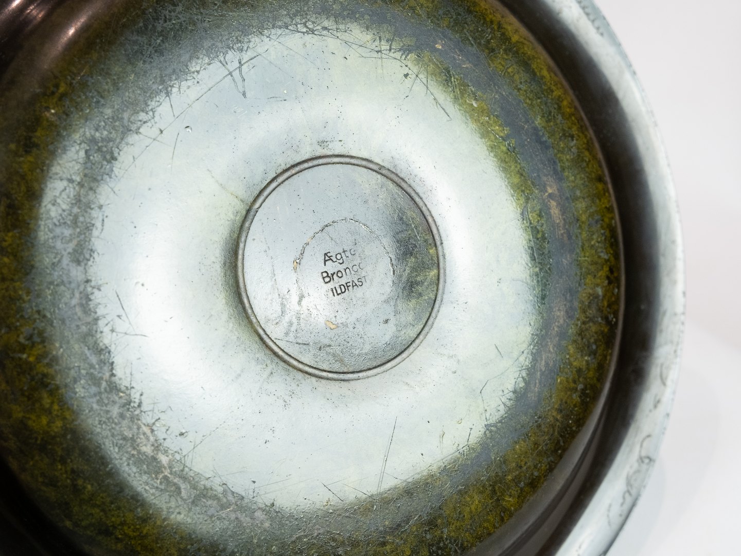 Rundt fad af bronze dekoreret med drengefigur. Fadet er i flot brugt stand.