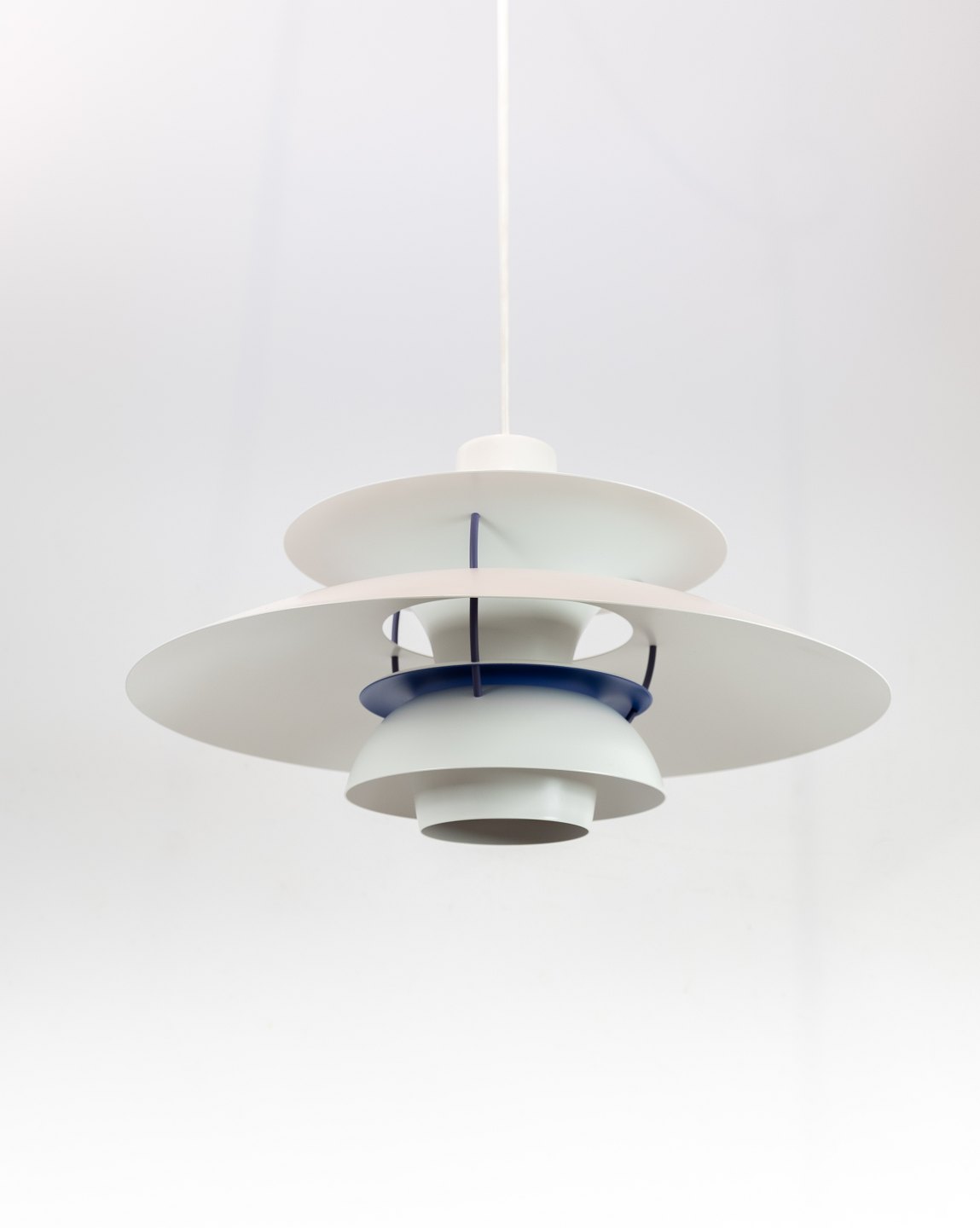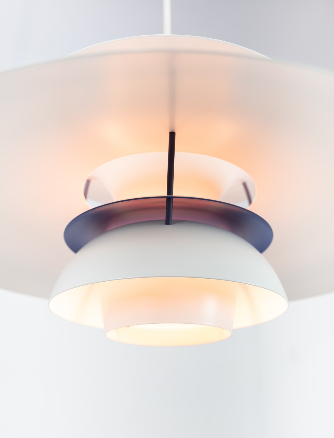 PH5 lamp designed by Poul Henningsen in 1958 and manufactured by Louis Poulsen. The lamp has lacquered metal shades in white and a newer model.