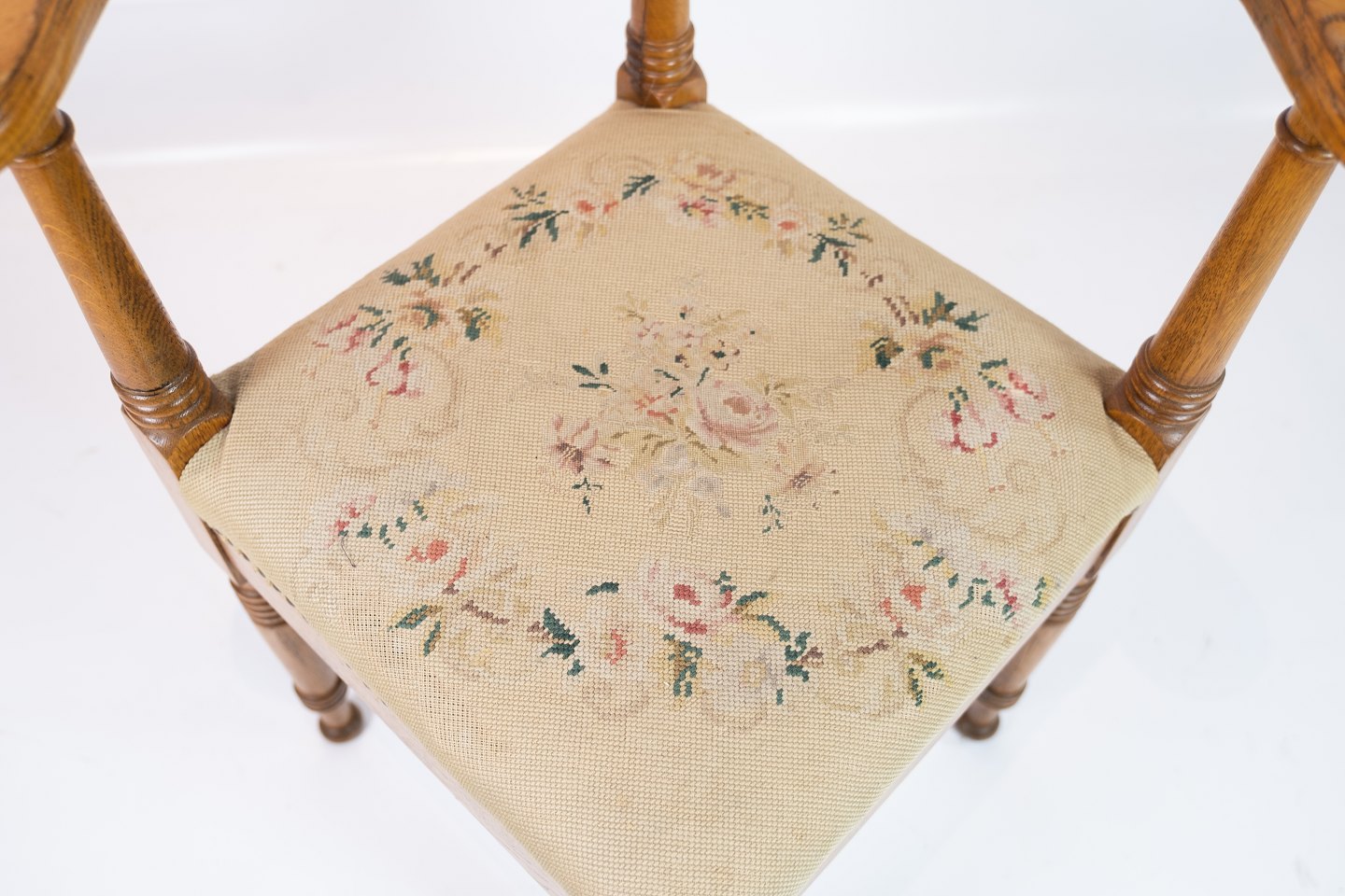 Armchair in polished oak and upholstered with light embroided fabric from the 1910s. The chair is in great antique condition.