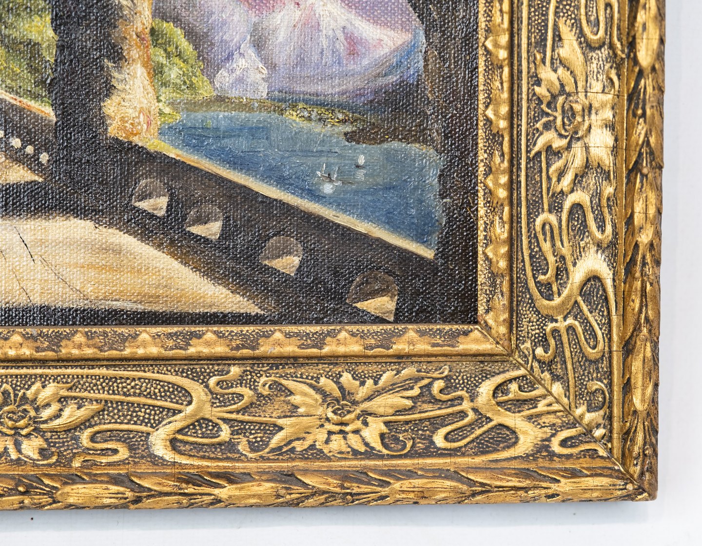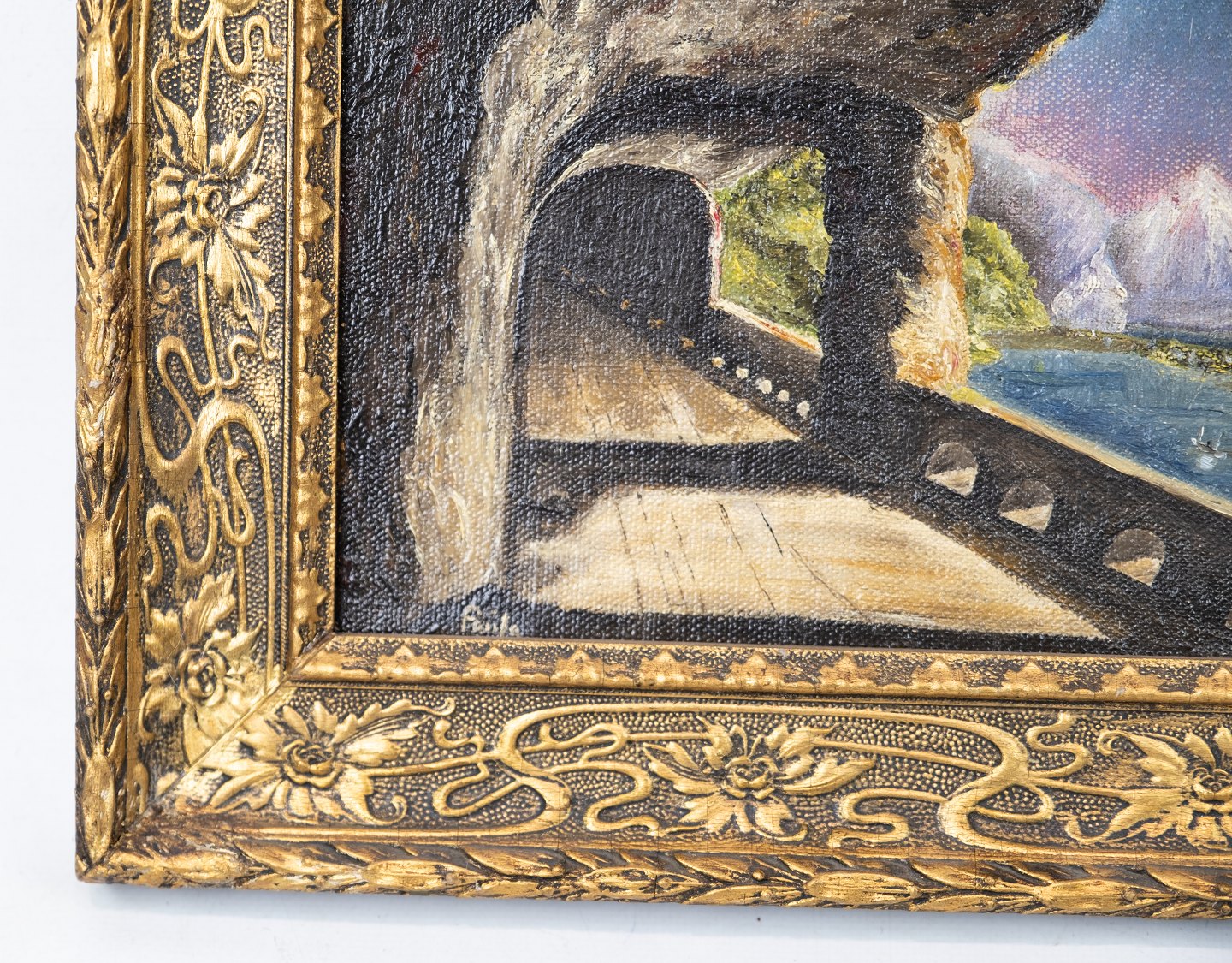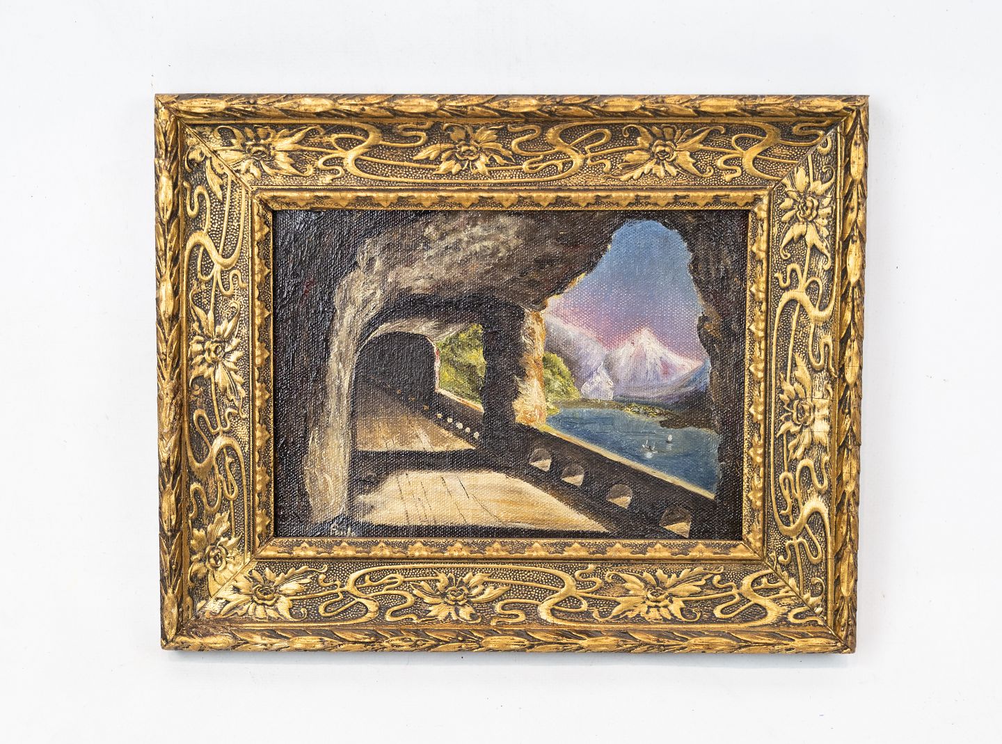 Oliemaleri med motiv af tunnel og med forgyldt ramme.