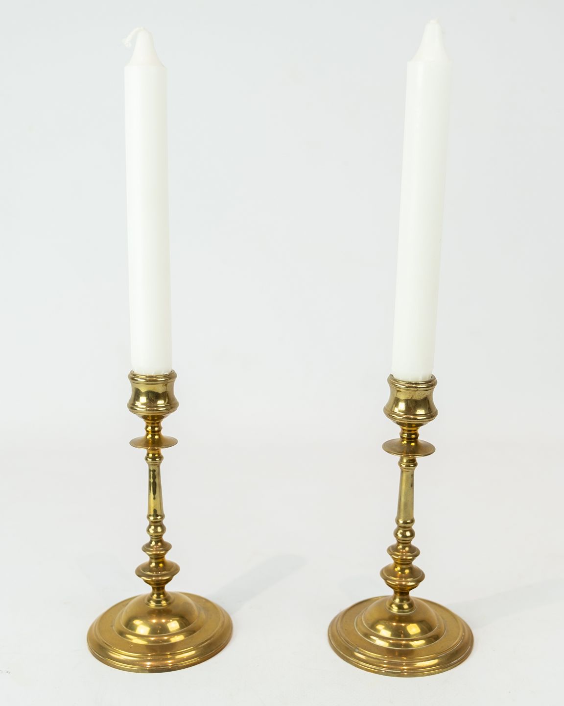 Et sæt lysestager i messing, i flot brugt stand og i jugend stil fra 1920erne.