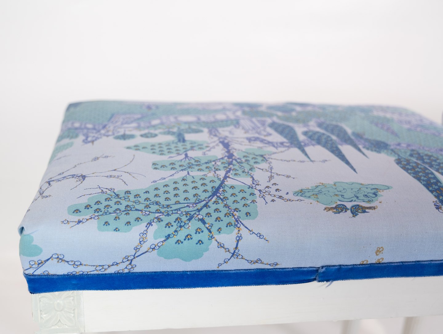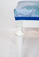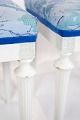 A pair of antique stools of white painted wood and upholstered with blue fabric from the 1920s.