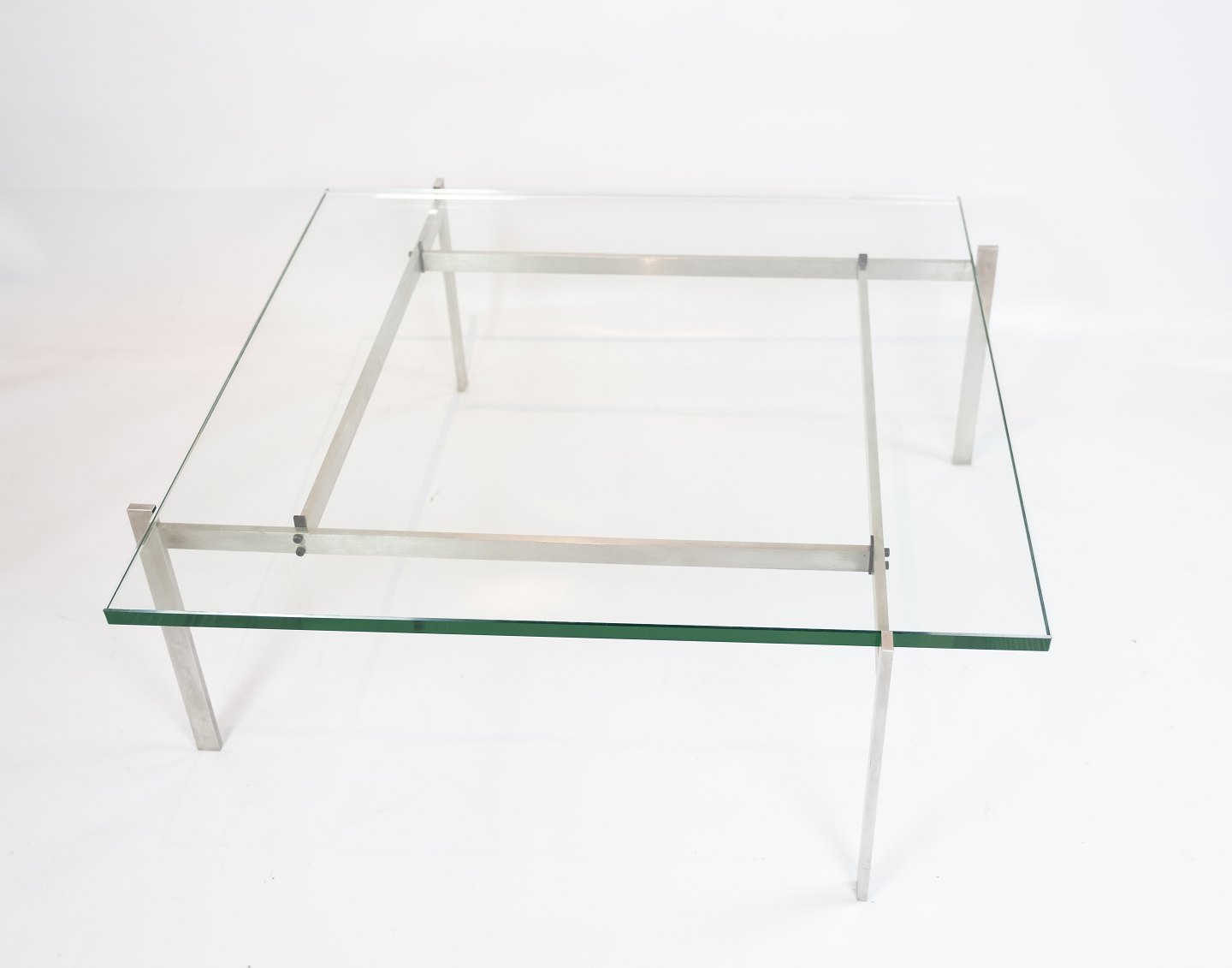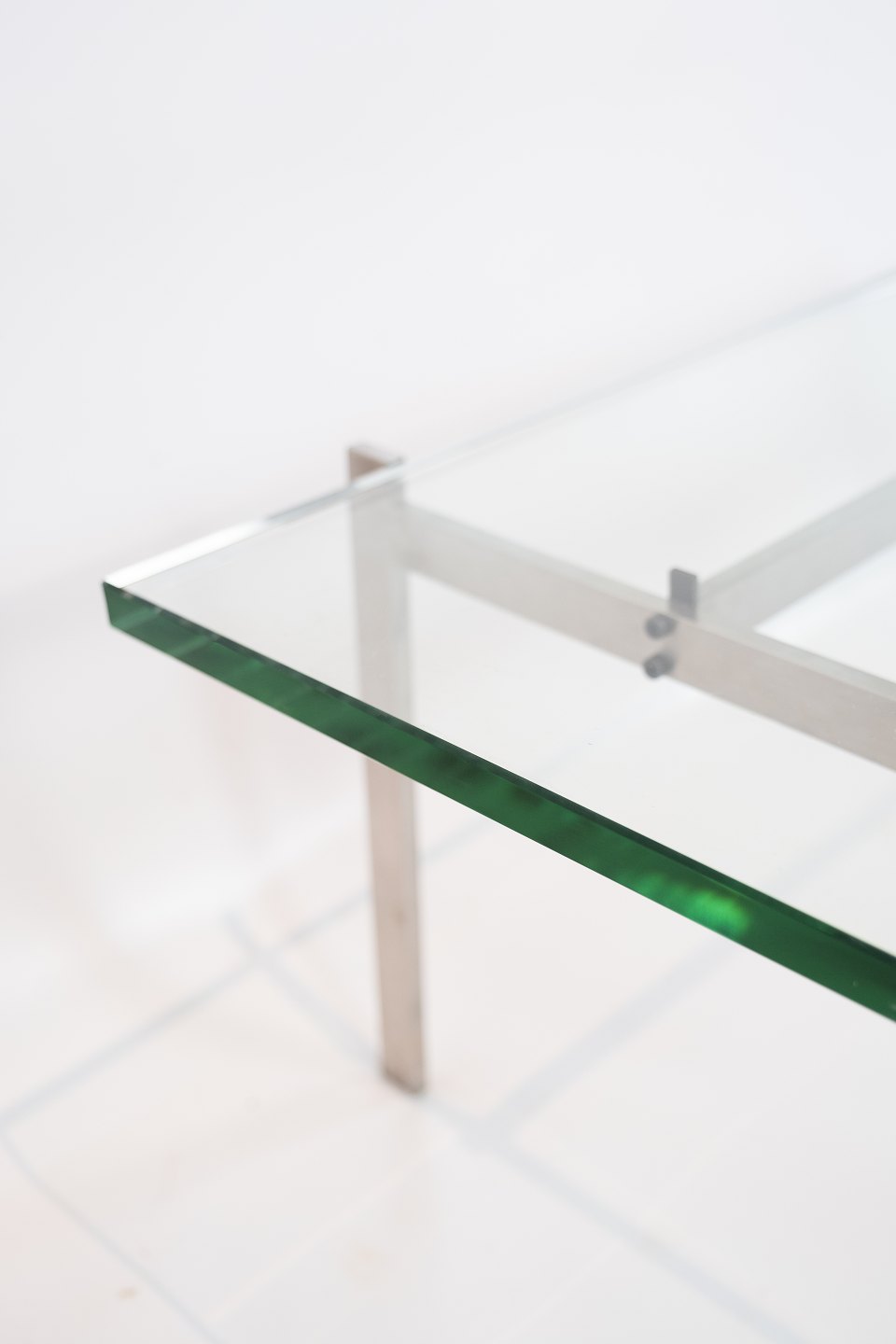 Coffee table, model PK61, of glass and stainless steel designed by Poul Kjærholm and Manufactured by Fritz Hansen.