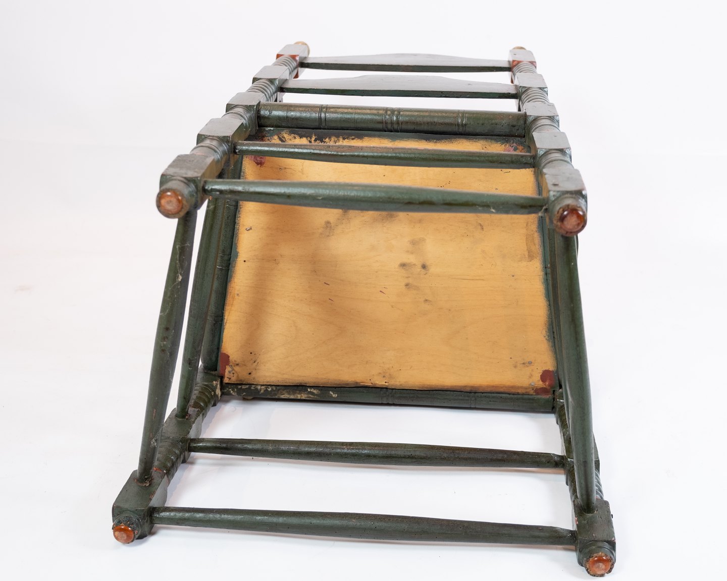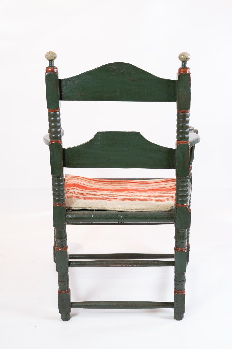 Antique green painted armchair upholstered with striped fabric. The chair is in great vintage condition from 1872.