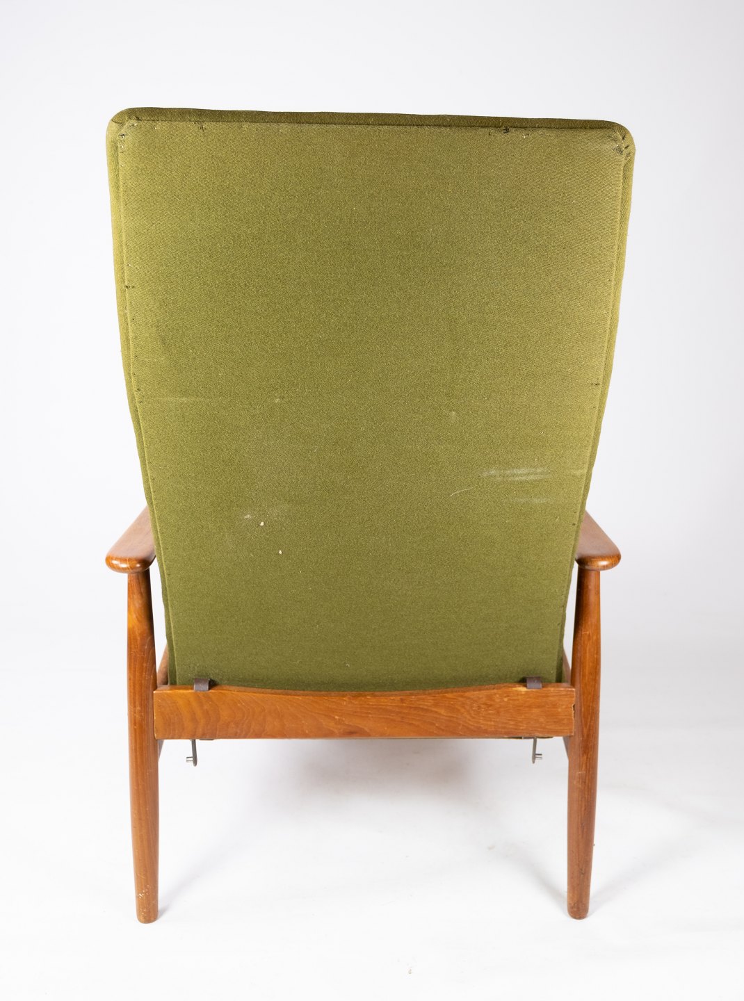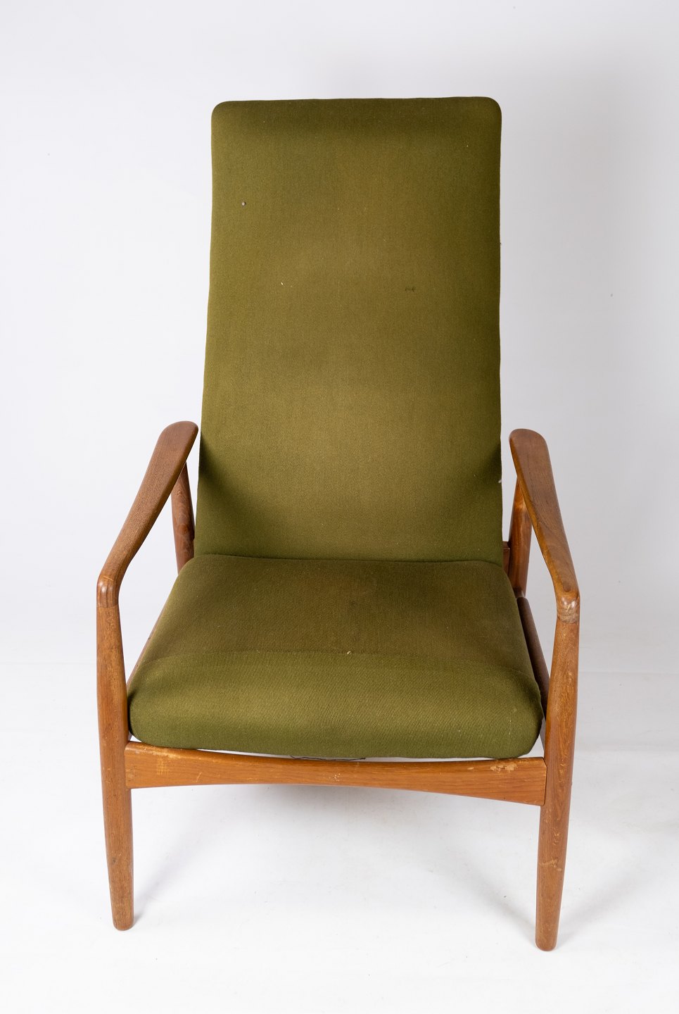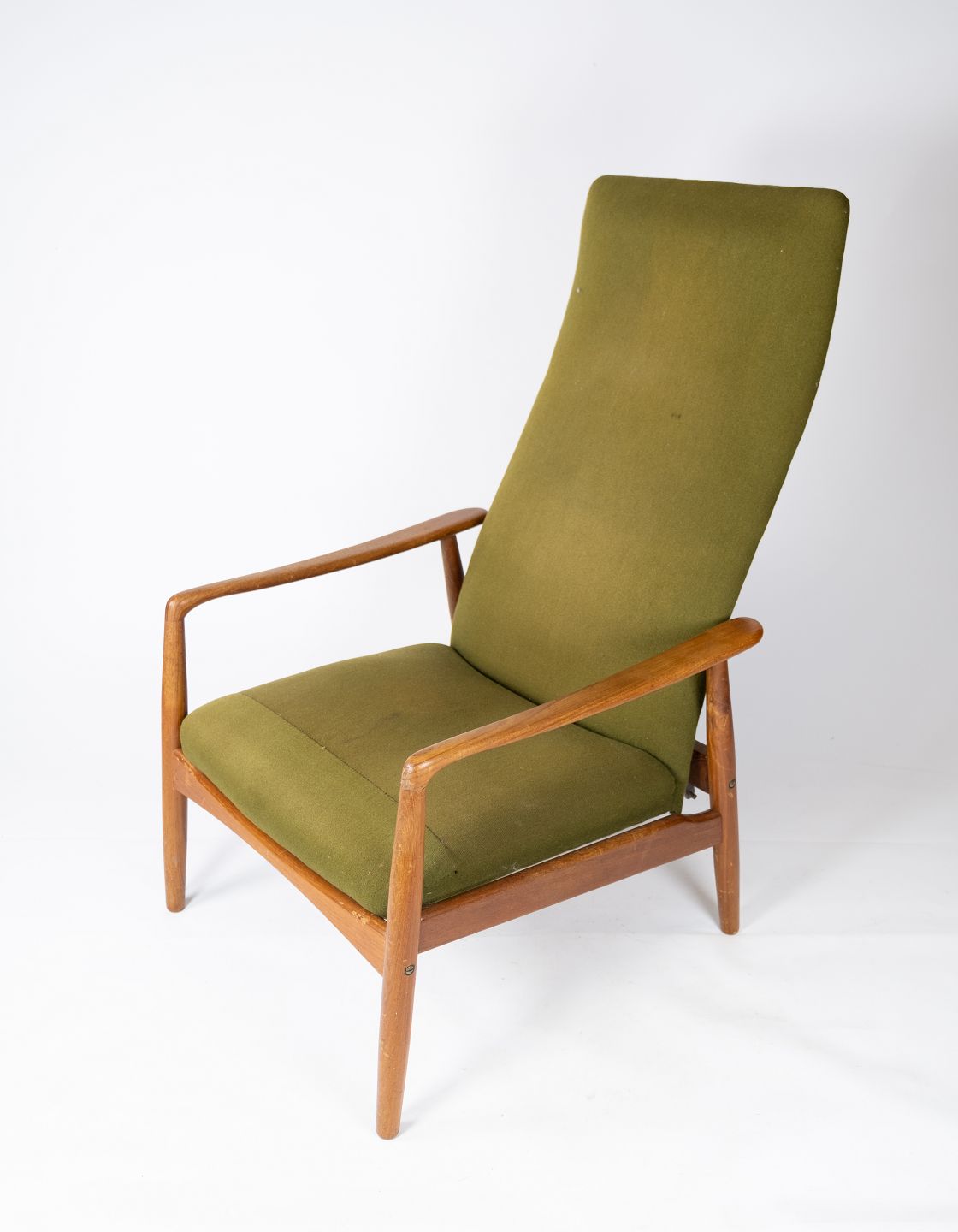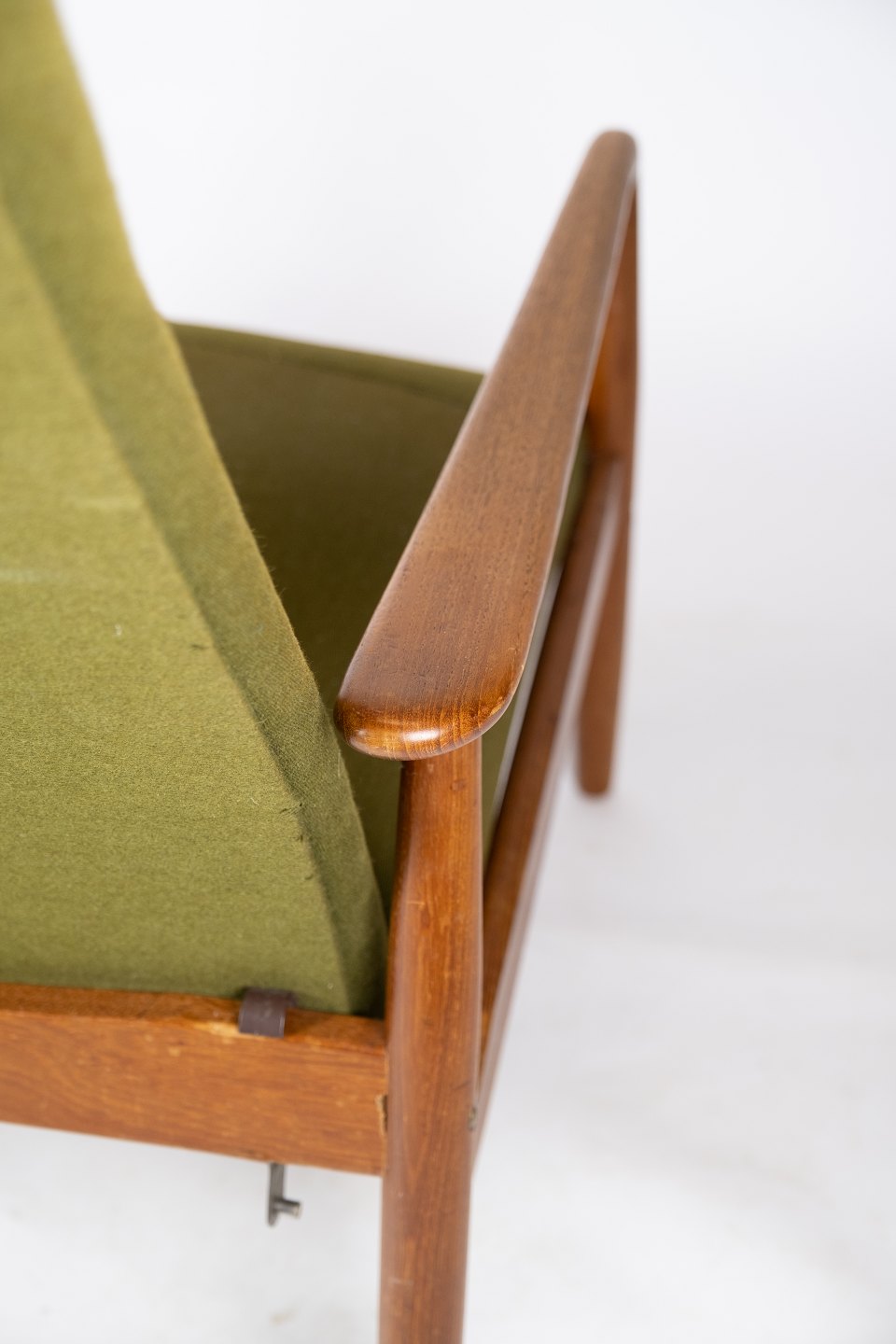 Denne hvilestol, designet af Alf Svensson og fremstillet af Fritz Hansen i 1960'erne, er et eksempel på tidløs elegance og komfort. Stolen er konstrueret i teaktræ og polstret med grønt stof, hvilket giver den et smukt og indbydende udseende.