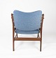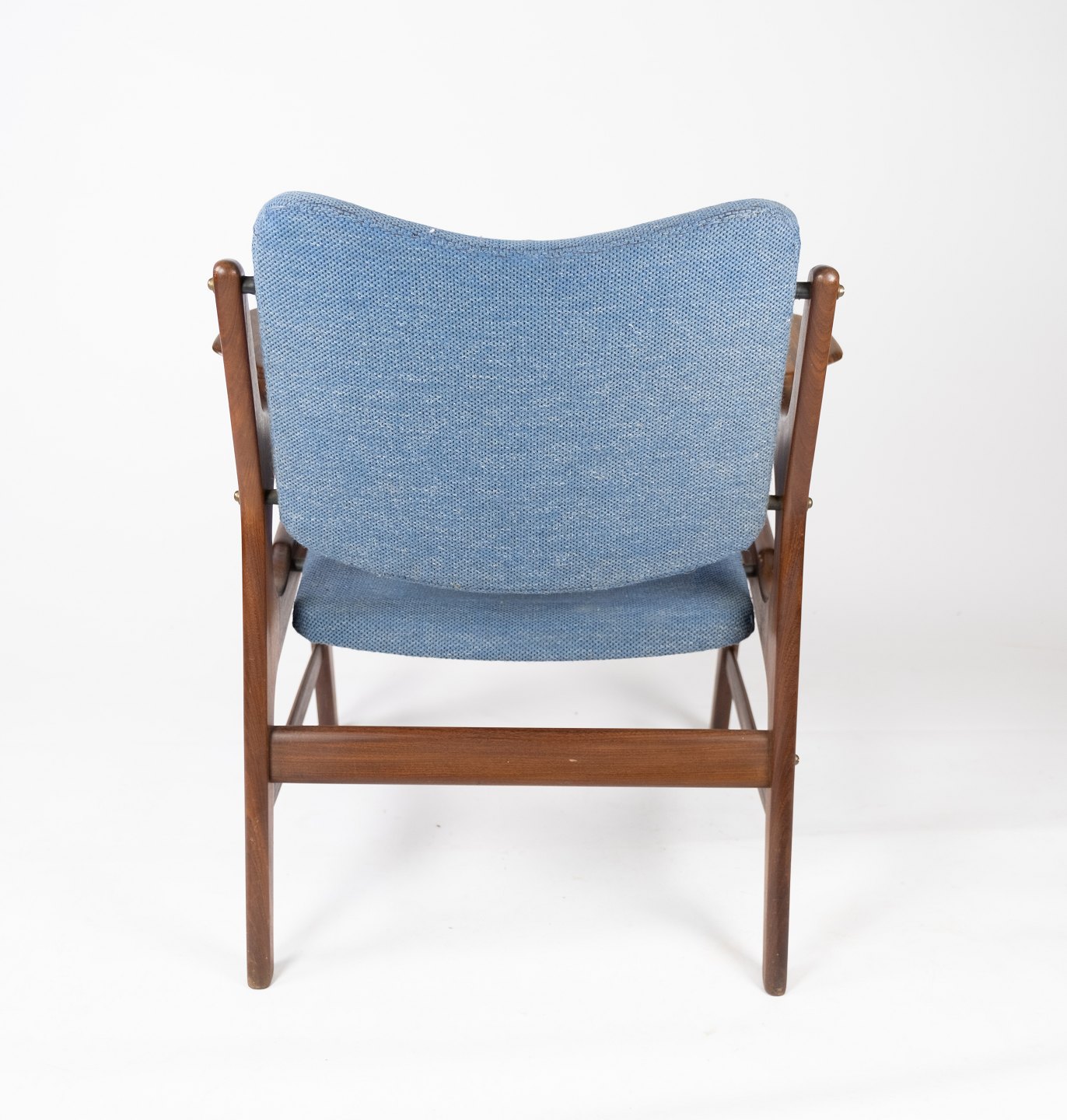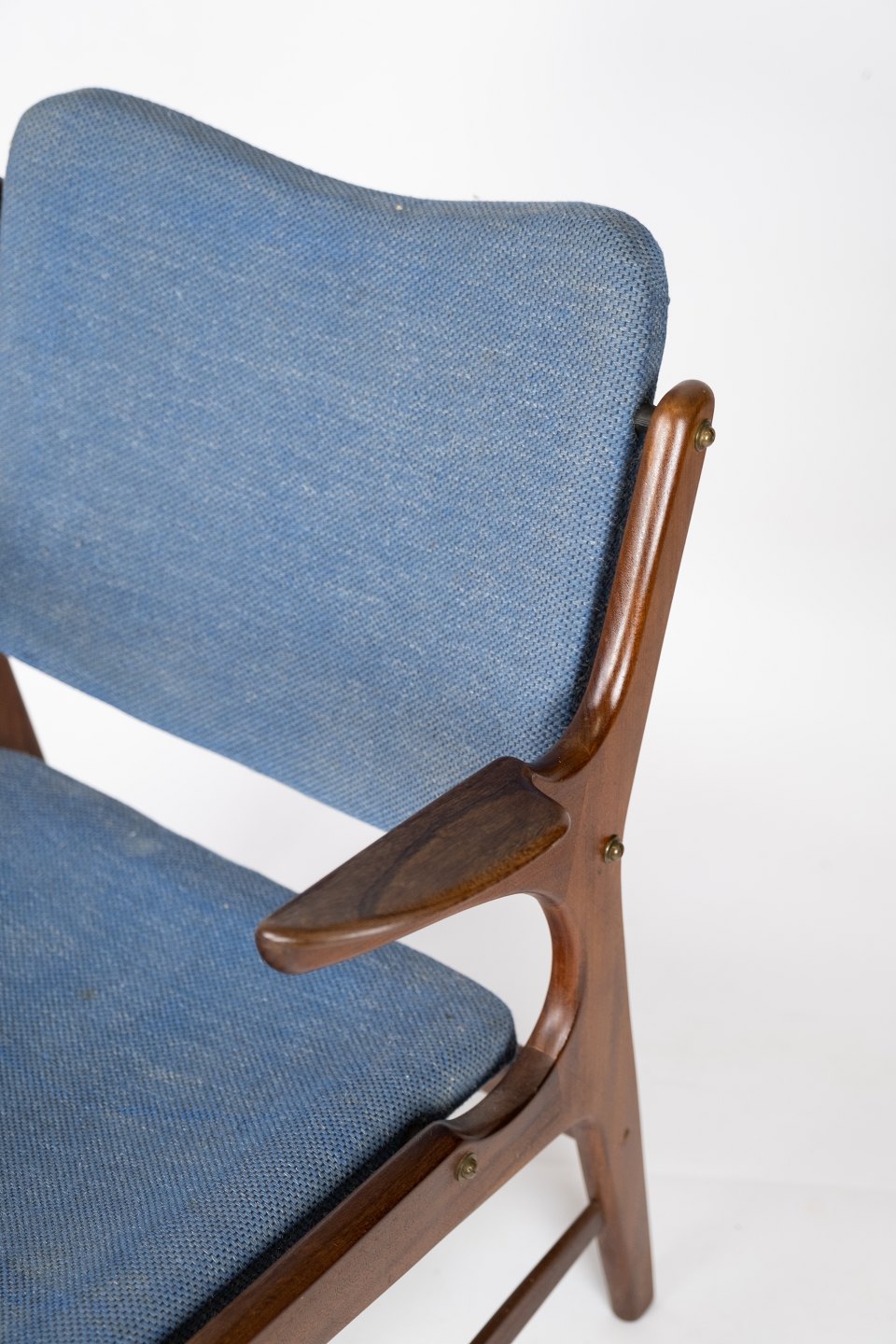 Armchair in teak and blue fabric, designed by Arne Hovmand Olsen in the 1960s, is a distinctive piece of furniture with a timeless aesthetic. The chair is a beautiful example of the Danish design tradition and is known for its simple elegance and comfortable design.