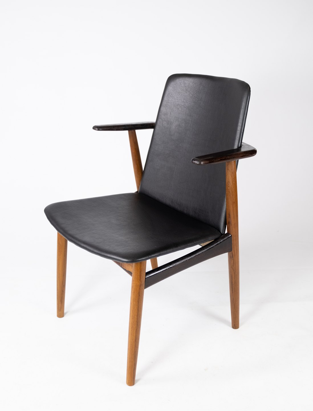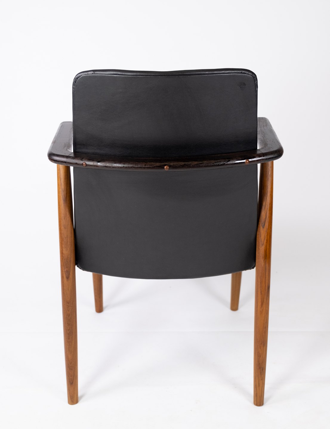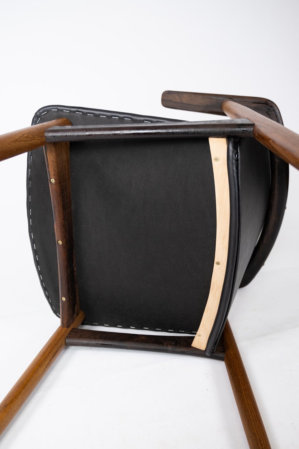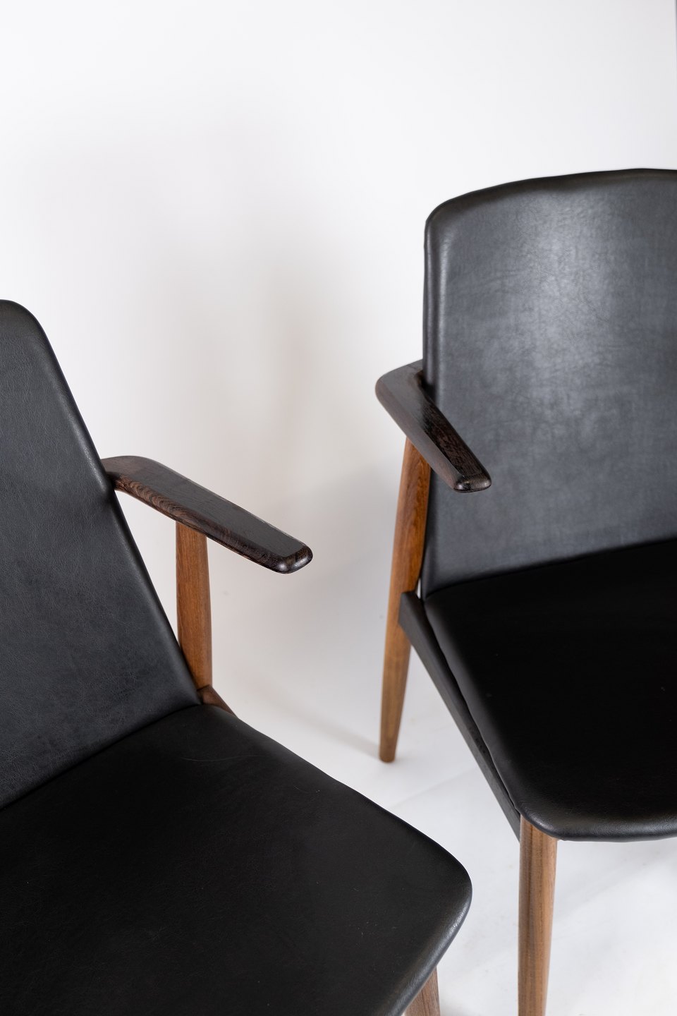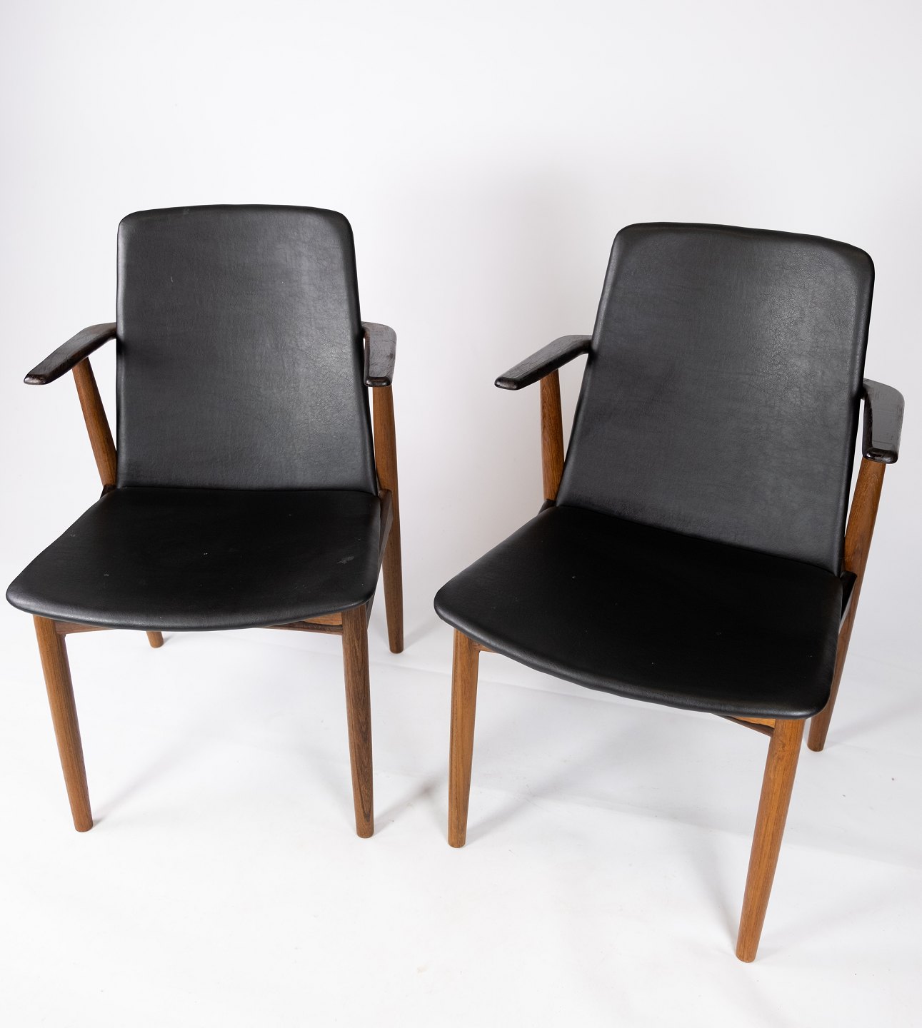 Dette par armstole i klassisk sort læder og teak, designet af Hans Olsen fra 1960'erne, udstråler en tidløs elegance og enestående håndværk. Stolene er ikke kun funktionelle, men også et smukt eksempel på dansk designarv, der vil tilføre enhver indretning en sofistikeret og stilfuld atmosfære.