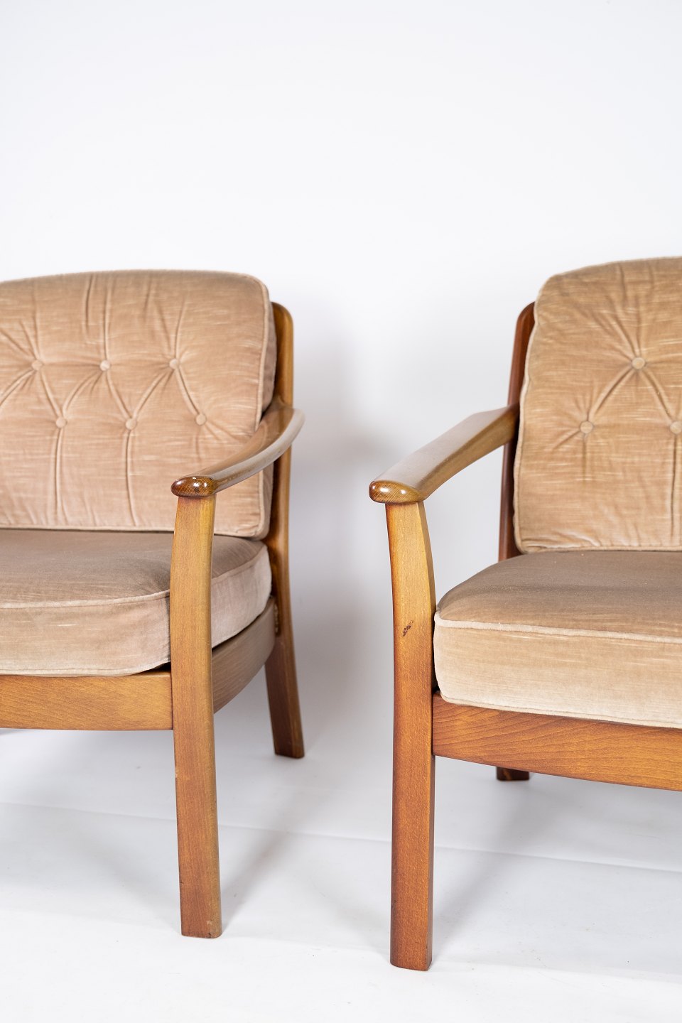 Dette sæt hvilestole i poleret træ og hynder i velour, fra 1960'erne, er et smukt udtryk for dansk håndværk og æstetik. Med deres elegante design og luksuriøse polstring er disse stole både behagelige og stilfulde.