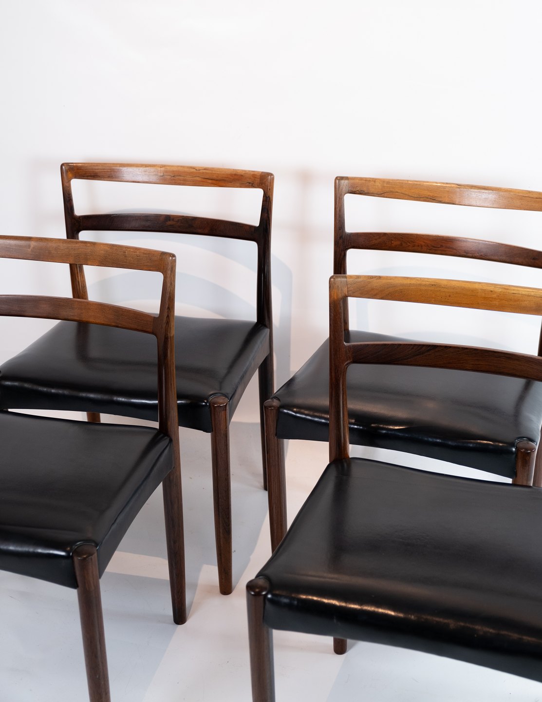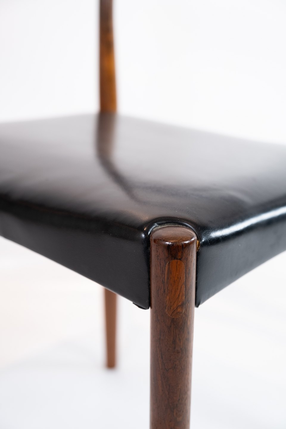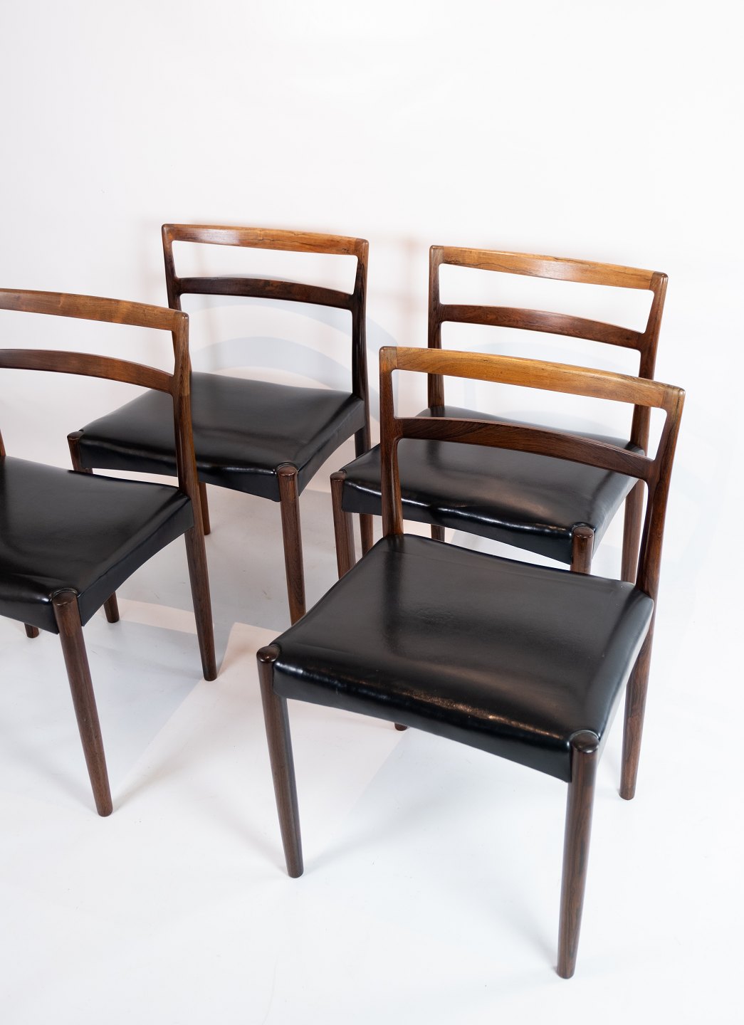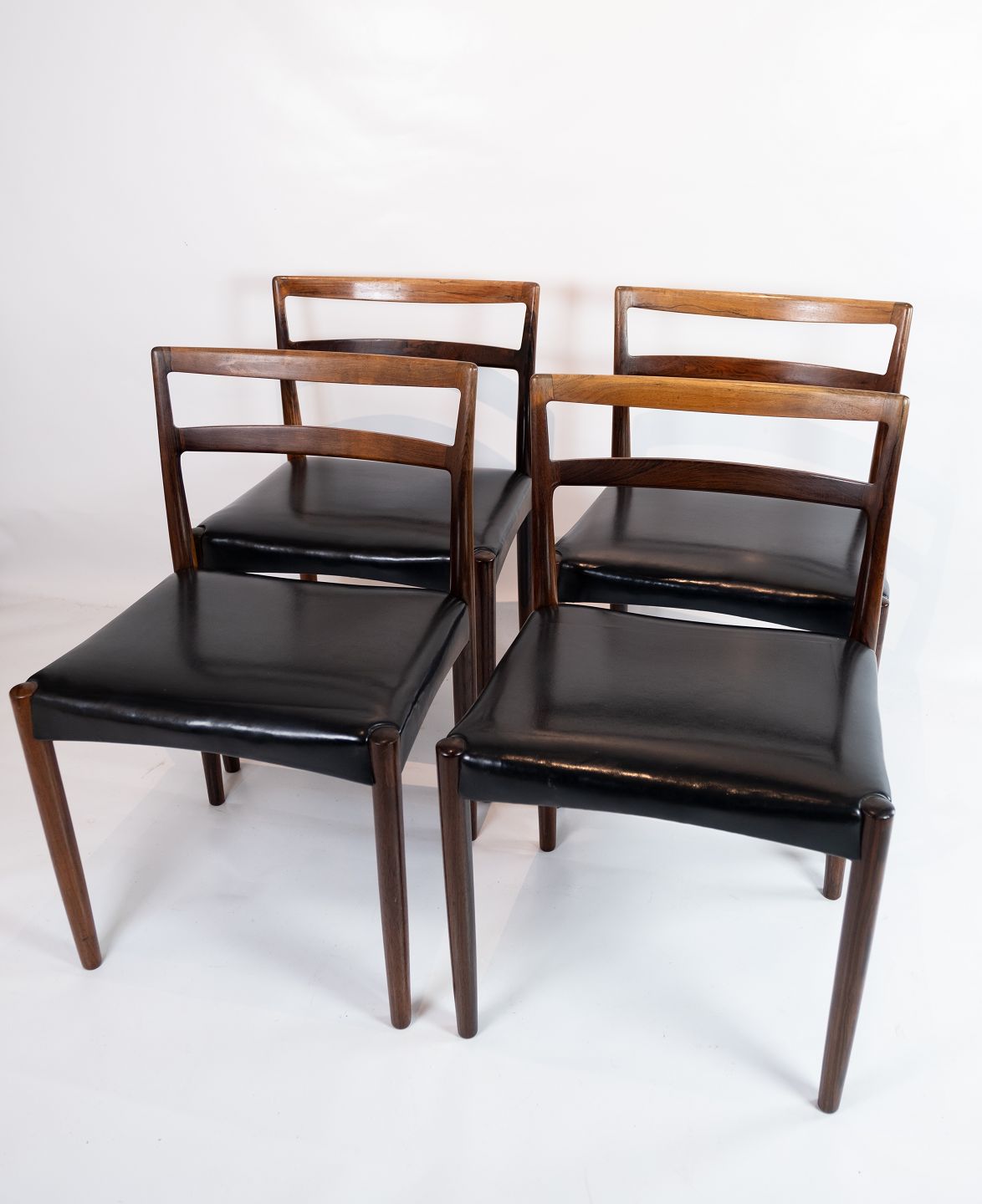 This set of four dining chairs in rosewood and black leather, from the 1960s, is a beautiful expression of the aesthetics of this period. The chairs combine elegance and functionality and will add a timeless charm to any dining room.