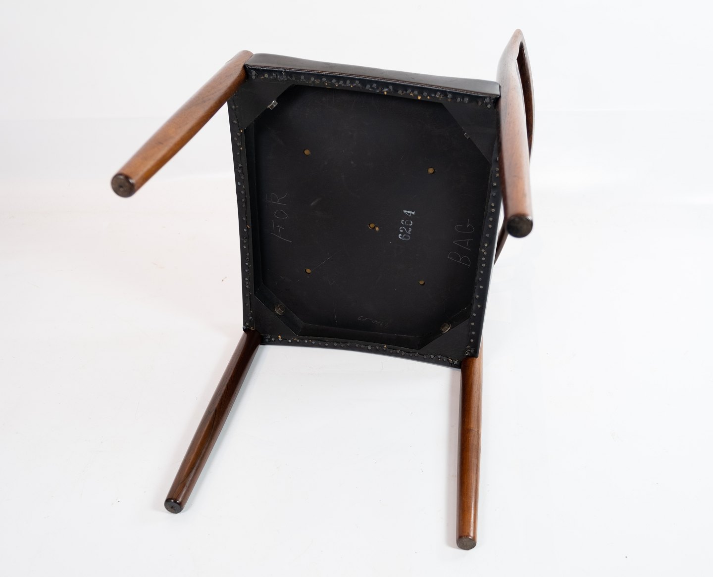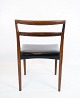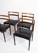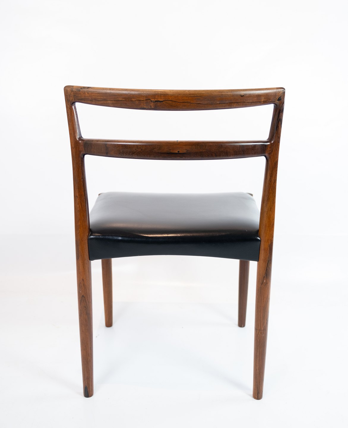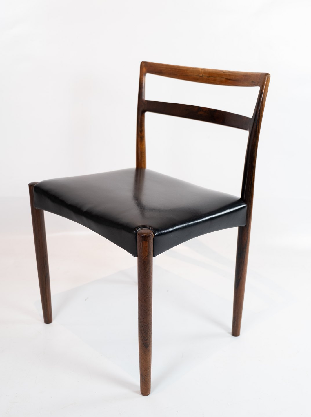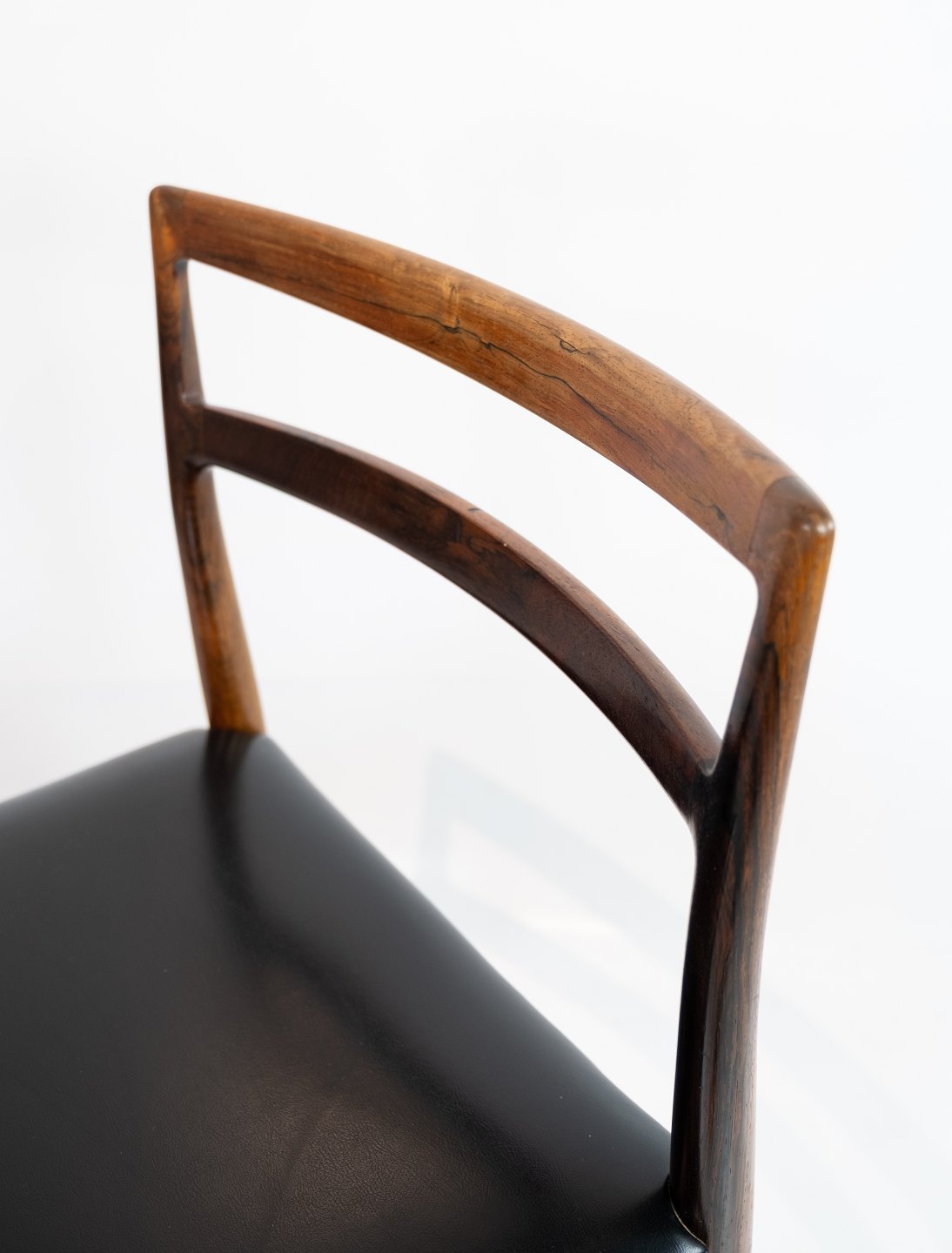 This set of four dining chairs in rosewood and black leather, from the 1960s, is a beautiful expression of the aesthetics of this period. The chairs combine elegance and functionality and will add a timeless charm to any dining room.