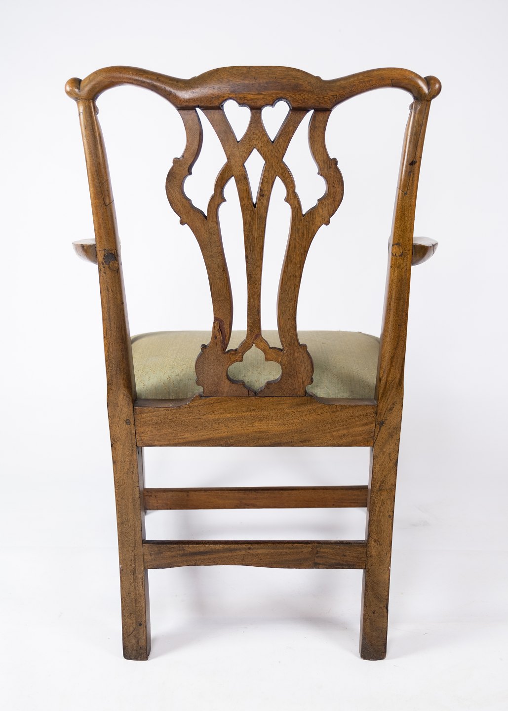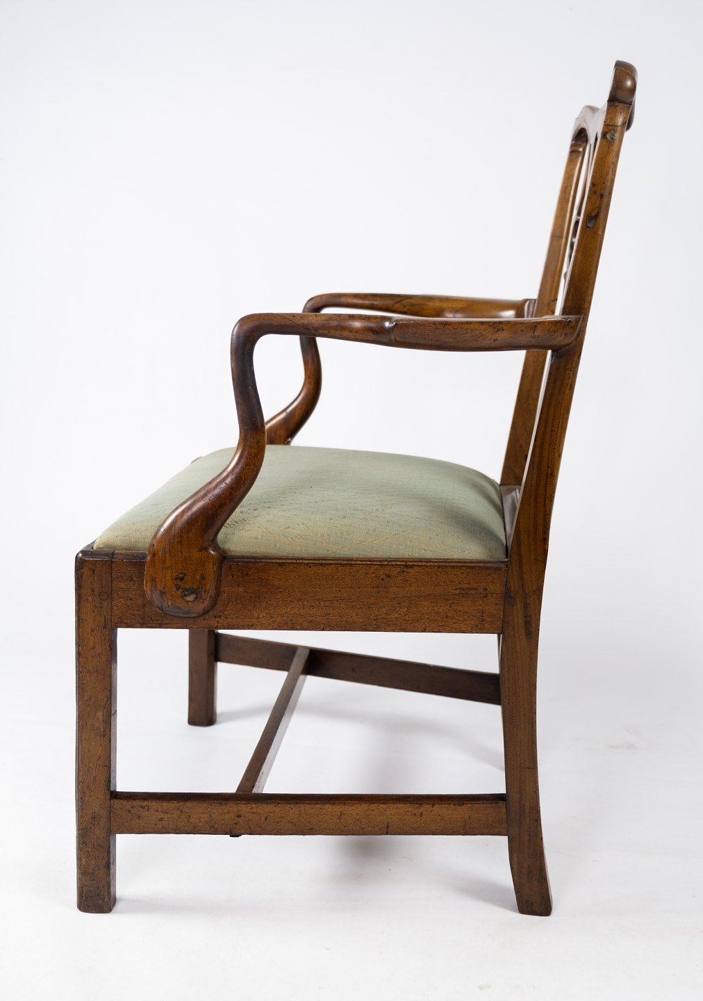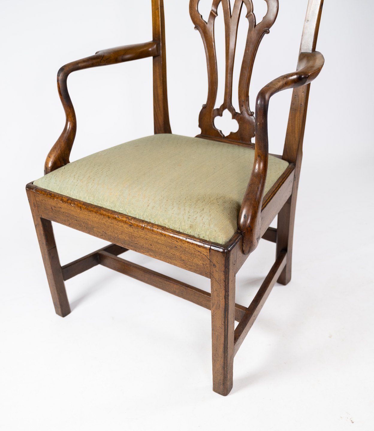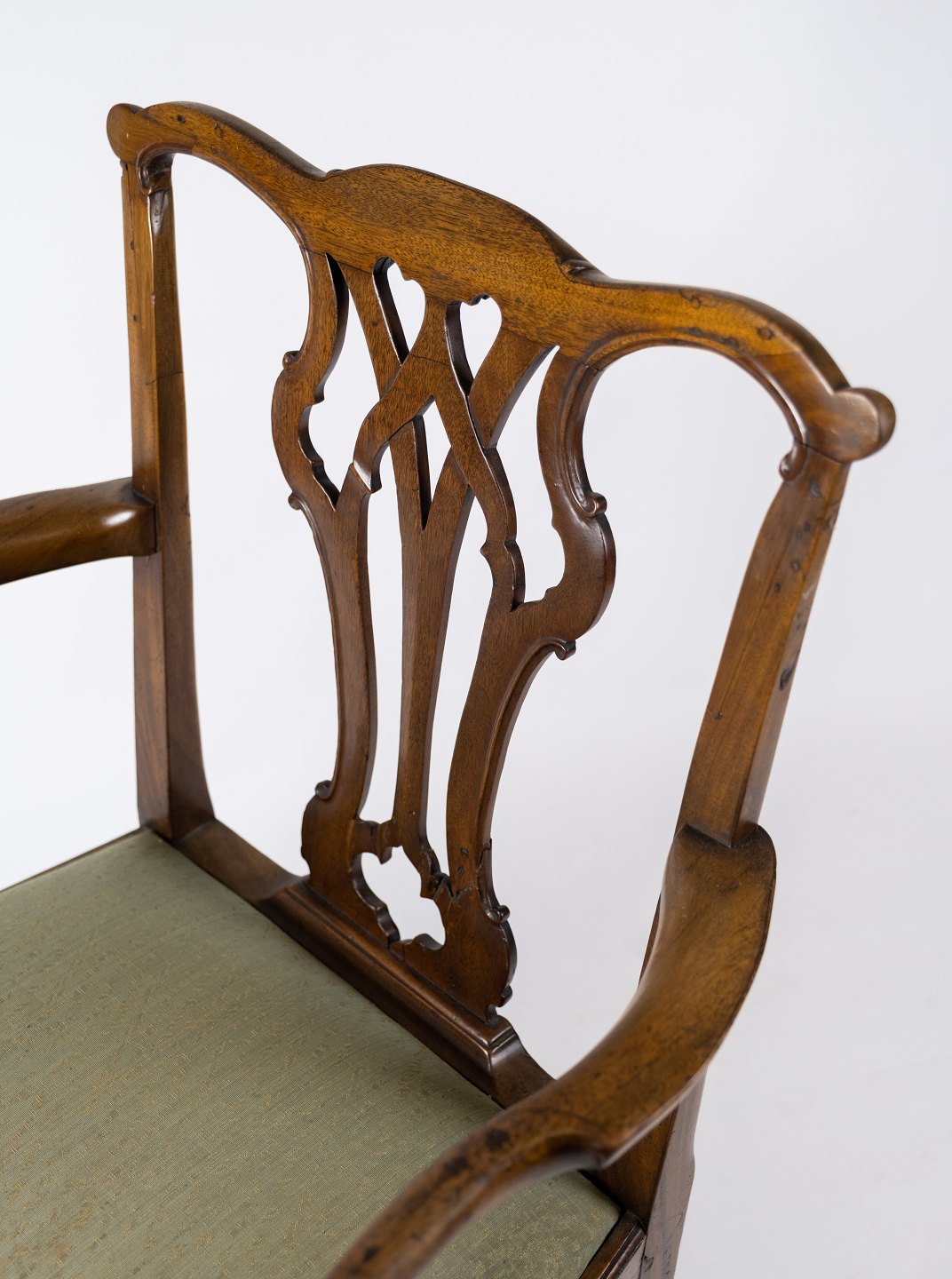 Antique armchair of light mahogany and upholstered with green wool fabric from the 1890s. The chair is in great vintage condition.