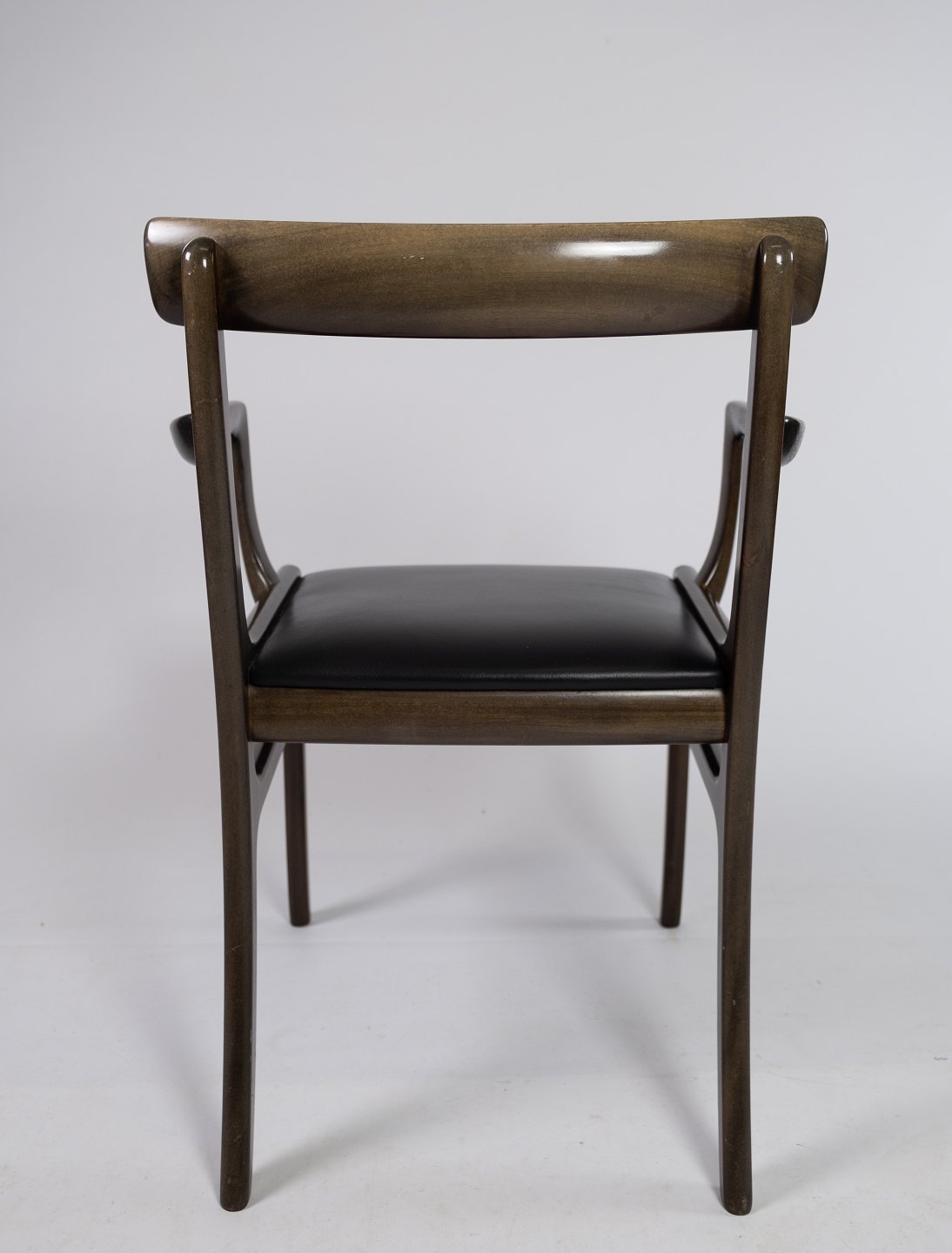 Et par Rungstedlund armstole, fremstillet af mahogni og beklædt med sort læder, er et strålende eksempel på Ole Wanschers tidløse design, der kombinerer æstetik og funktionalitet på en sublim måde.