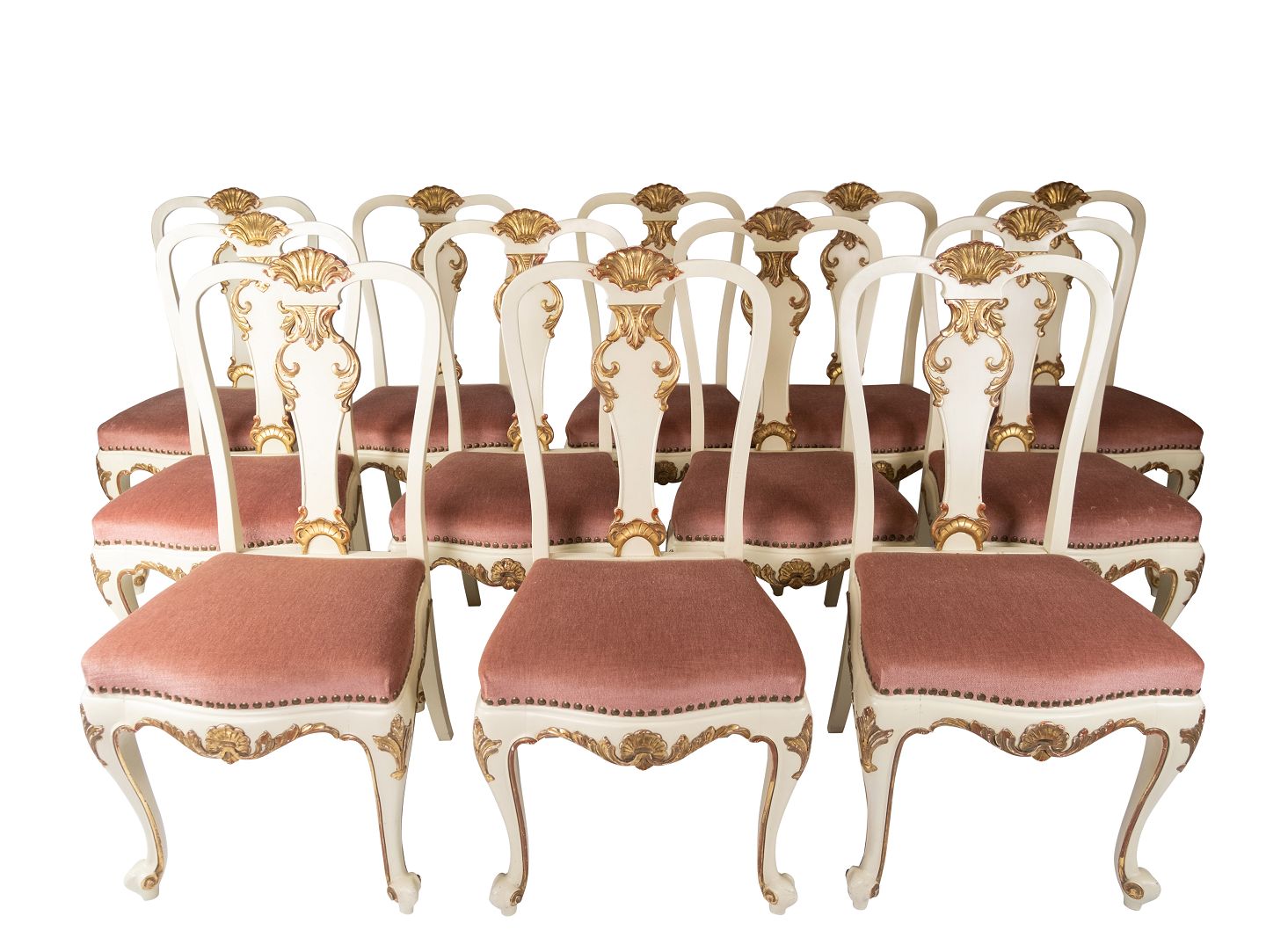 Set of 12 Rococo dining room chairs of white painted wood decorated with leaf gold and upholstered with light pink velvet from the 1890s. The chairs are in great vintage condition.