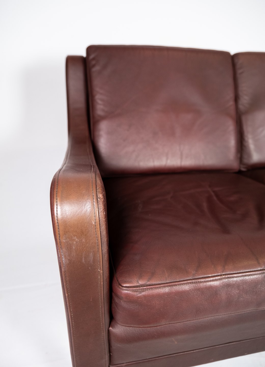 The three-seater sofa in red-brown leather from Stouby Møbler, produced in the 1960s, exudes timeless elegance and comfort. Stouby Møbler, a renowned Danish furniture company, is known for its high quality craftsmanship and timeless designs, and this sofa is an excellent example of their expertise.