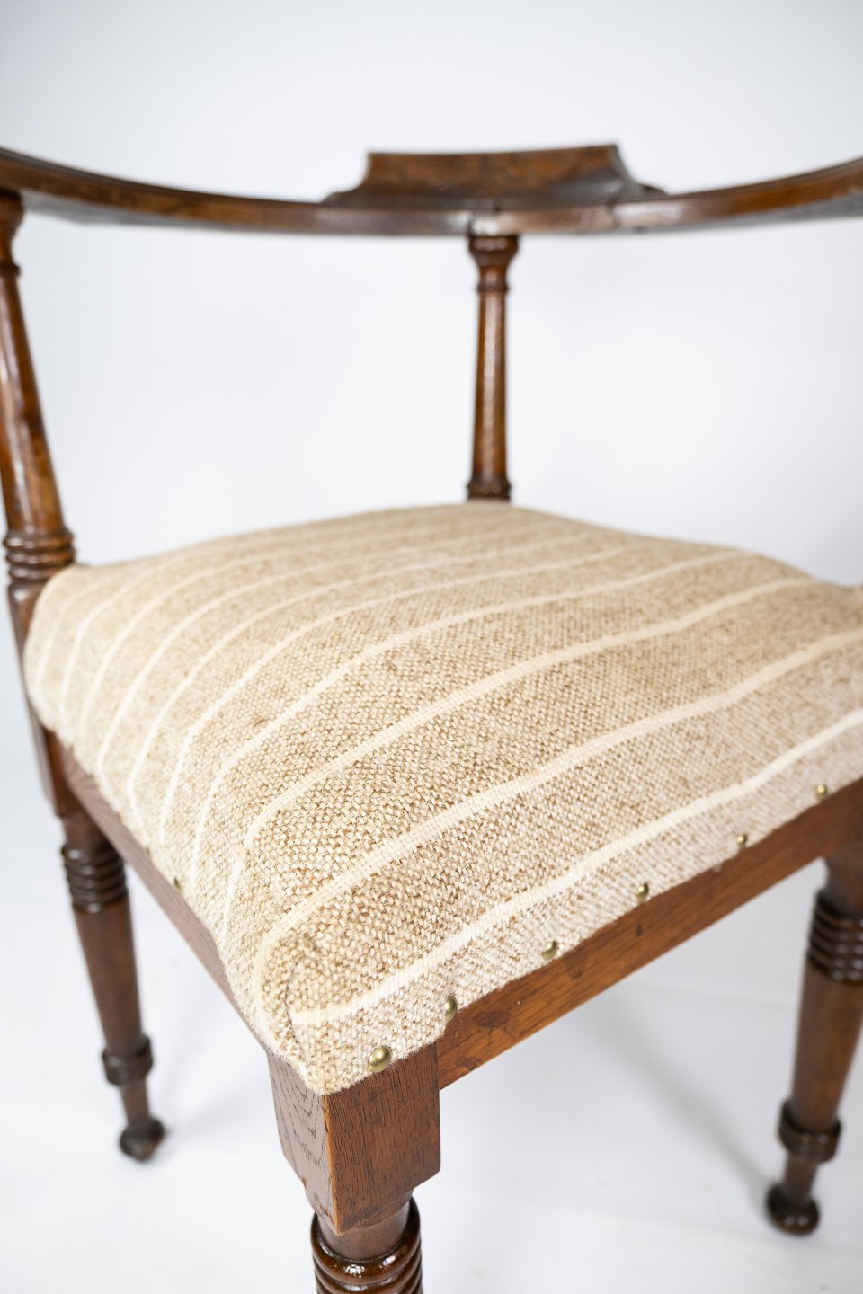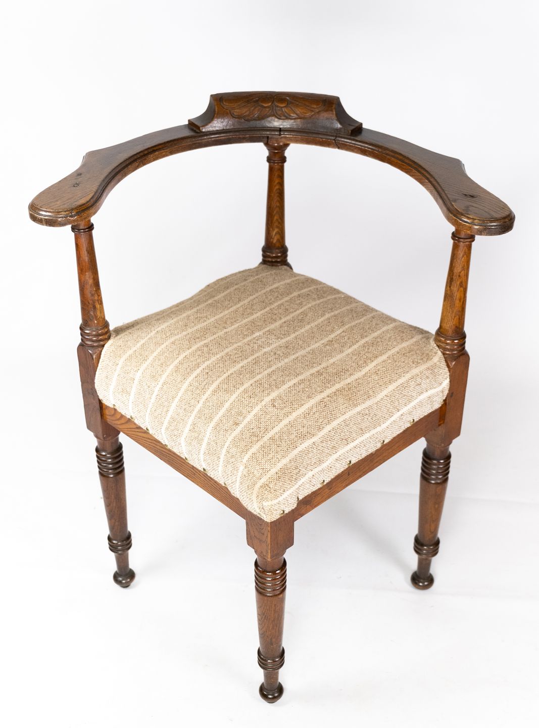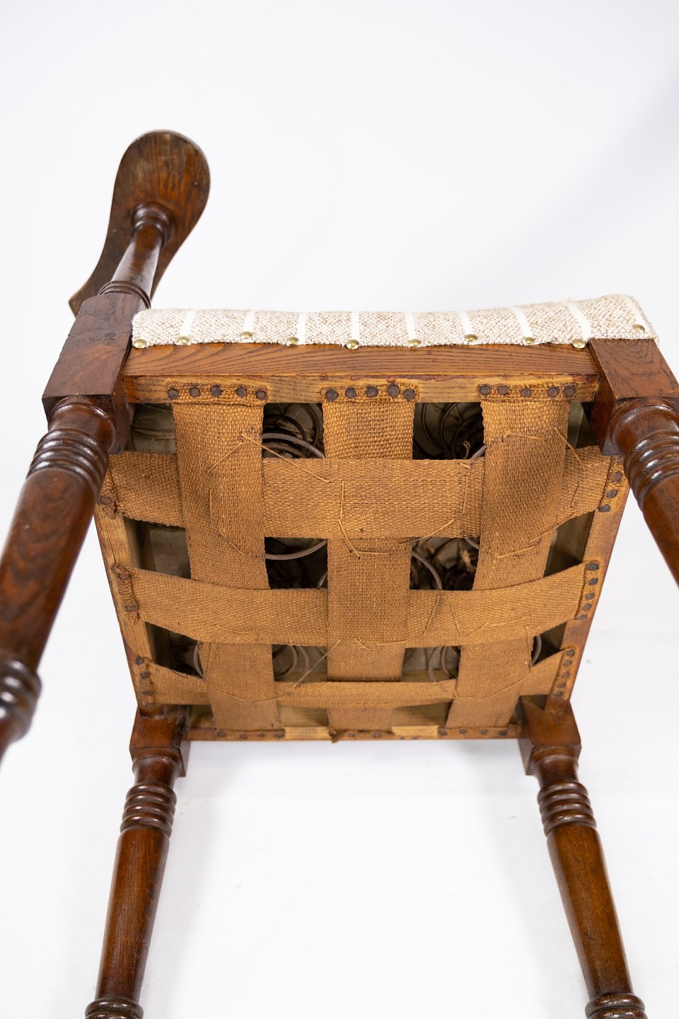Antik armstol af eg og polstret med lyst stof fra 1930erne. Stolen er i flot antik stand.